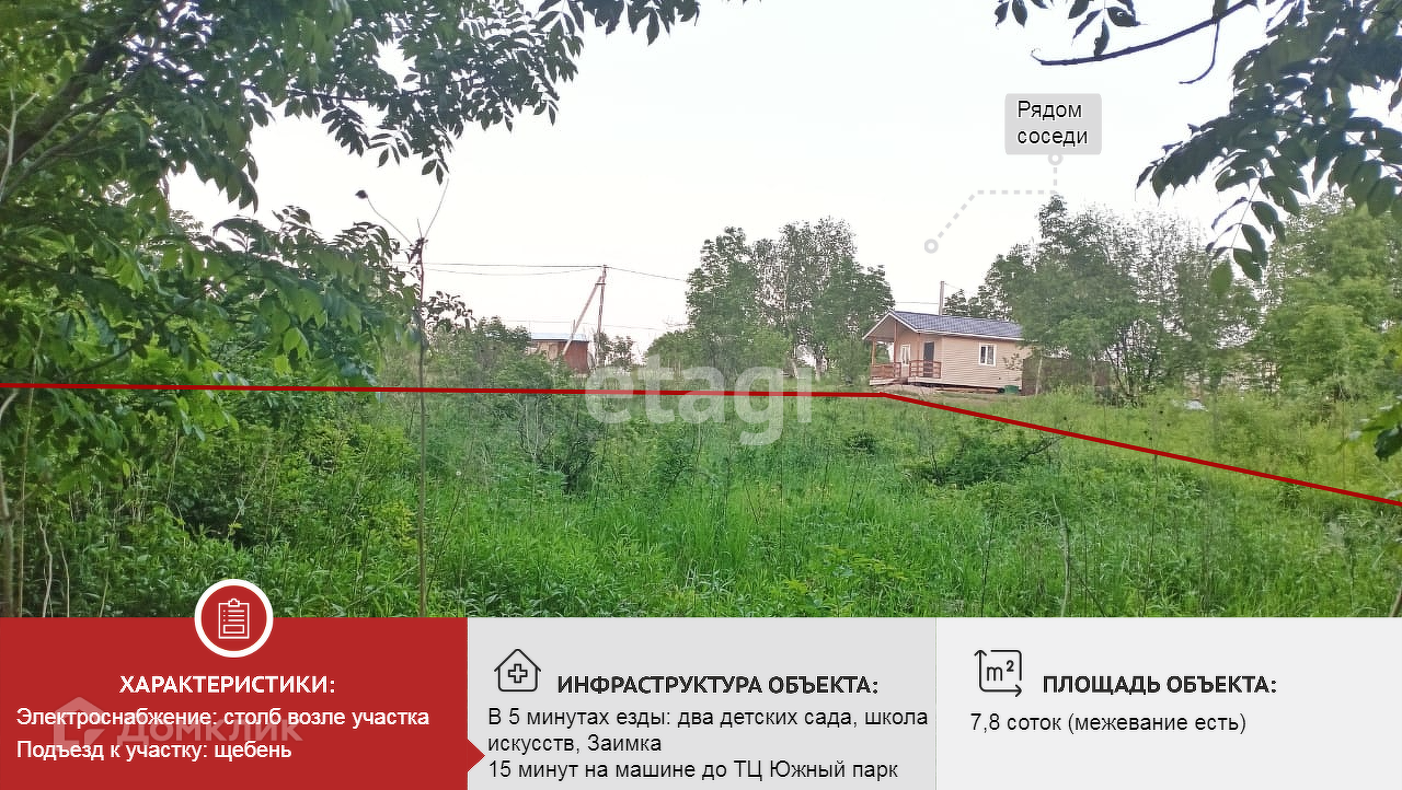 Продается прекрасный участок земли для строительства вашего идеального дома в пяти минутах езды от Заимки. Участок находится в живописном месте СДТ Черемушки села Краснореченское, одним из спокойных населенных пунктов края. Ровный и правильной формы, участок имеет межевание и ждет своего нового владельца. Соседи в этом месте дружелюбные, а природа является идеальной со свежим воздухом круглый год. Участок 7,8 соток земли находится в собственности и не имеет никаких обременений или долгов. Он окружен уже обустроившимися участками. Более того, планируется заведение газа в очереди на благоустройство. Участок подходит под Семейную и Дальневосточную ипотеку на строительство. У нас большой выбор надежных застройщиков малоэтажного строительства. И мы будем рады помочь вам с необходимыми формальностями.