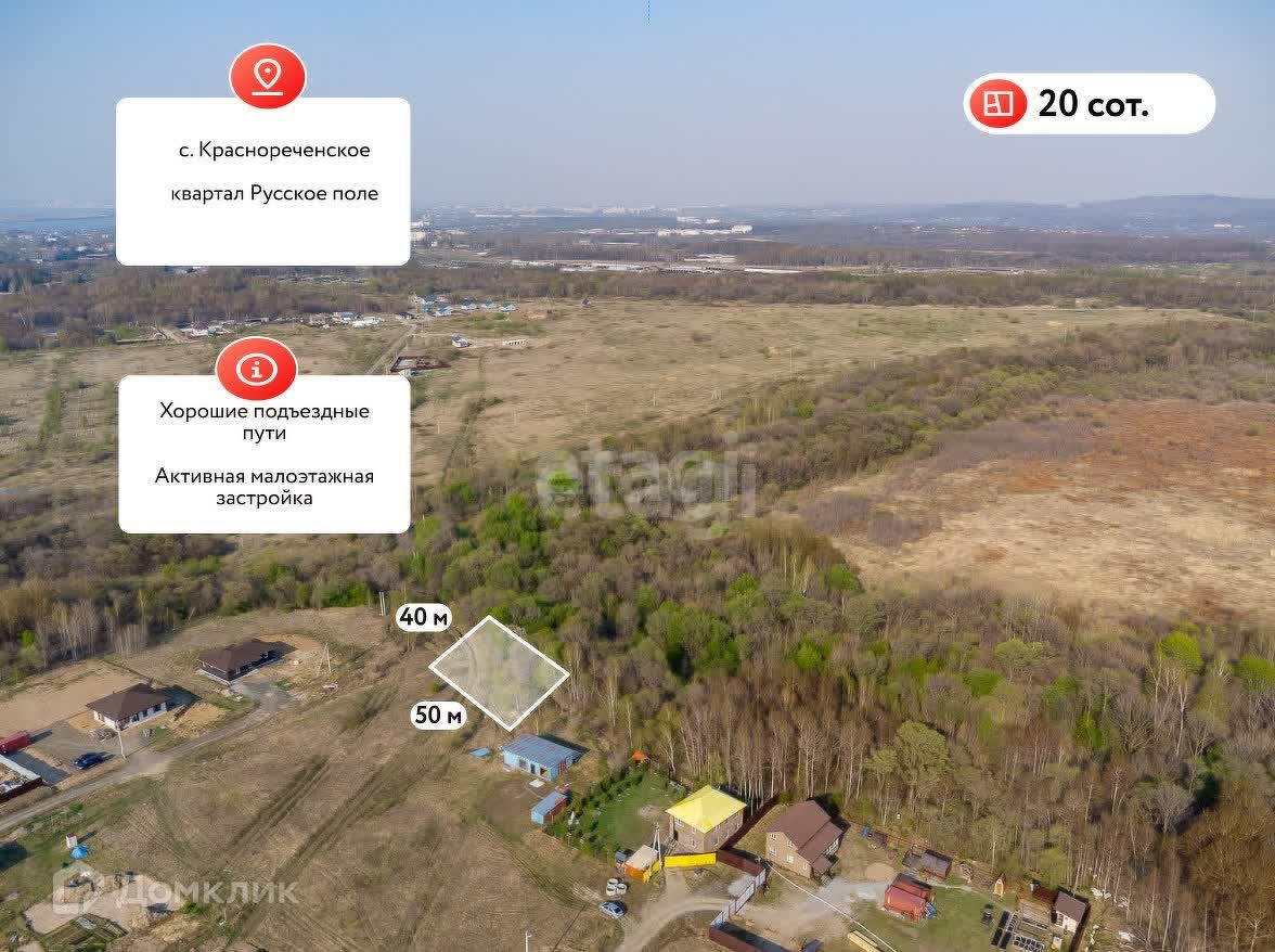 Предлагается к продаже отличный земельный участок правильной формы площадью 20 соток в селе Краснореченское, квартал Русское поле. Застроенный квартал с отличной транспортной доступностью. До города 10 минут.