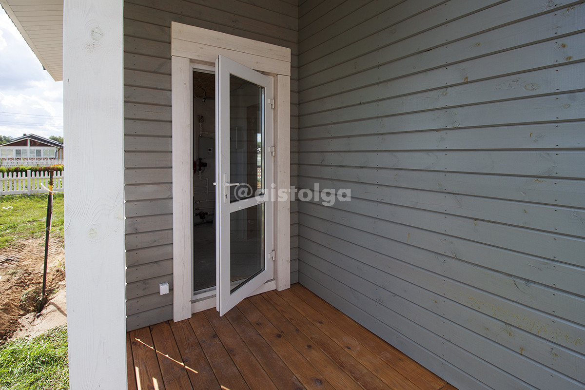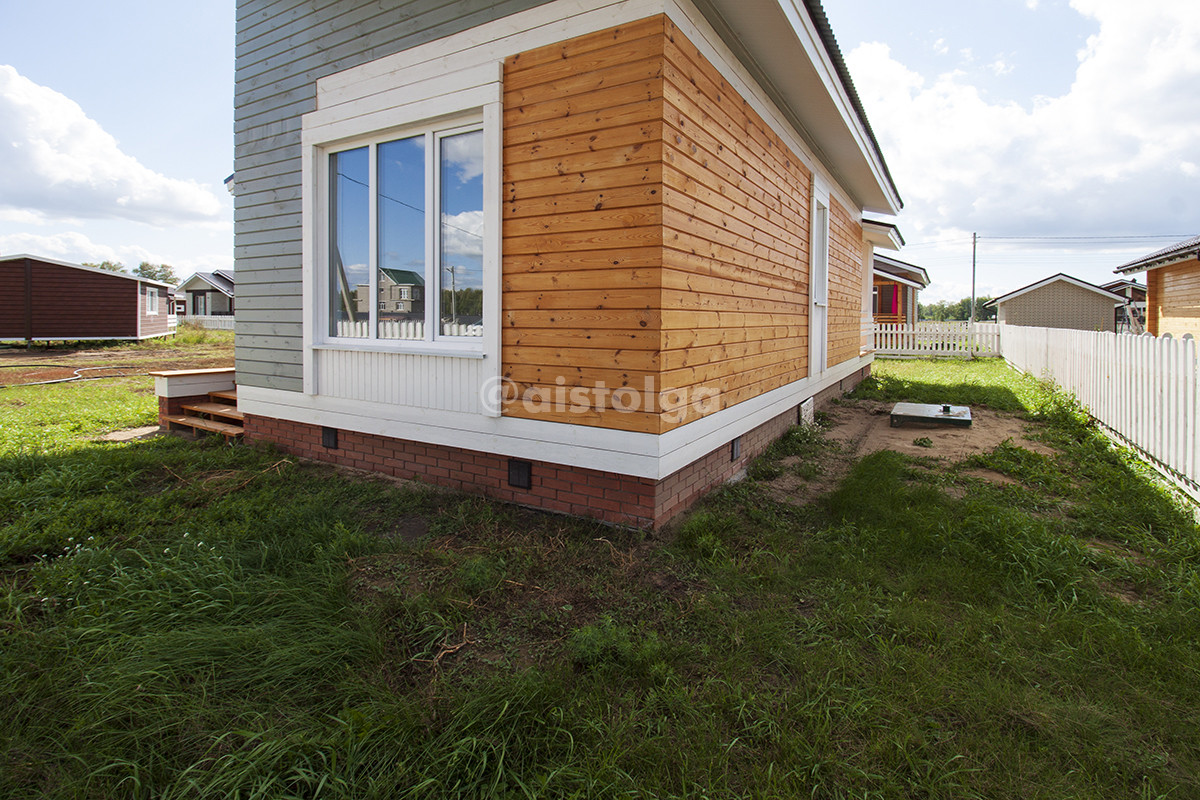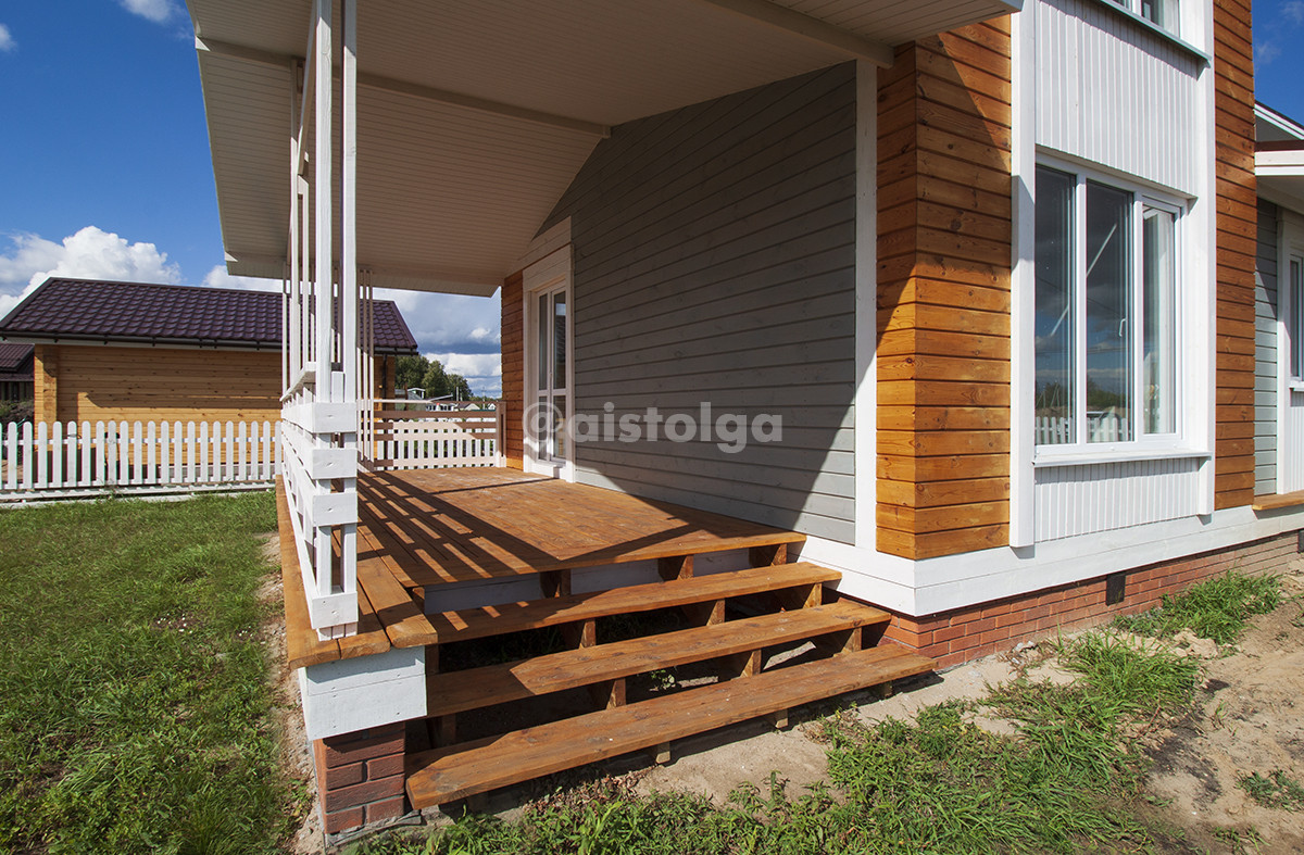 Дом построен на ленточном фундаменте, цоколь из забутовочного и облицовочного кирпича, перекрытия из усиленных СИП панелей 224 мм, стены СИП панели 174 мм, перегородок нет, все стены несущие. На фасаде имитация бруса с огнебиозащитой и колером Пинатекс классик в два слоя. Кровля комбинированная6 теплая и стропильная, профлист, карнизы подшиты панелями ПВХ. Крыльцо и терраса из массива сосны с пропиткой.