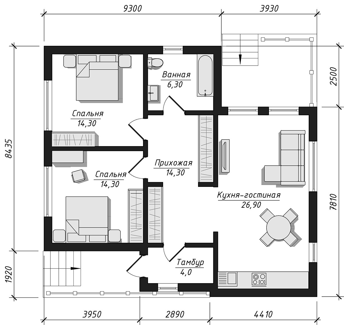 Дом с двумя просторными спальнями и панорамными окнами, большим санузлом, кухней-гостиной и солнечной террасой