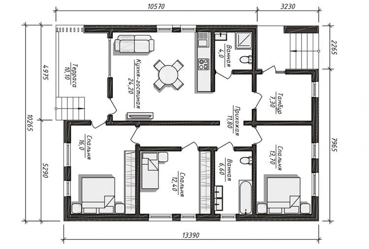 Дом с тремя  просторными спальнями и панорамными окнами, большим санузлом, кухней-гостиной и солнечной террасой.