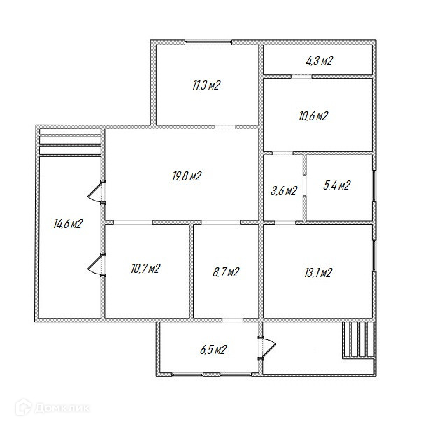 Площадь коттеджа 114 м2. Планировка включает в себя: 3 изолированные комнаты (11 м2, 10,5 м2, 13 м2), просторную кухню-гостиную 30 м2, санузел, прихожую, балкон, террасу.