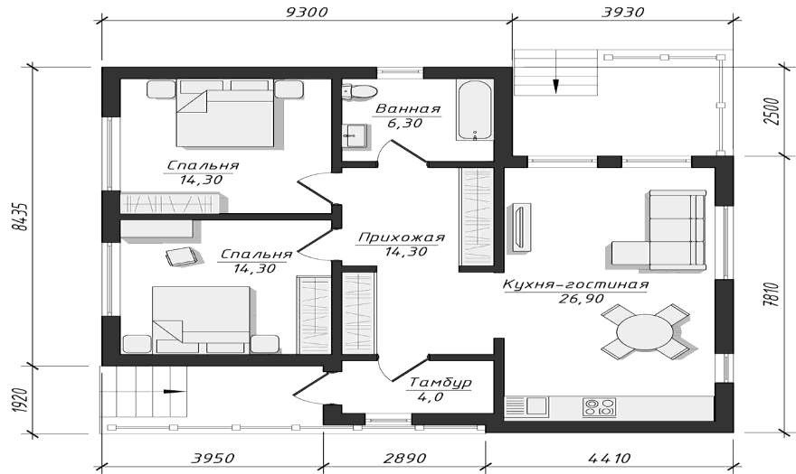 Планировка дома состоит из 2х спален, кухни гостиной с выходом на террасу, ванной комнаты, прихожей и тамбура. Дом построен по современным технологиям из качественных материалов.