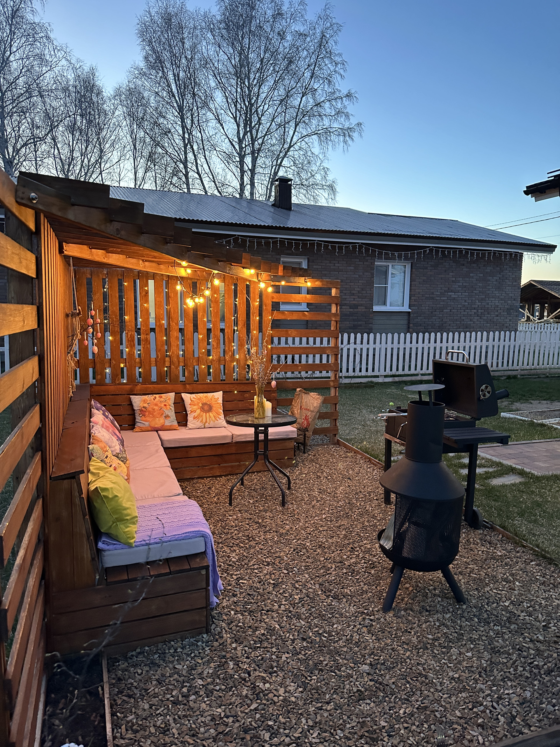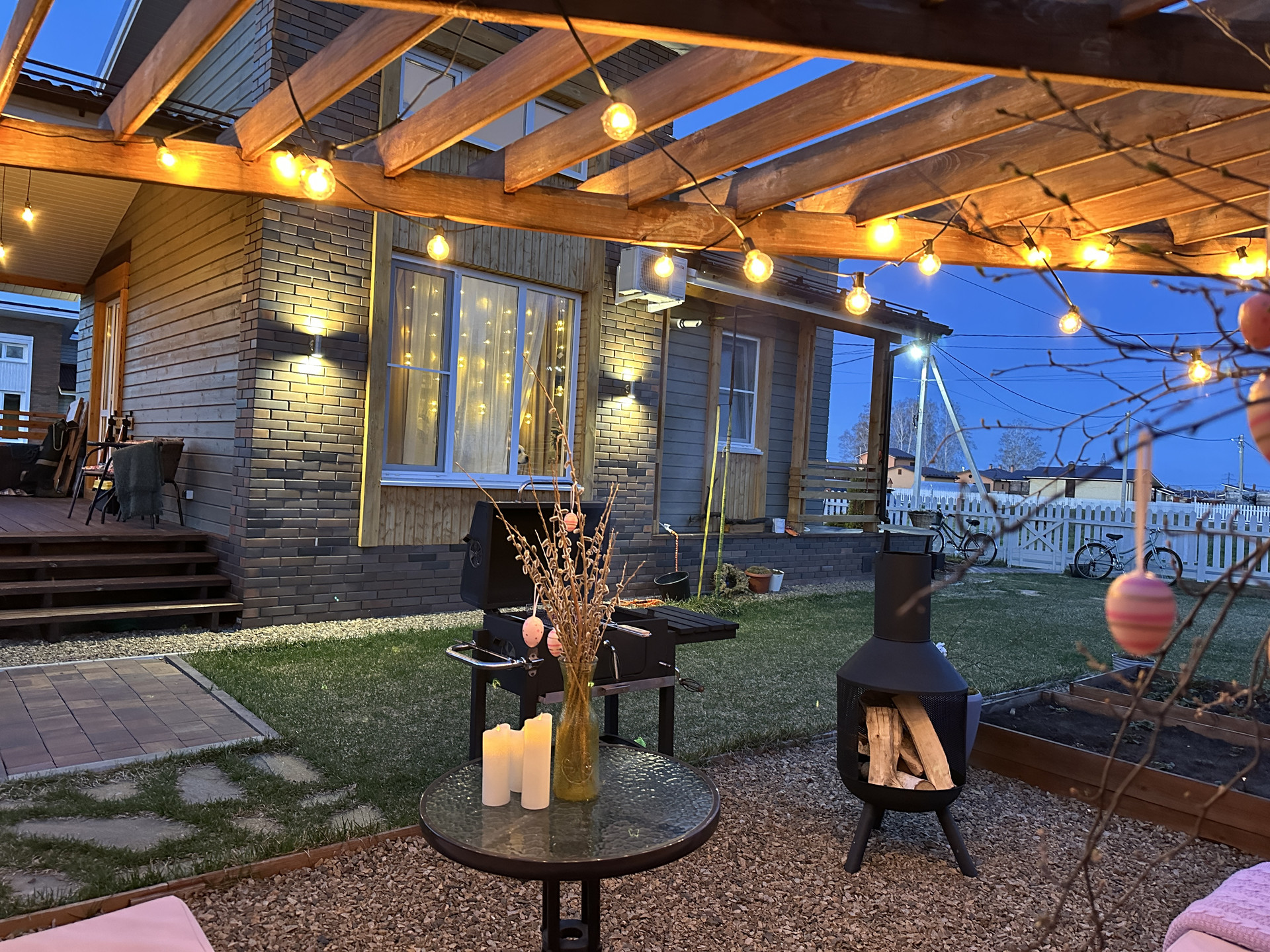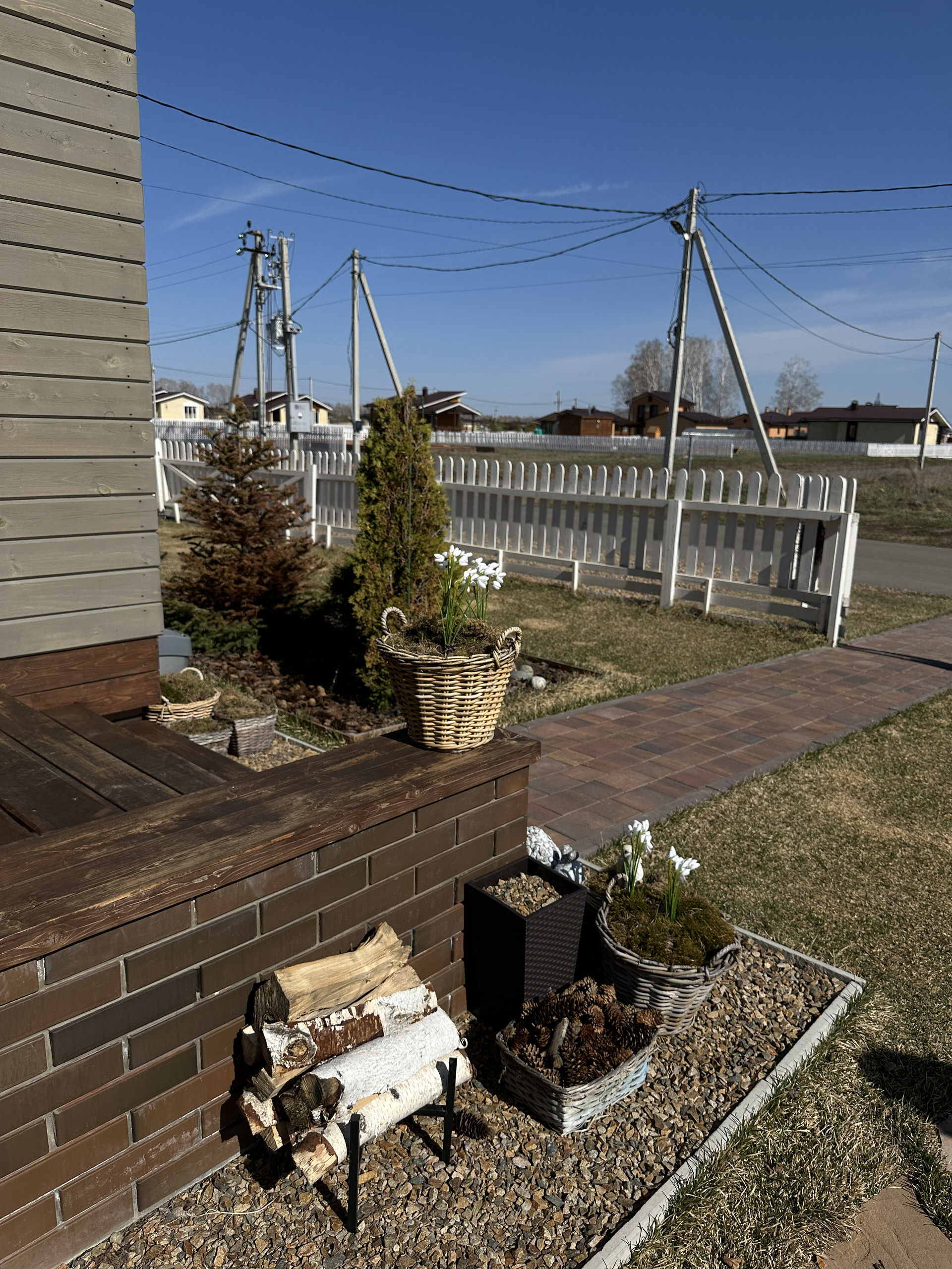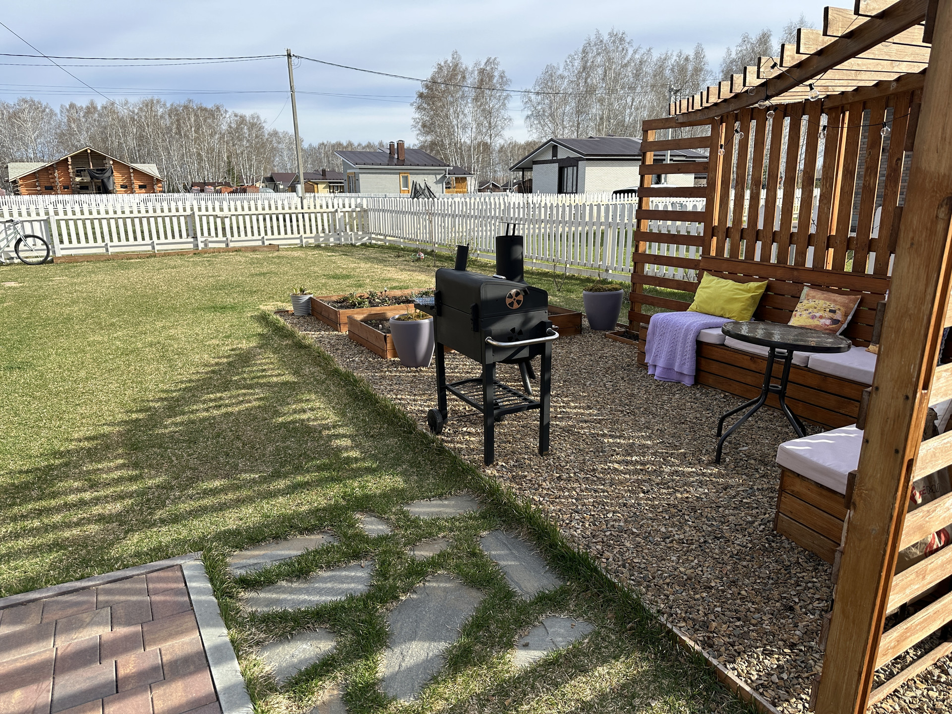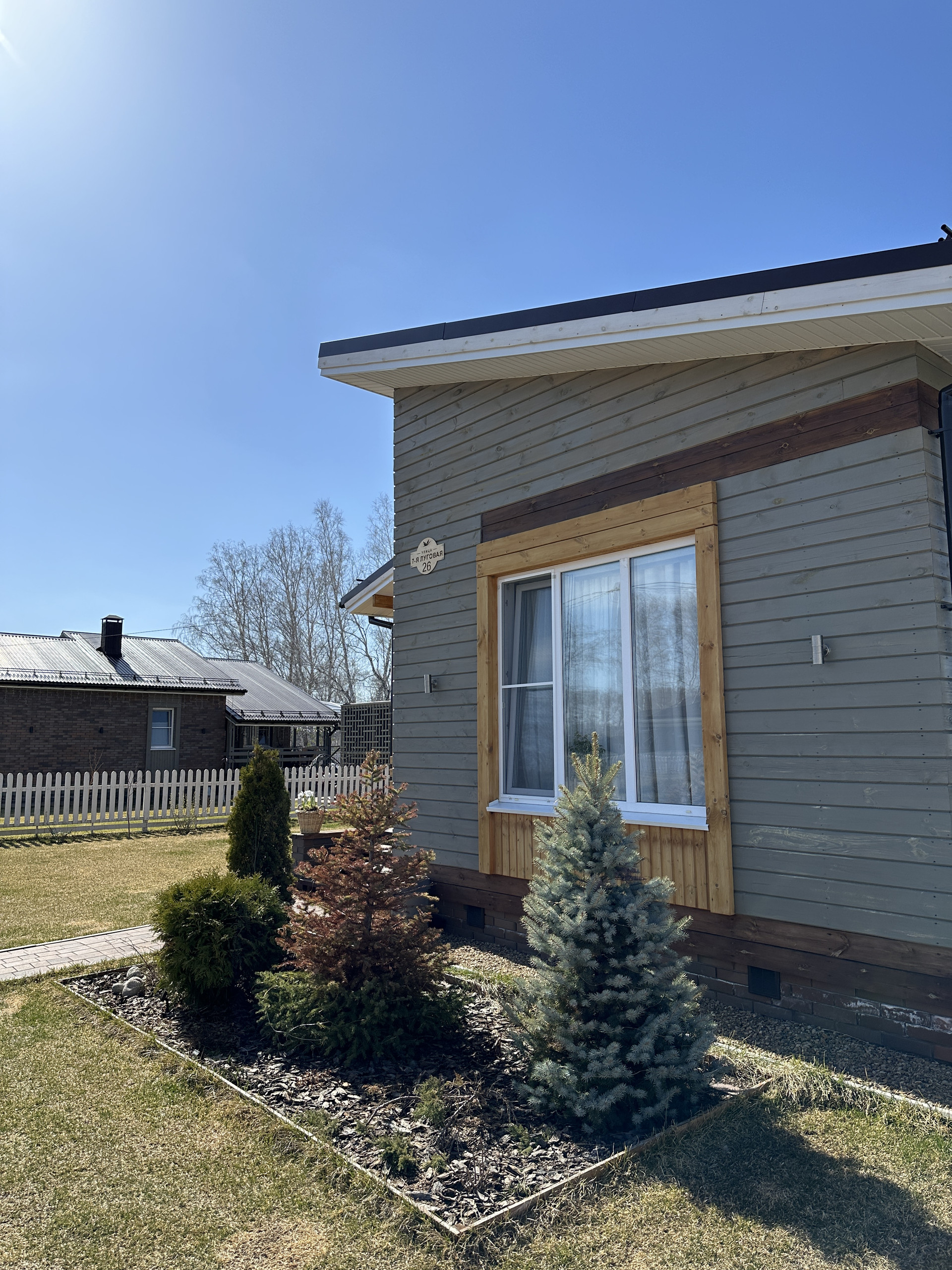 Территория облагорожена газоном, тропинками из тратуарной плитки, хвойные деревья. Организована мангальная зона с зоной отдыха.