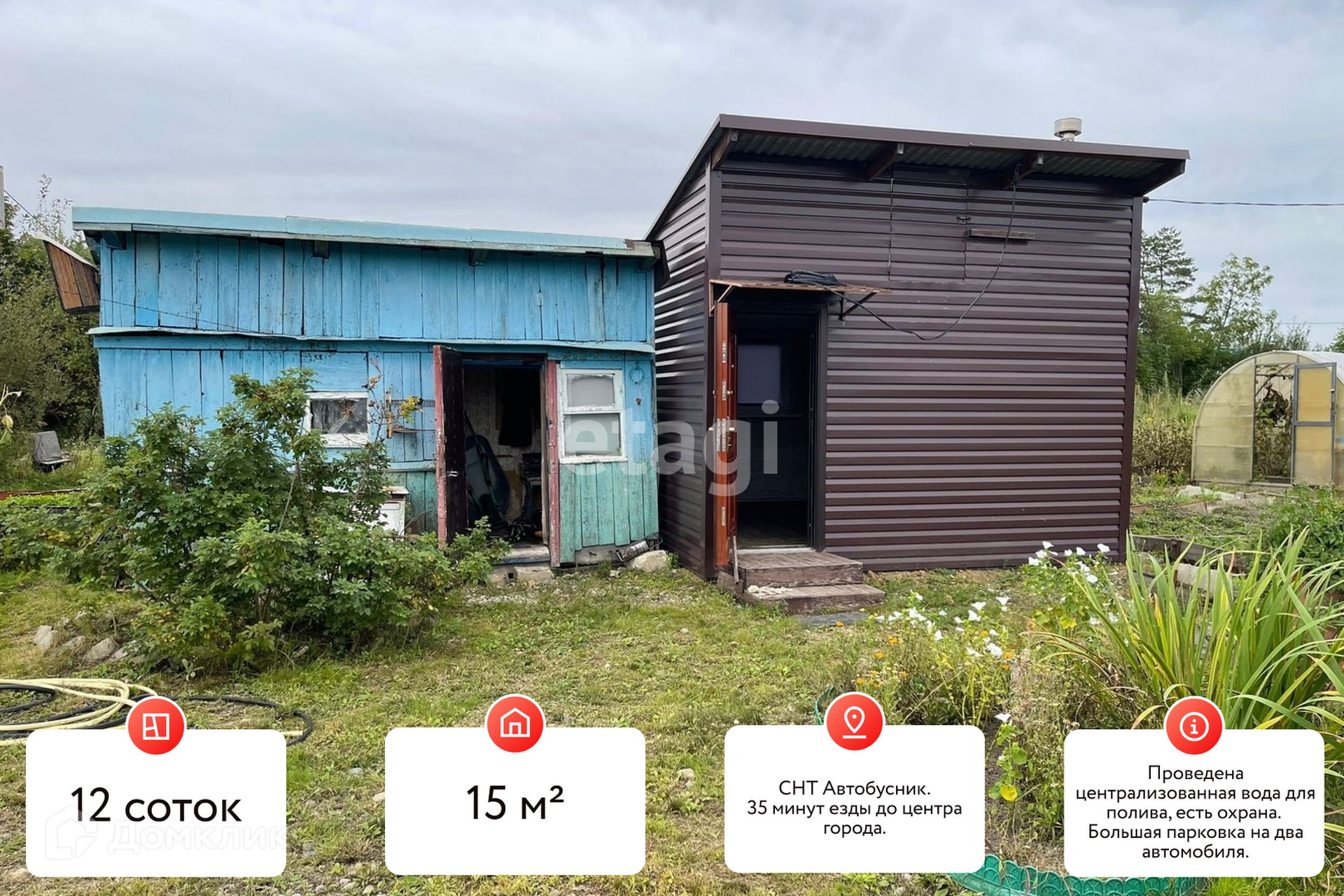 Проведена централизованная вода для полива, есть охрана. Дача состоит из двух участков по 6 соток. Все постройки на одном участке, второй пустой.