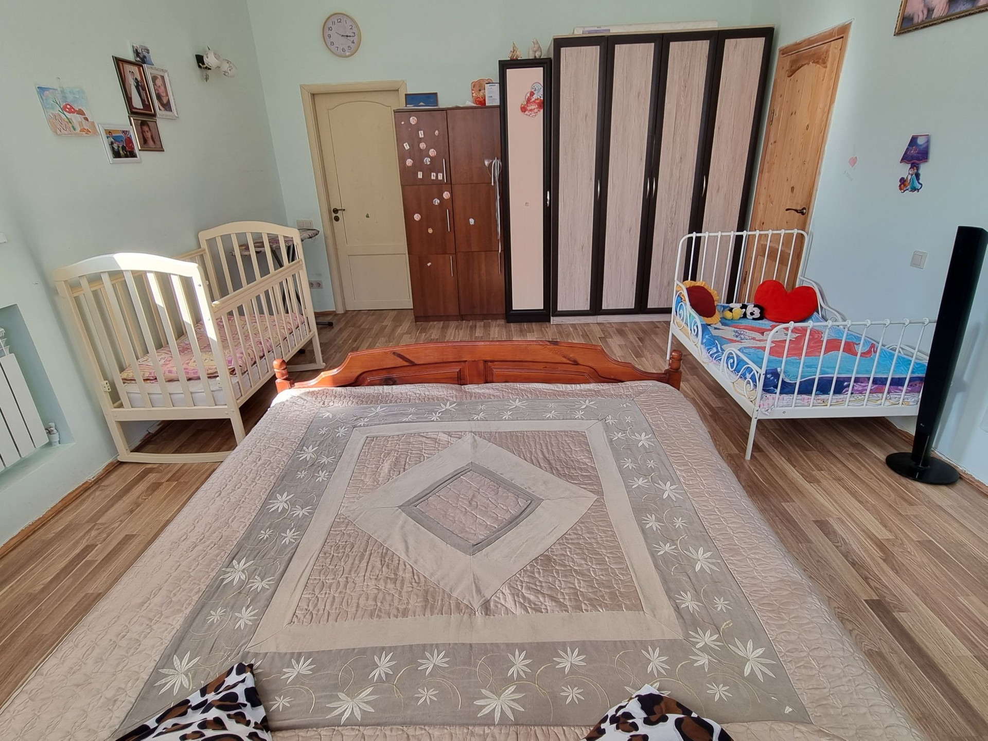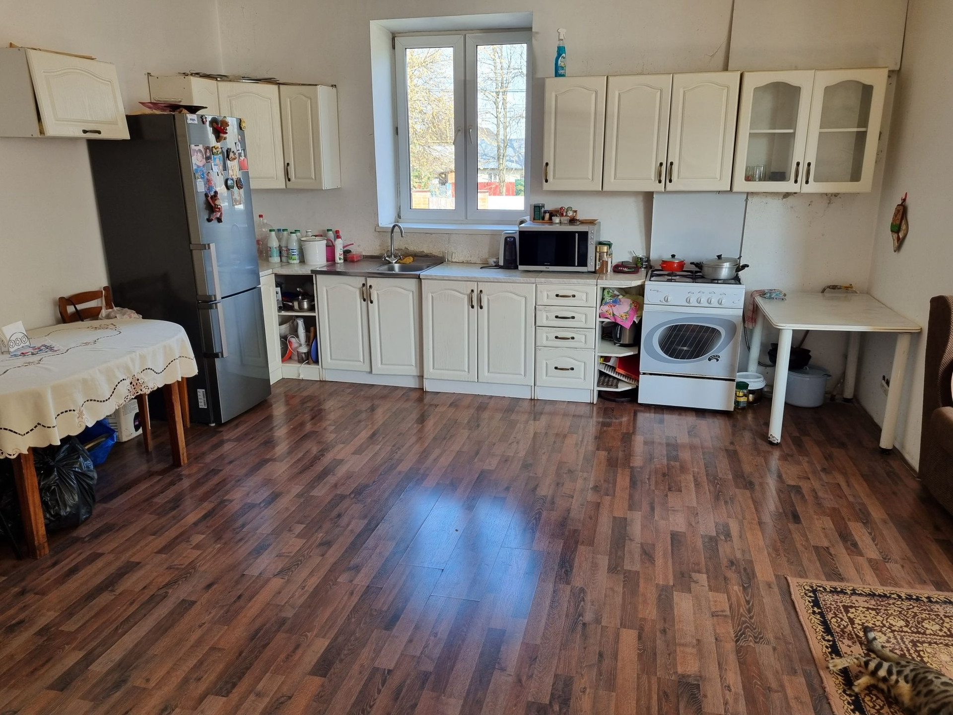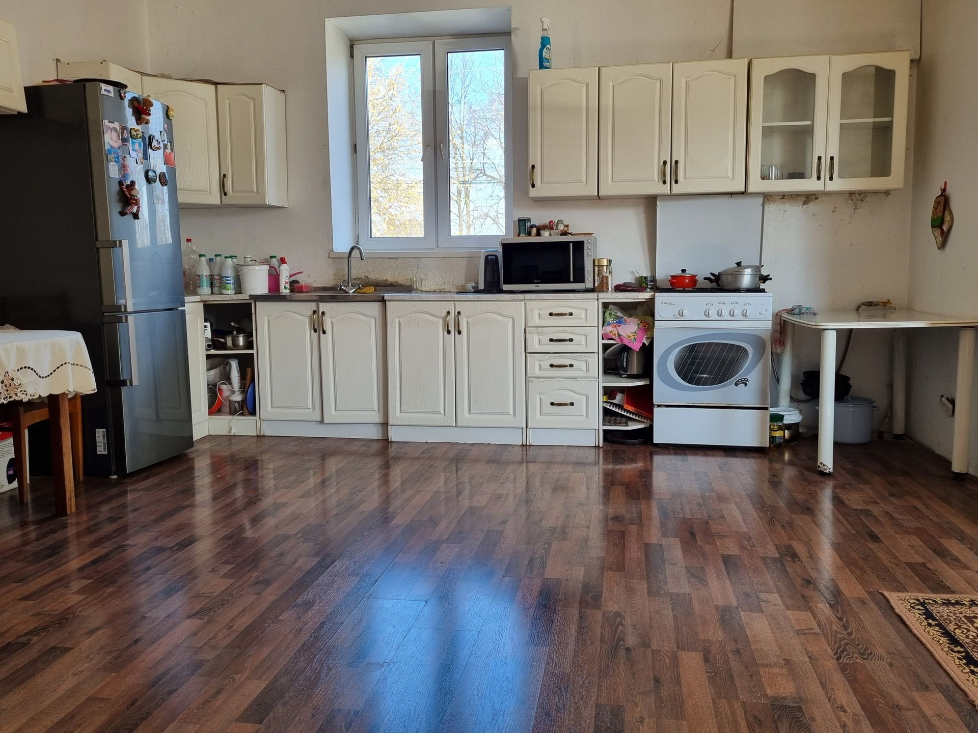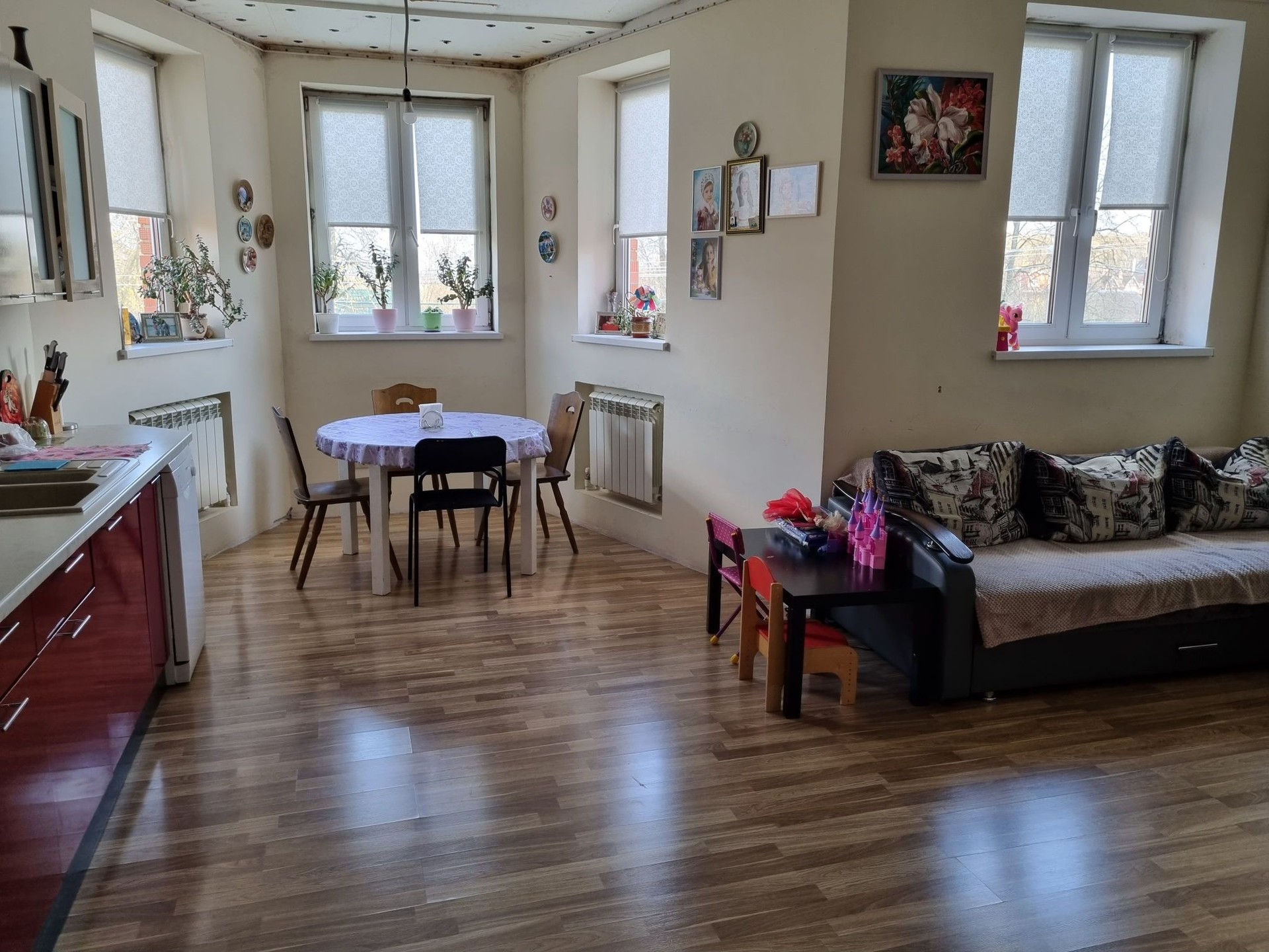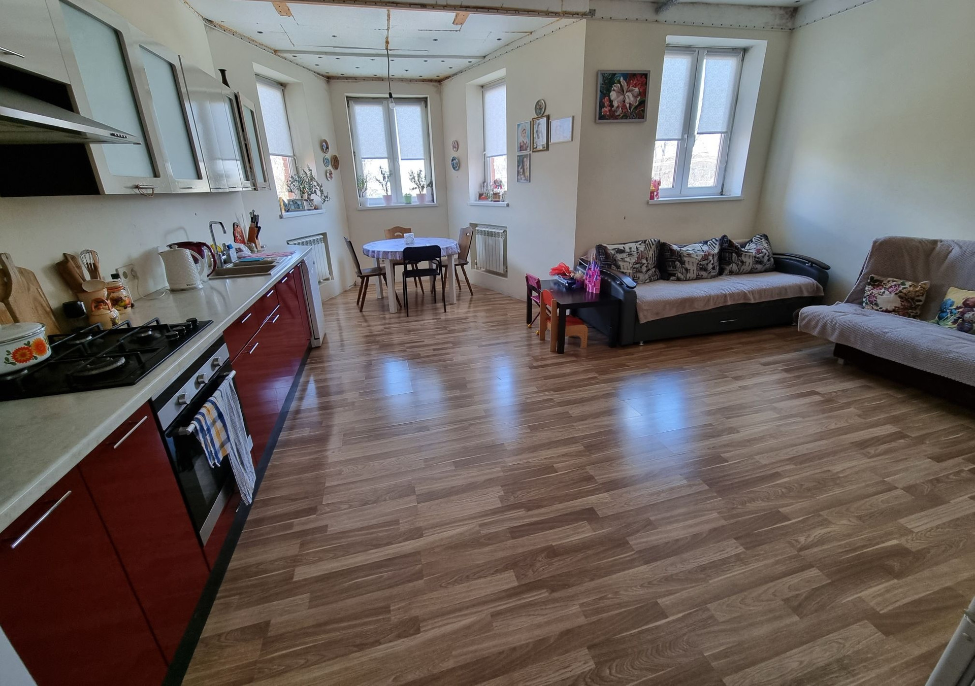 На первом этаже: огромная кухня-гостинная, большая спальня, которую при желании можно разделить на две части, раздельный санузел.