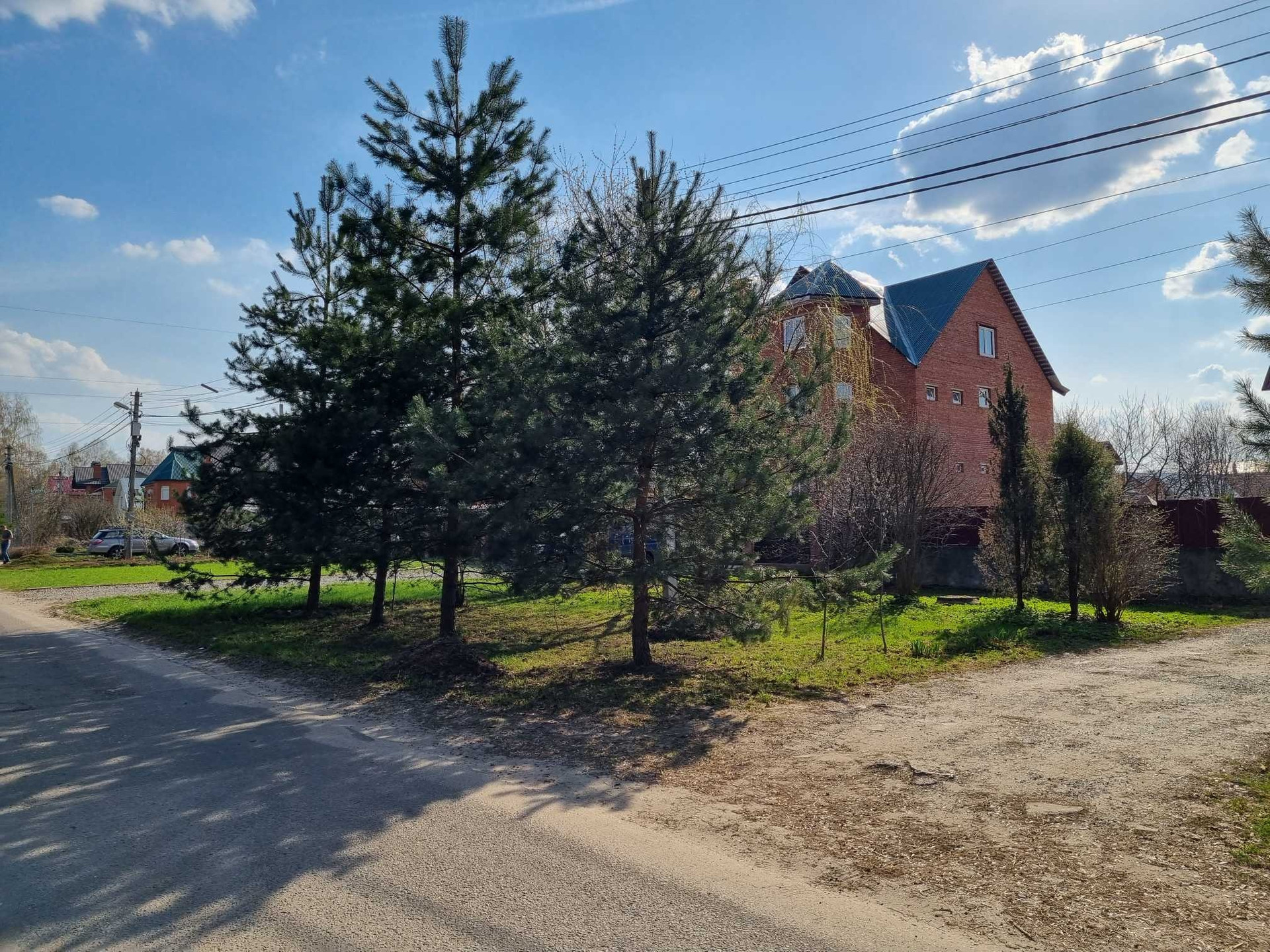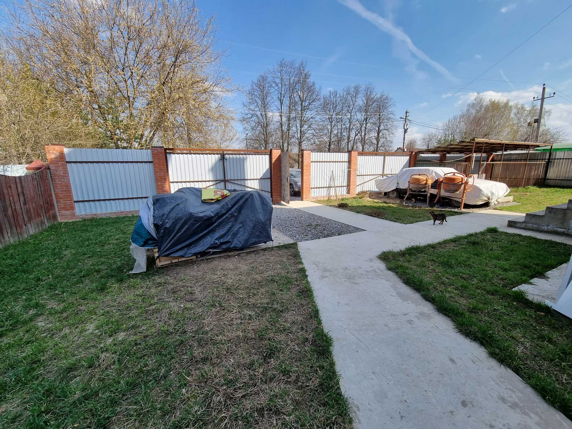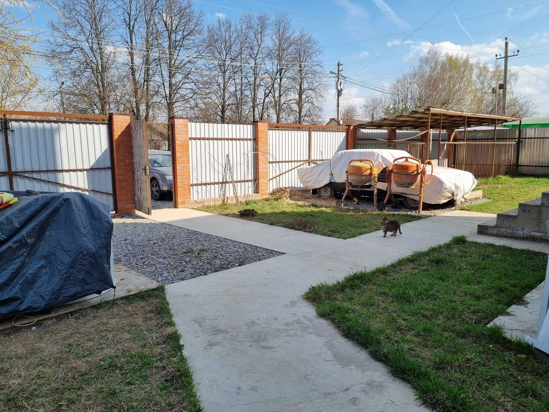Земля чистая, есть бетонные дорожки и две парковочные площадки с воротами для въезда транспорта.