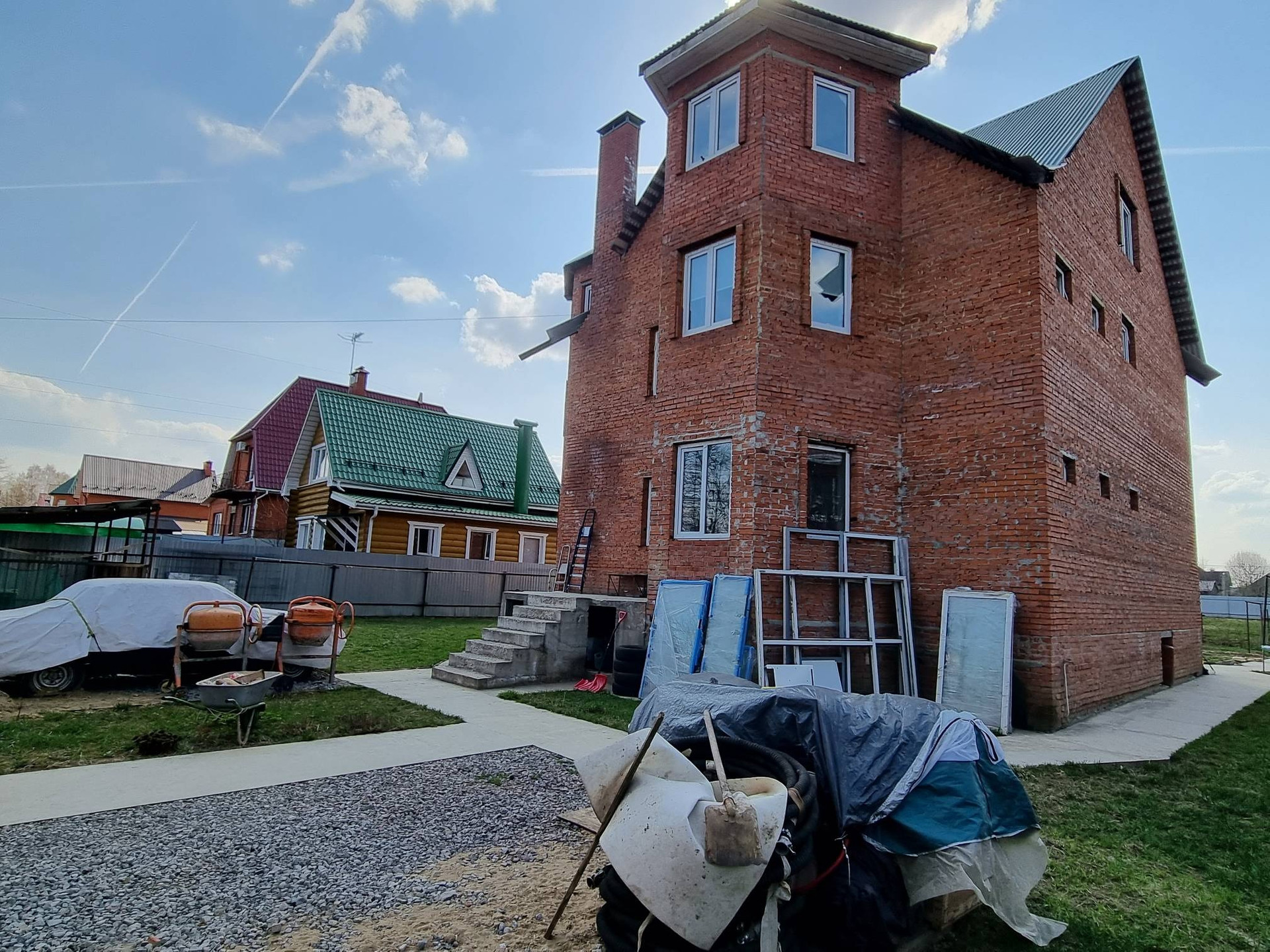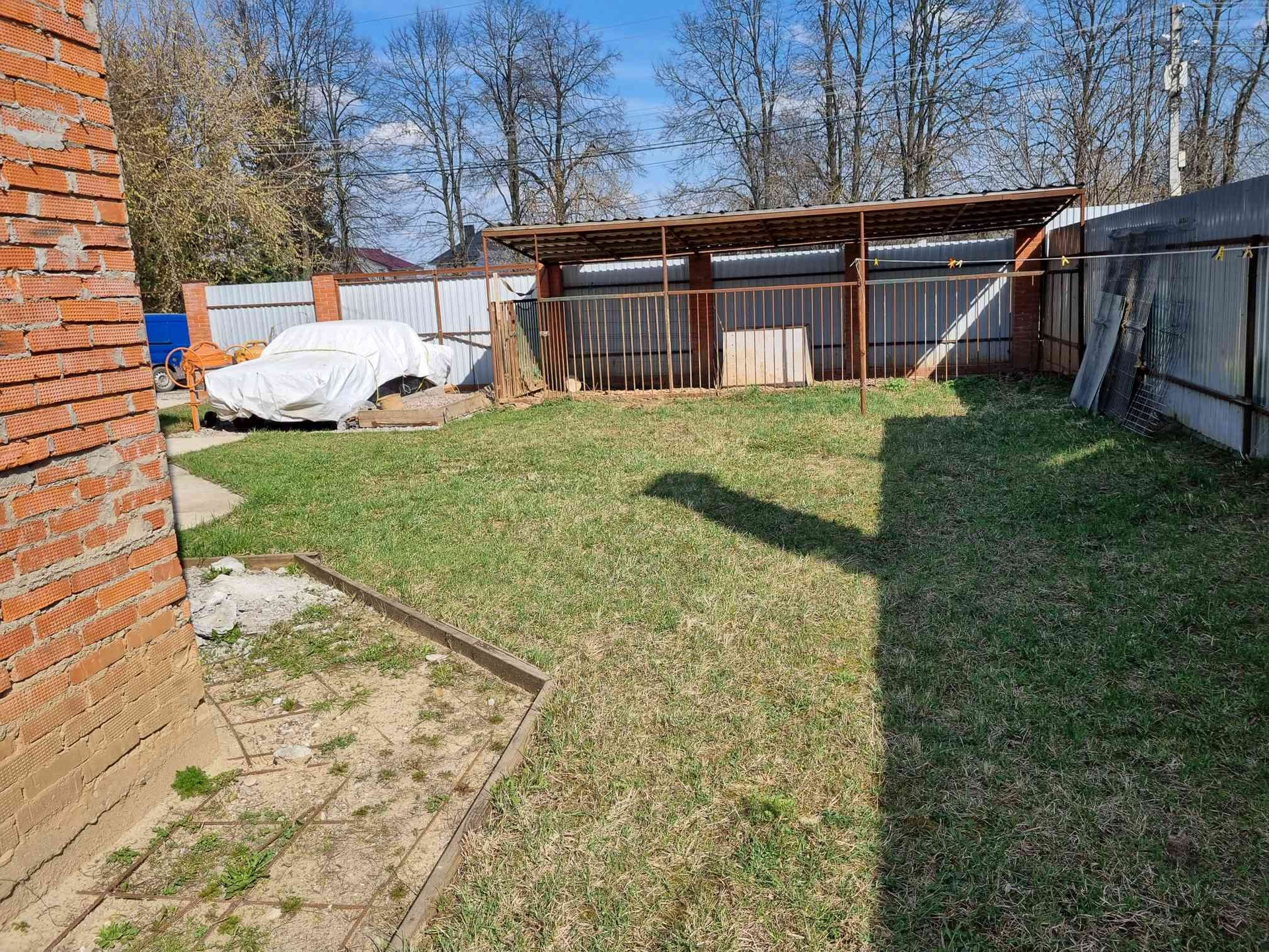 На участке недавно залили фундаментную плиту размером 4*9 кв.м., для бани с зоной "барбекю", также есть небольшой уголок подсобного хозяйства: курятник и теплица.