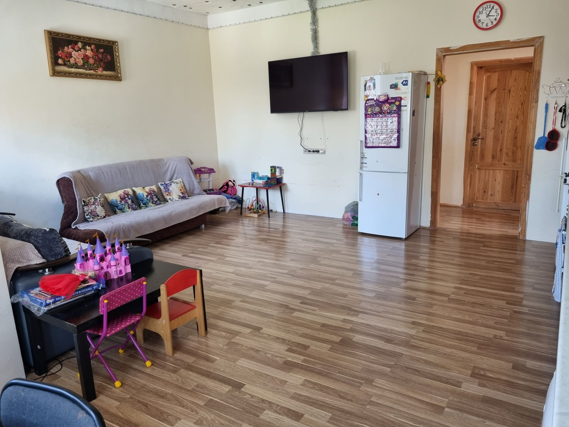 На первом этаже: огромная кухня-гостинная, большая спальня, которую при желании можно разделить на две части, раздельный санузел.