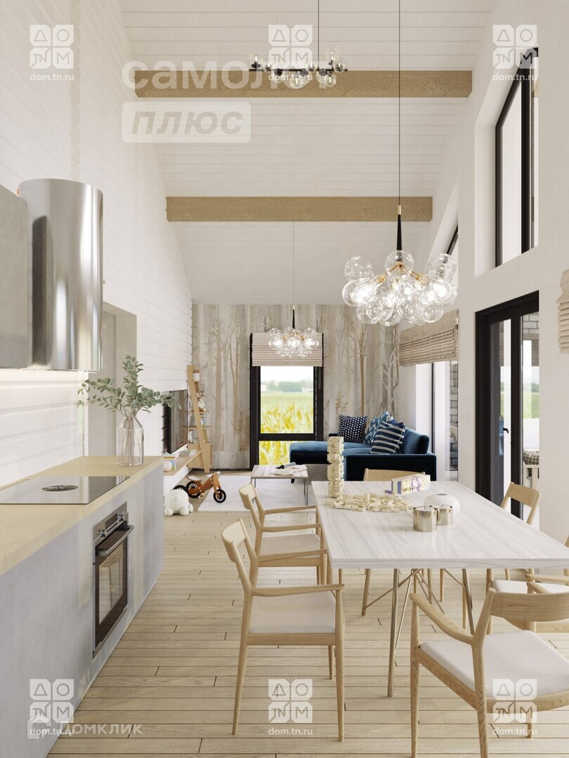 - Анфилада нашего проекта начинается в прихожей, минуя зону спален, ведет через гостиную-кухню на просторную террасу. Таким образом, при входе в дом открывается перспектива на террасу и сад. Терраса расширяет пространство гостиной в два раза, а выход в сад делает ее бесконечной. Панорамное остекление фасада стирает границу между внутренним пространством дома и участком.