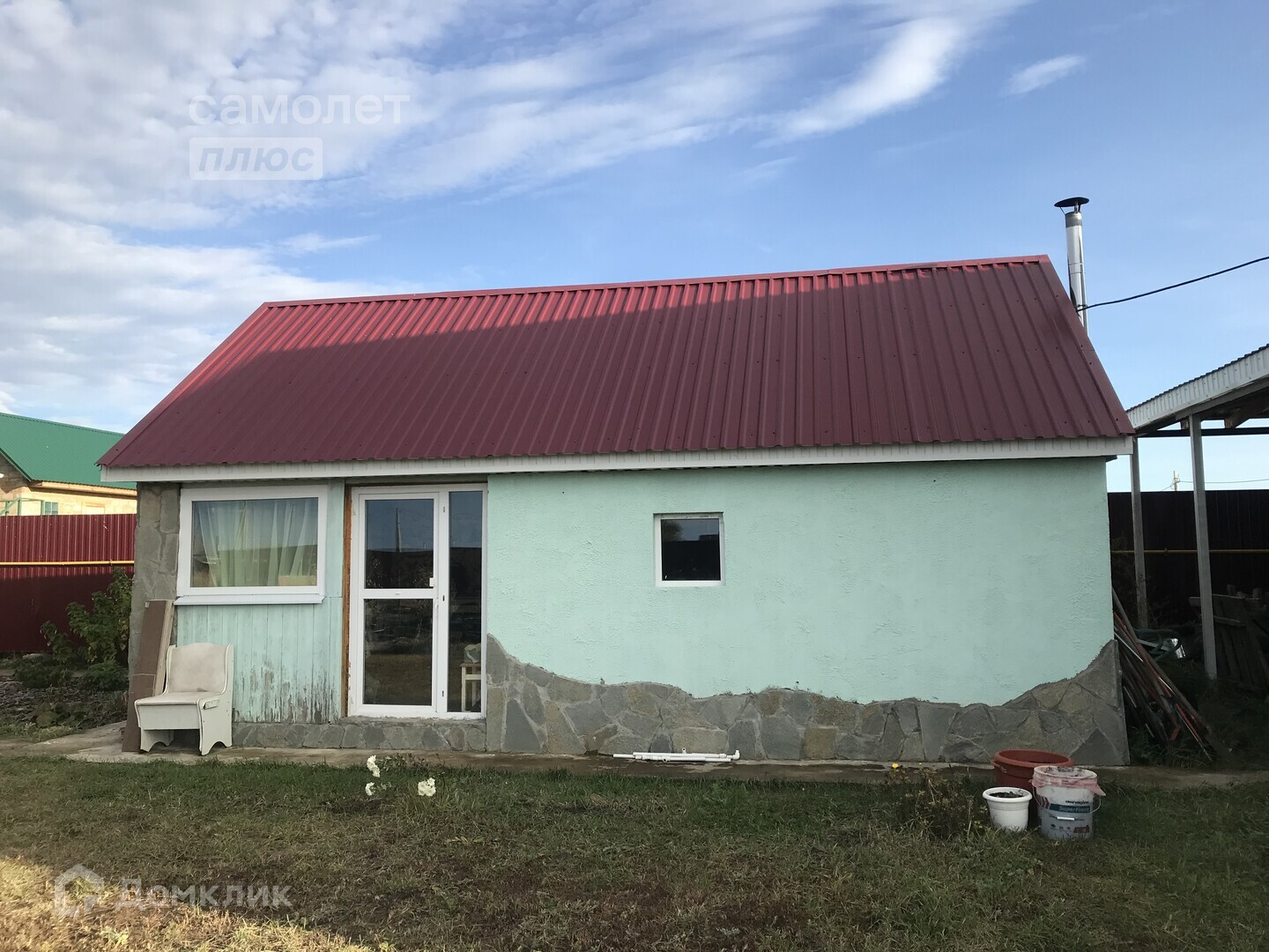 На участке баня на дровах 4*7 ( веранда, комната отдыха, помывочная, парилка- отделка липа). Материал стен керамзитобетонные блоки, утеплитель 10, крыша- металлопрофиль.