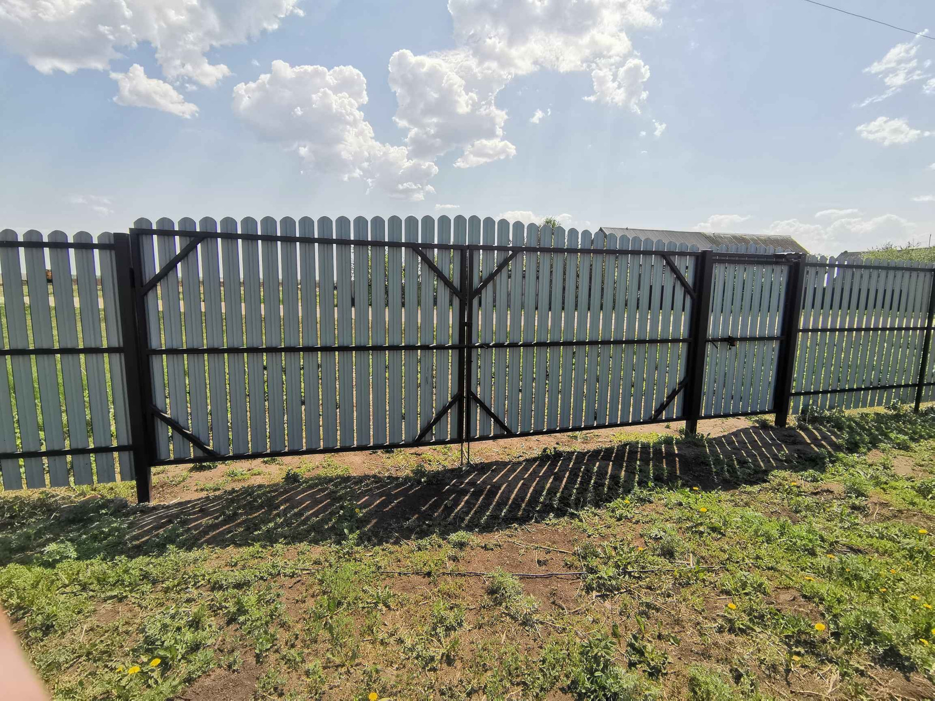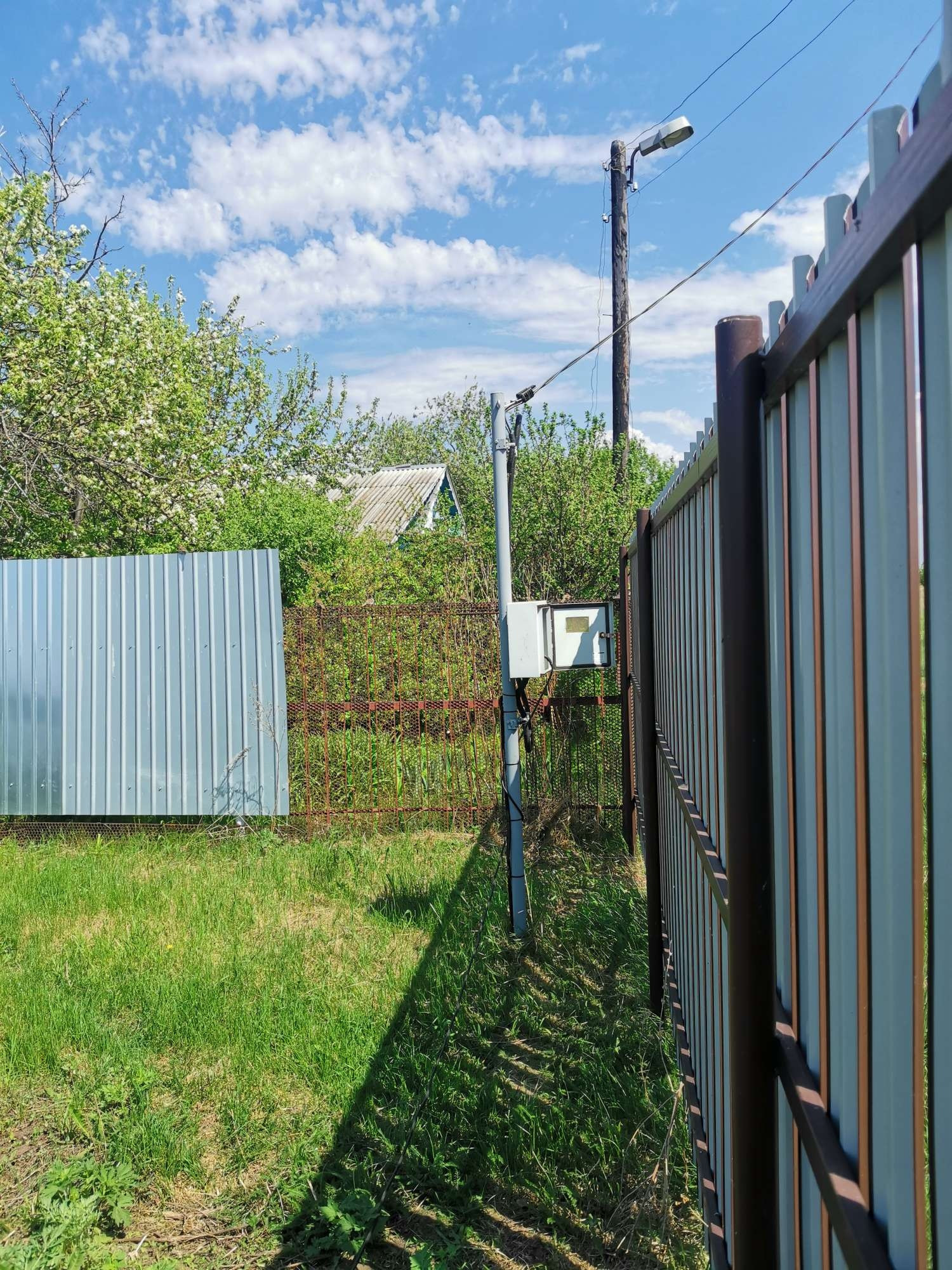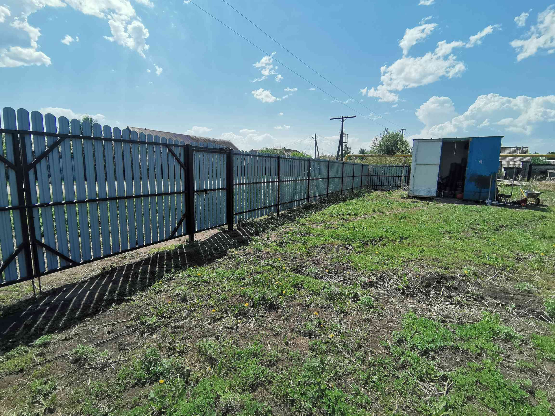 На участке установлен строительный гараж для хранения инструмента и материалов. Установлен новый забор. Лицевая и задние стороны забора сделаны из металлоштакетника и имеют калитки и ворота (5 метровые с лицевой и 4 метровые с задней стороны). Смотрится на все 100, а учитывая сколько сейчас стоит металл, то еще и очень дорого смотрится.
