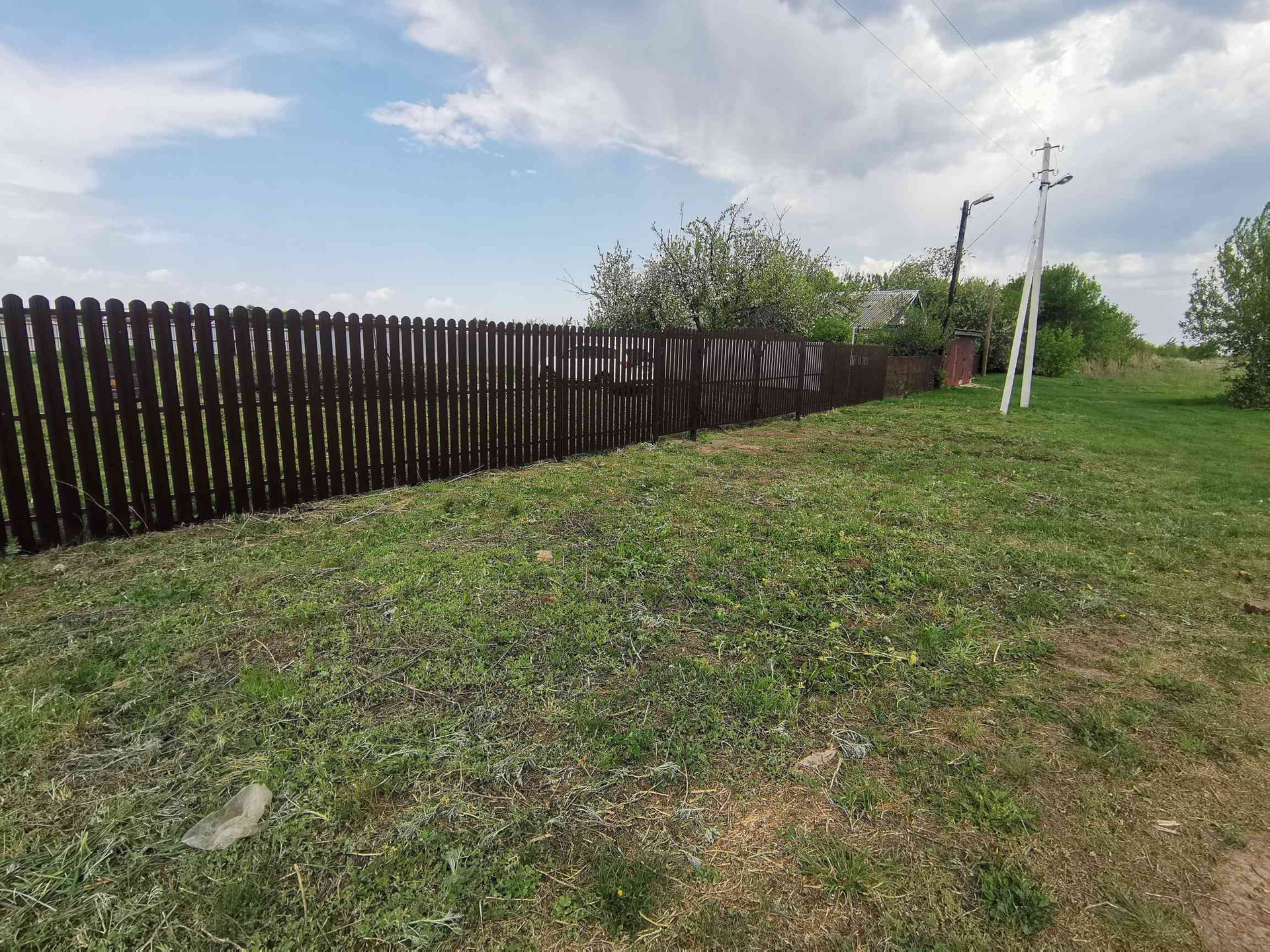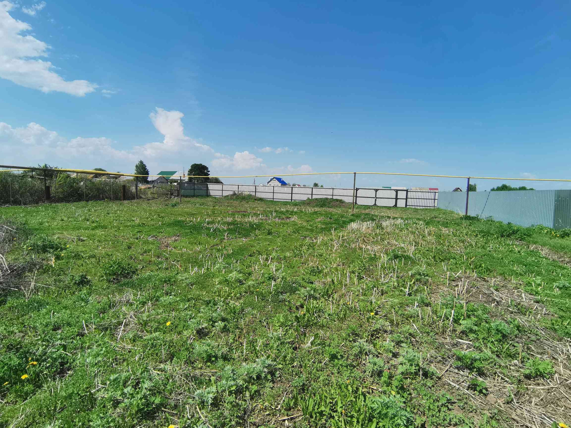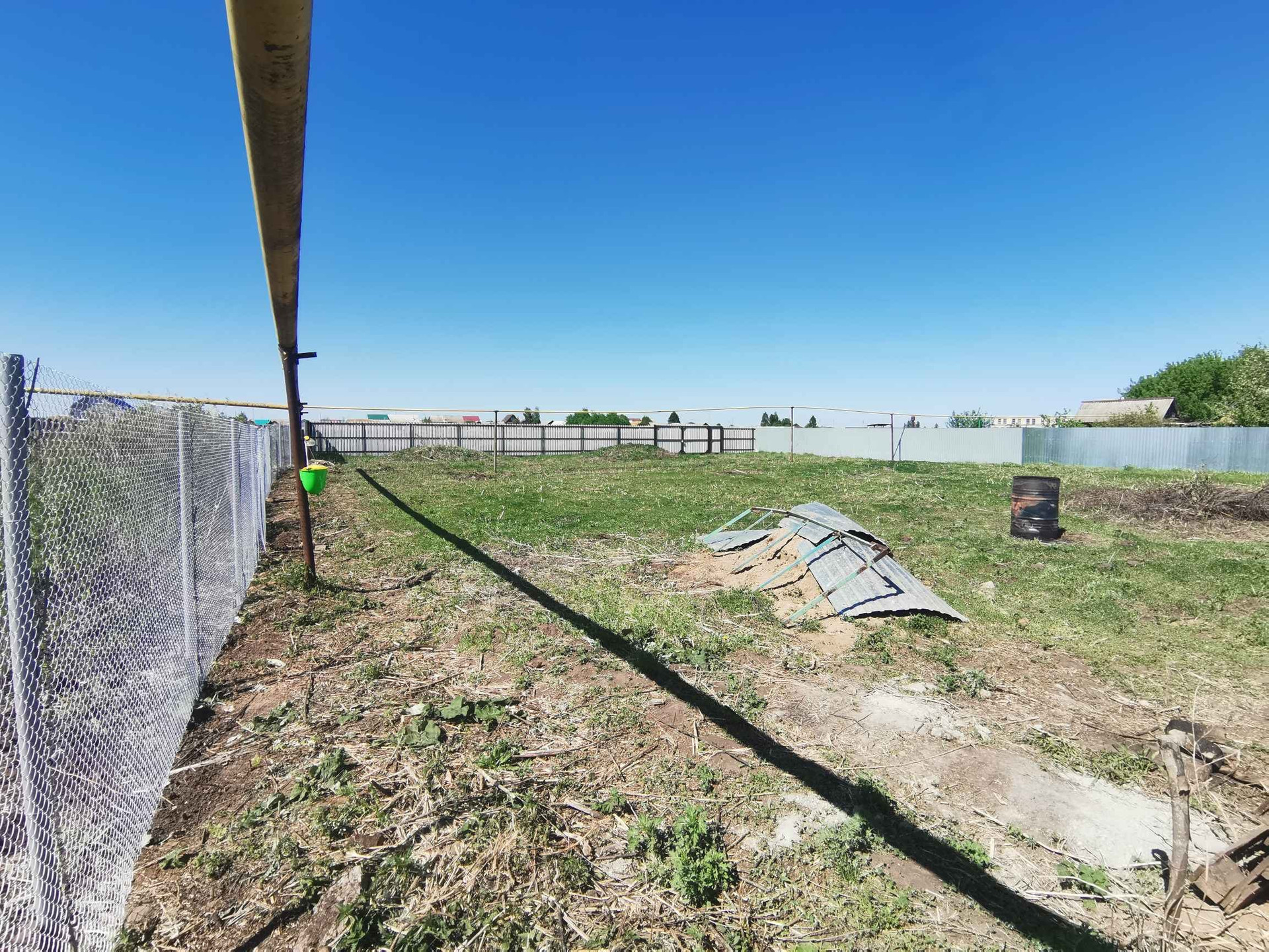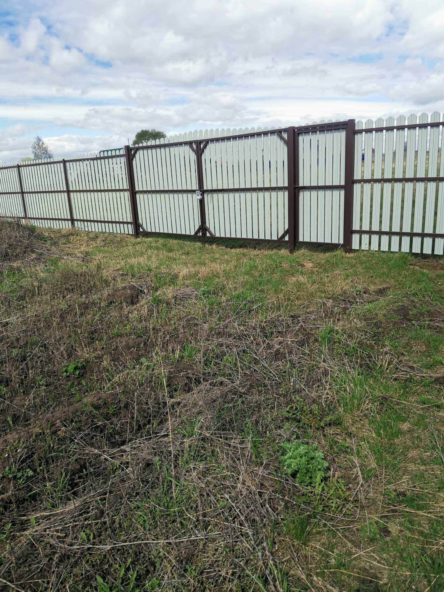 Забором огорожено примерно 12 соток, под строительство дома, бани, хозпостроек и тд. За задним забором поле еще примерно 17 соток. В данный момент на заднем поле растет трава.