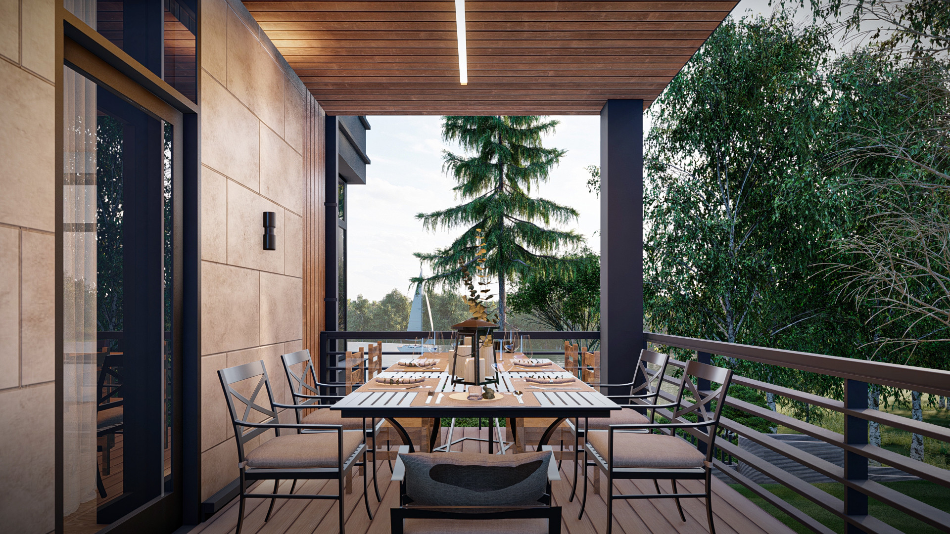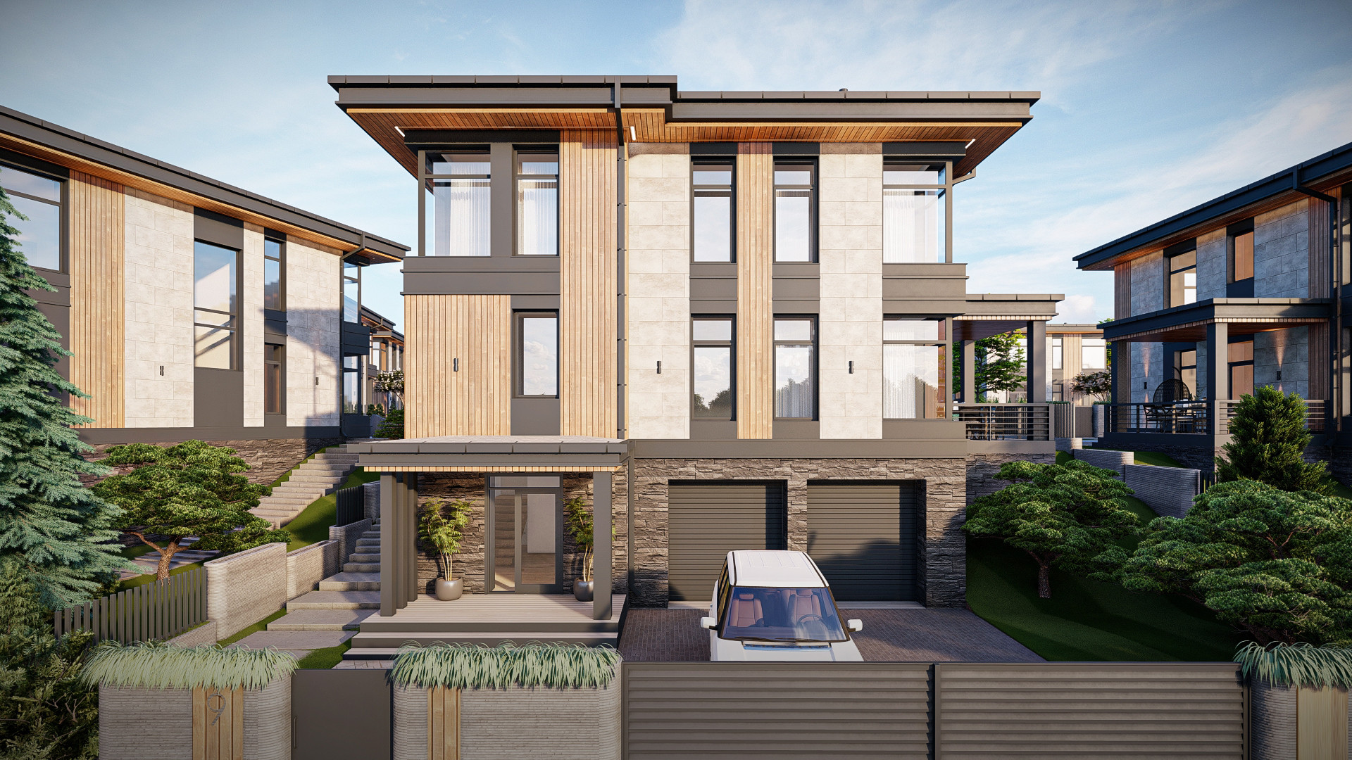 В проекте использованы такие материалы фасадов как фасадная штукатурка двух цветов, алюминиевые композитные панели, мягкая кровля. На террасах используется террасная доска.