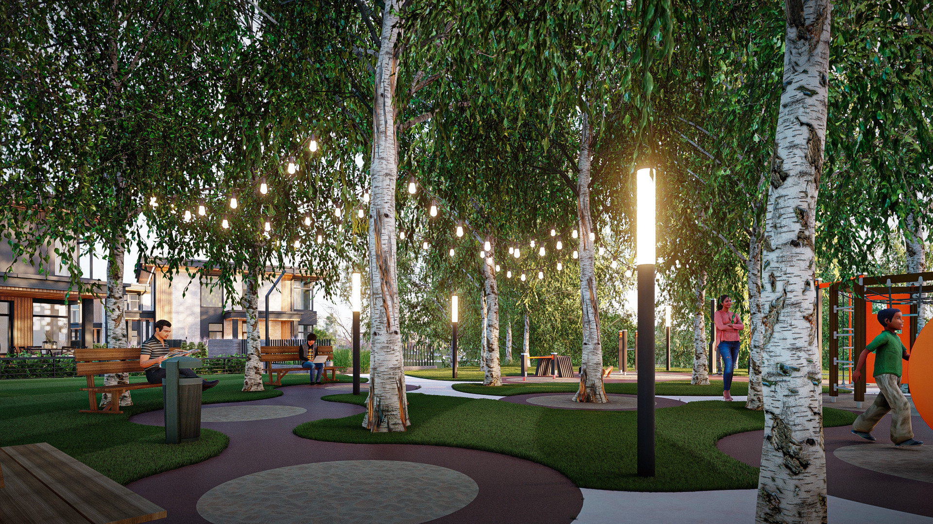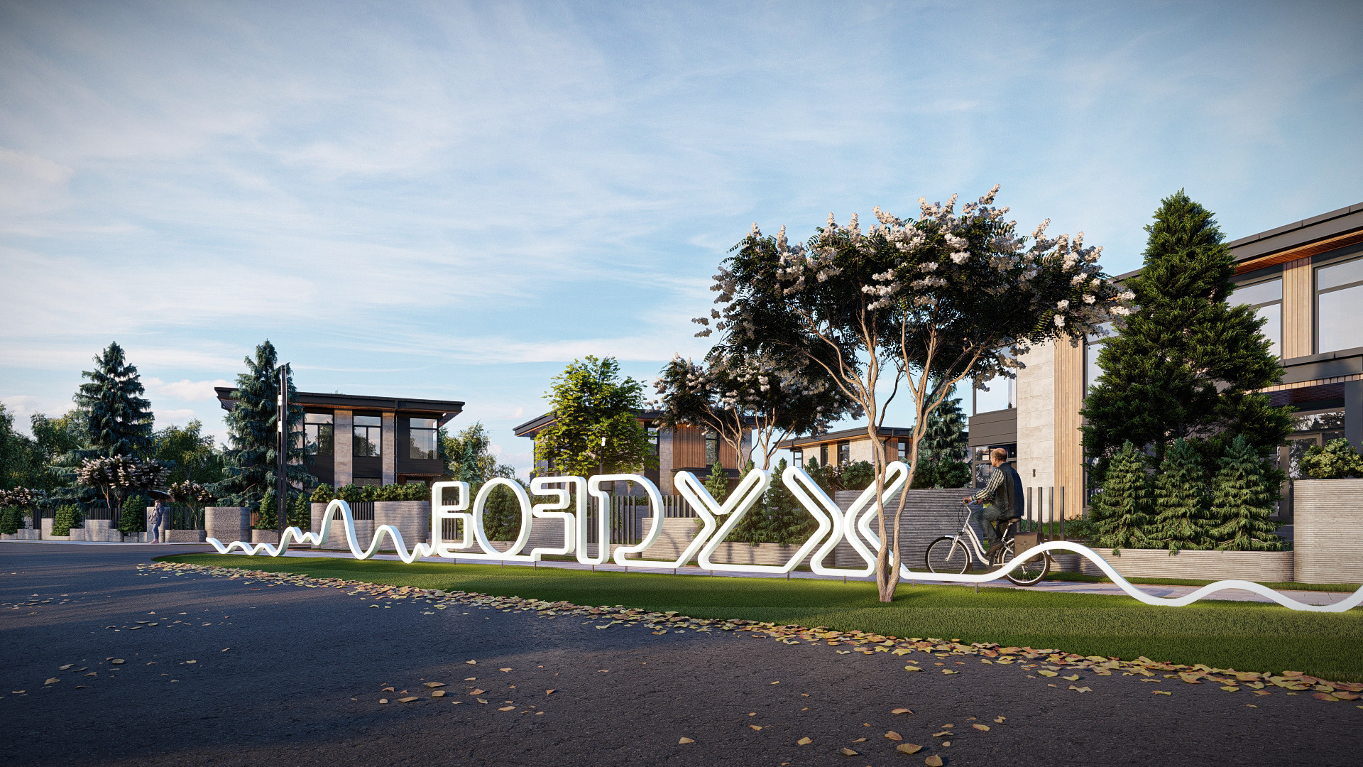 Также проектом разработаны малые архитектурные формы: входная группа из уличных фонарей на въезде в квартал  и надпись «Воздух» с подсветкой в ночное время