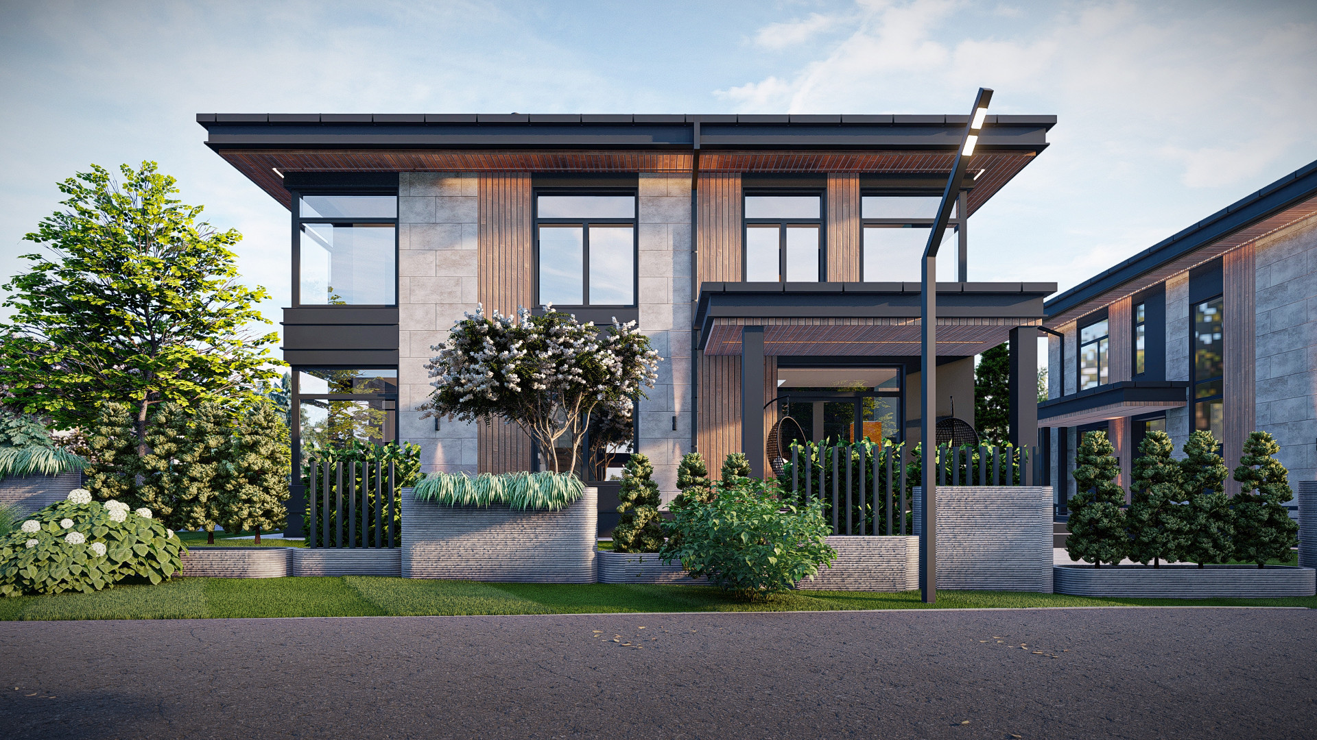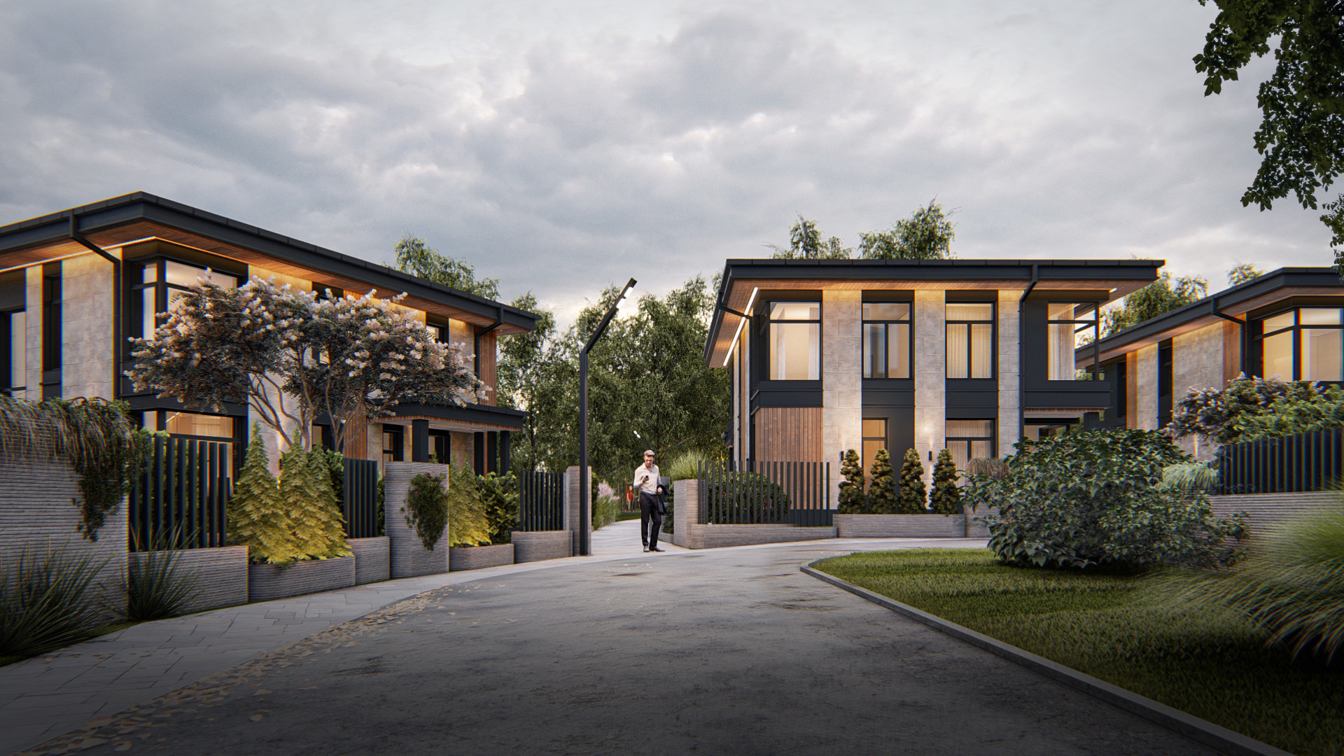 Так как рядом с участком проектирования находится березовый лес, проектом было решено разместить на индивидуальных участках хвойные деревья – голубые ели, а также группы кустарников.