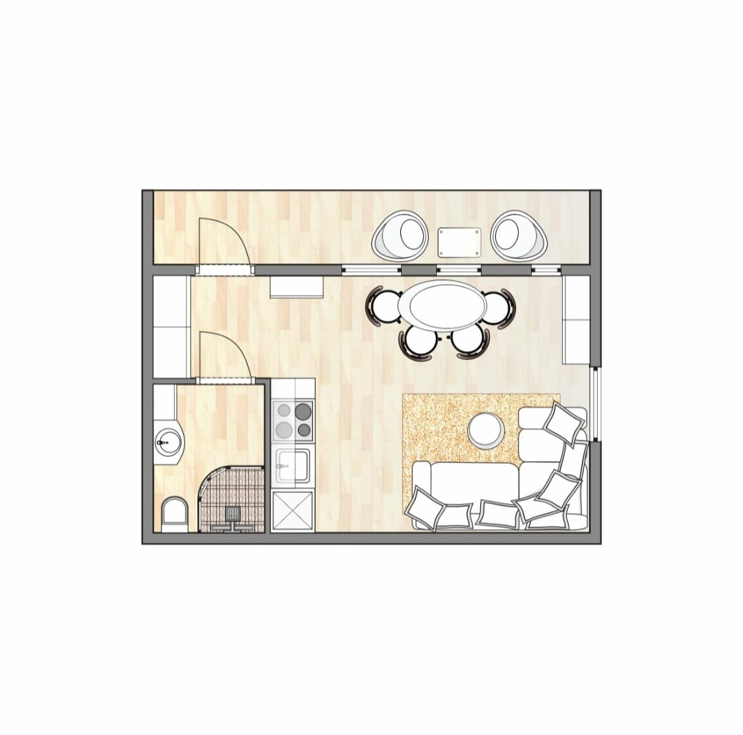 В представленном доме имеется большая кухня-гостиная и санузел с душевой кабинкой. Кроме того, наличие крыльца-веранды позволяет насладиться свежим воздухом и прекрасным видом.