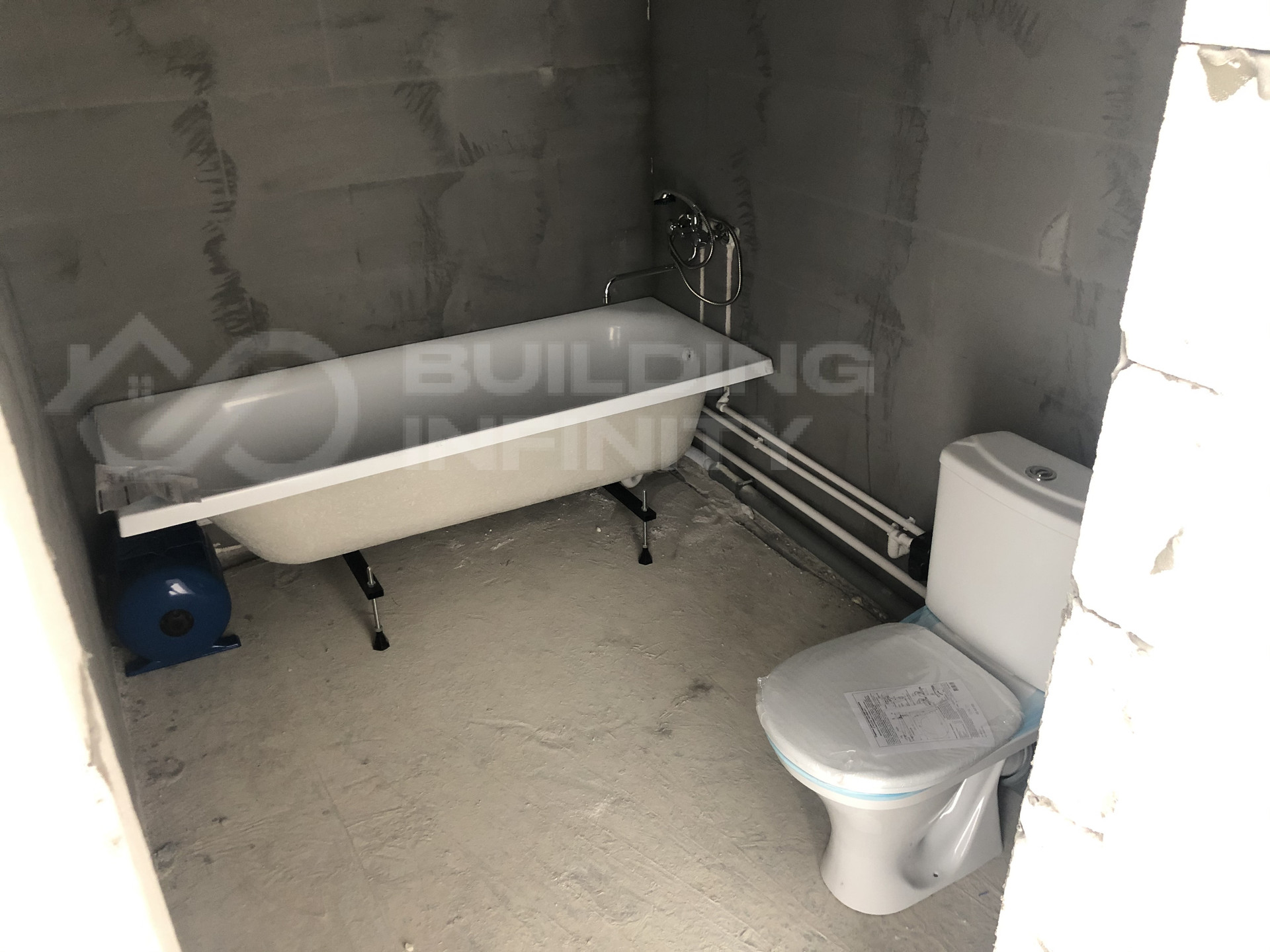 установлена ванна, унитаз, смеситель