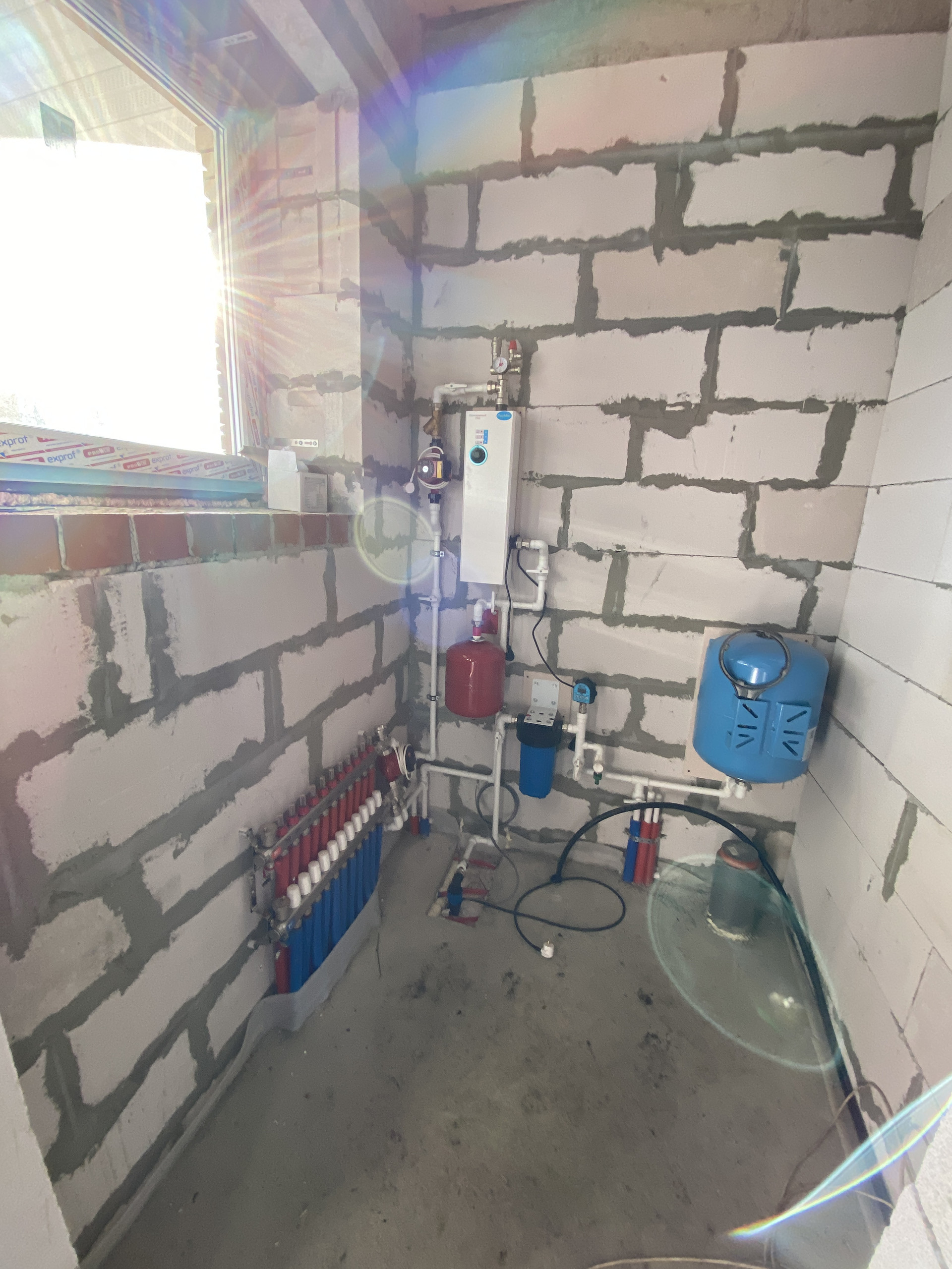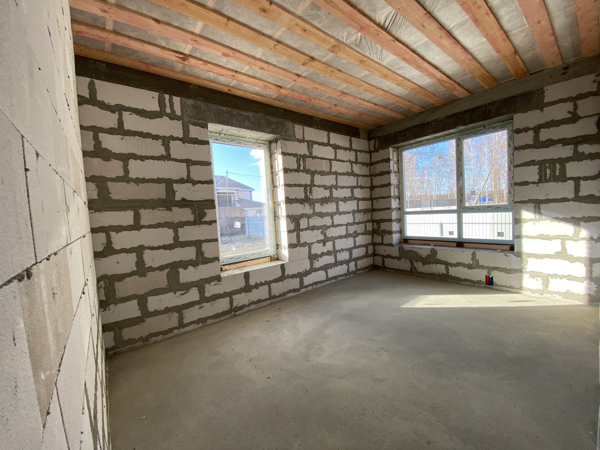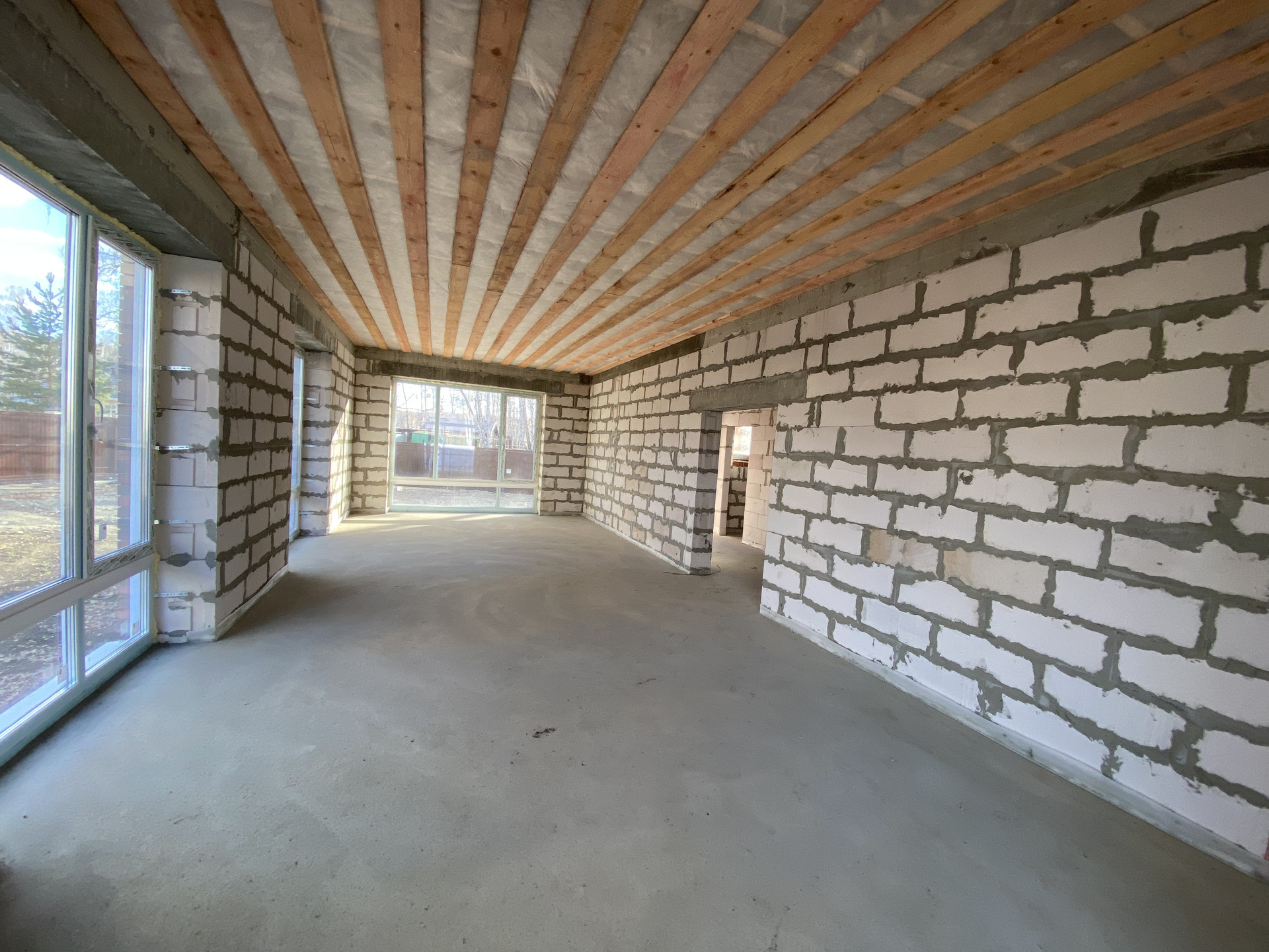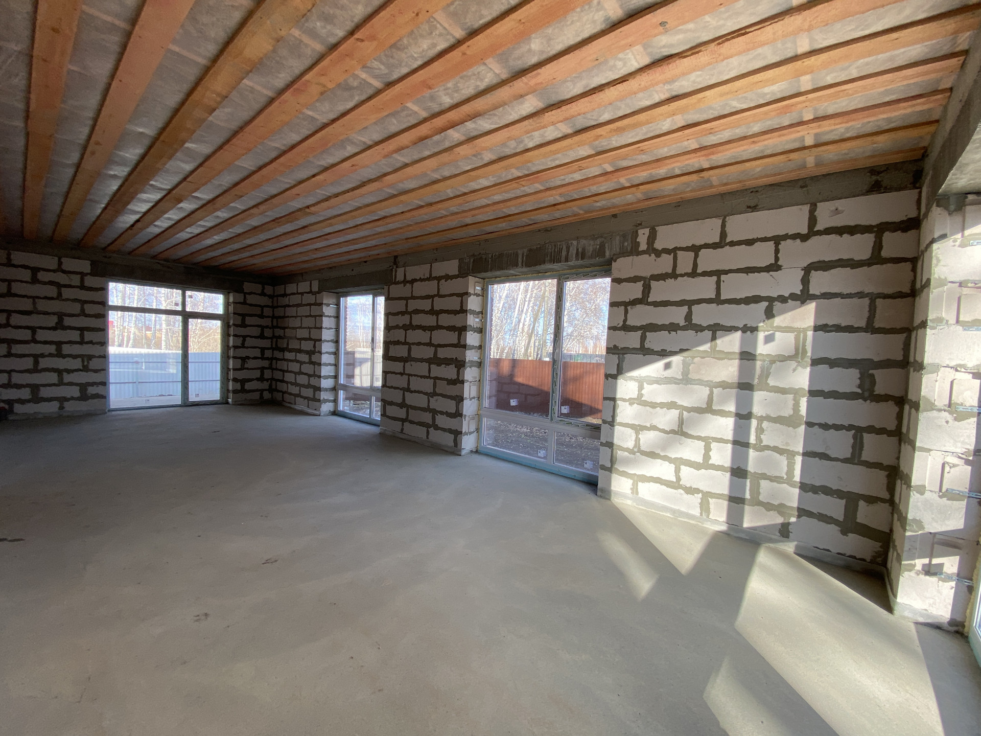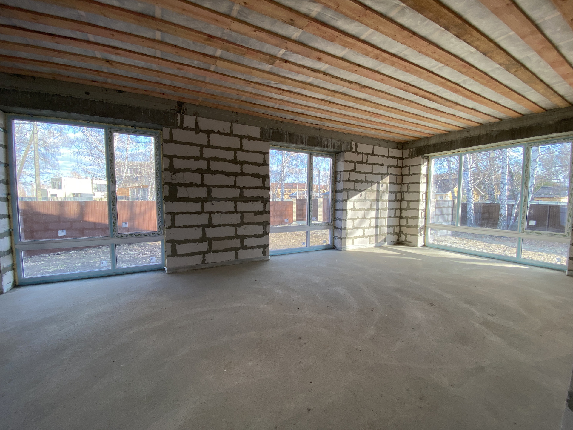 - фундамент: ростверк по бурозаливным сваям глубиной 3.5м (полы обратная засыпка с гидротромбовкой, водяной тёплый пол по всему дому, полусухая стяжка пола, все готово под укладку финишного напольного покрытия), уличная отмостка по периметру;
