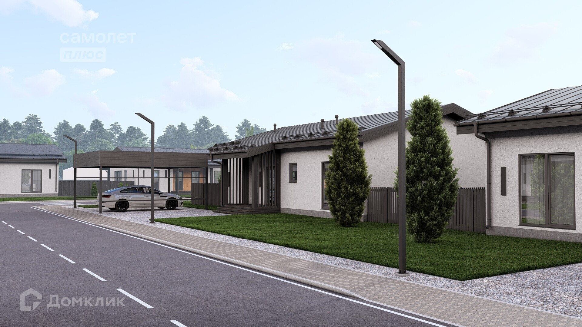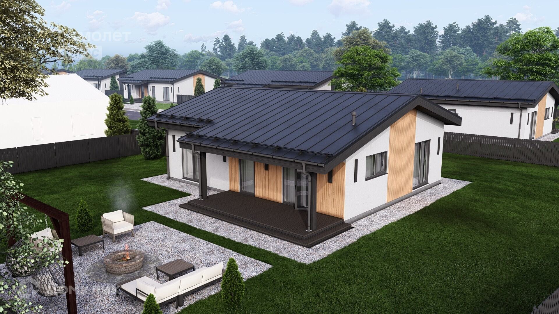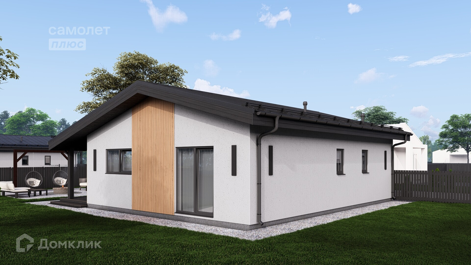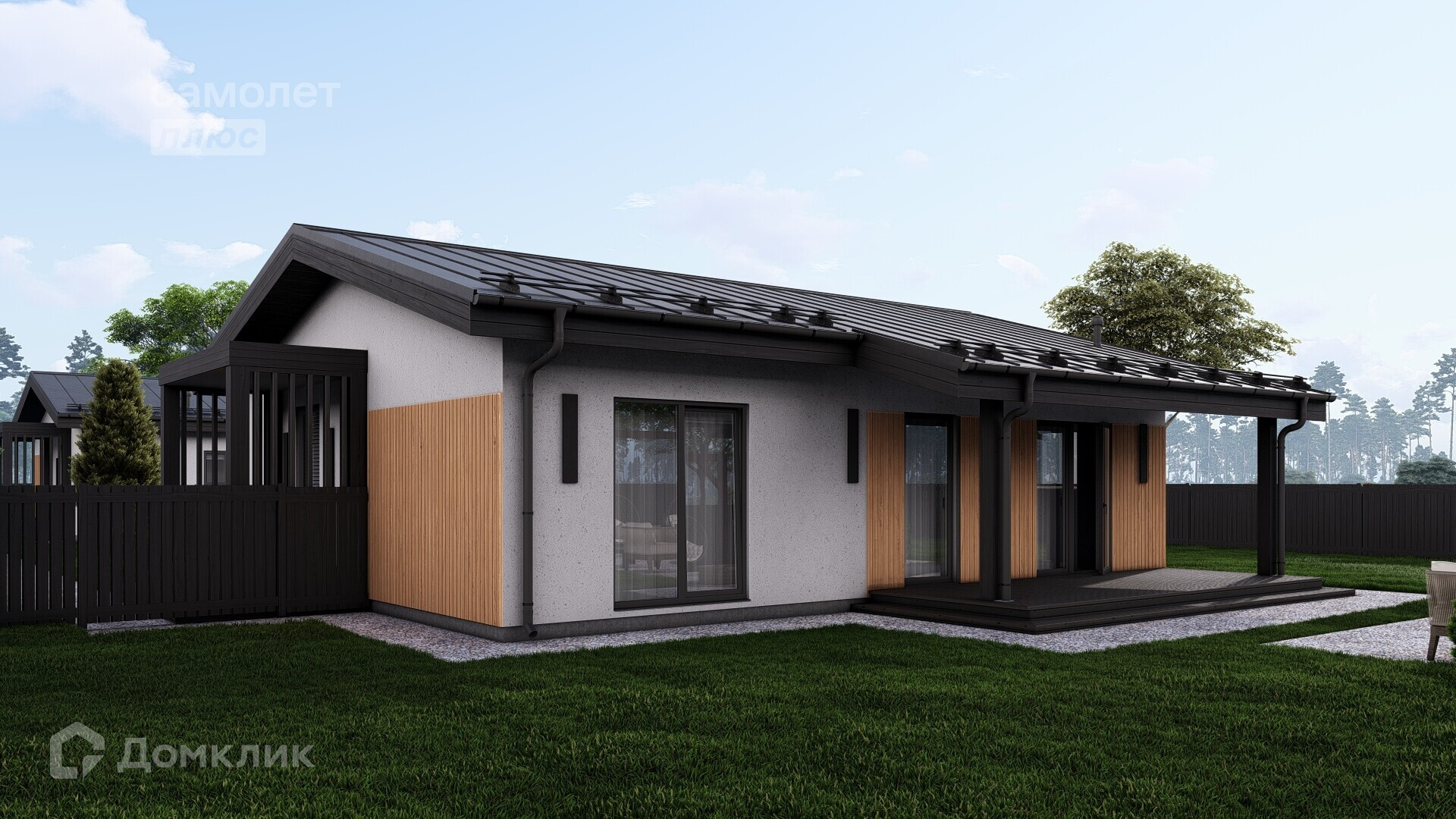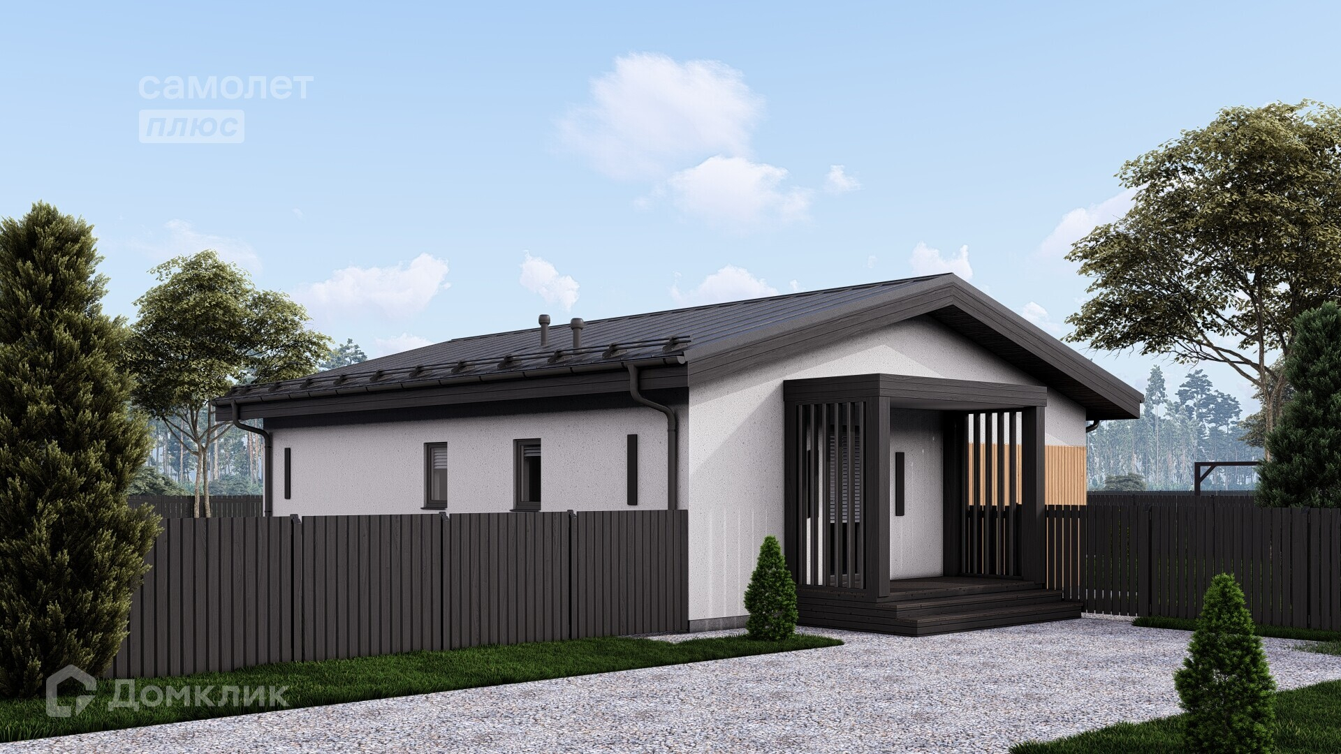 Законченный внешний вид дома, чистовая отделка фасада и кровли, терраса, забор.