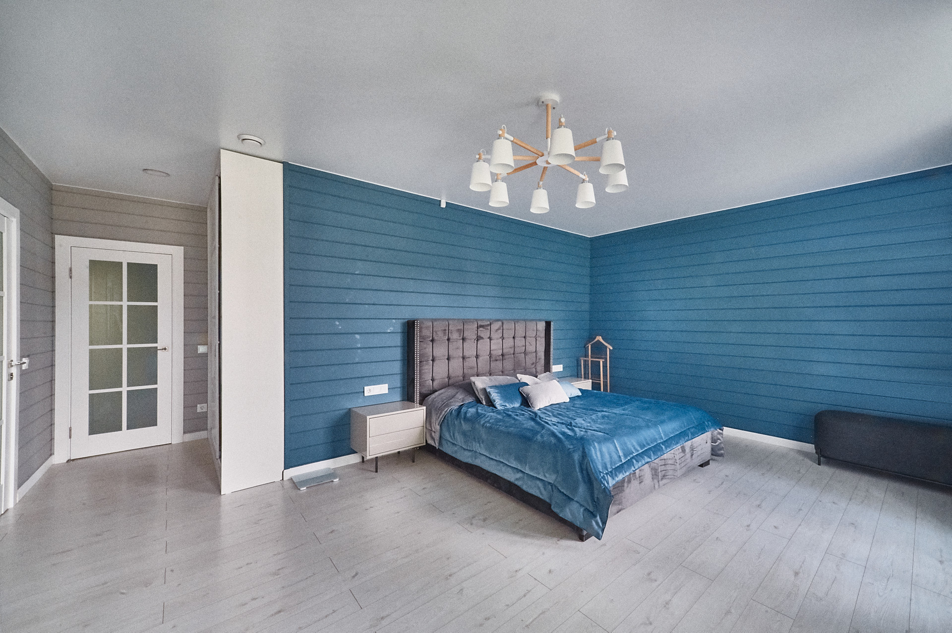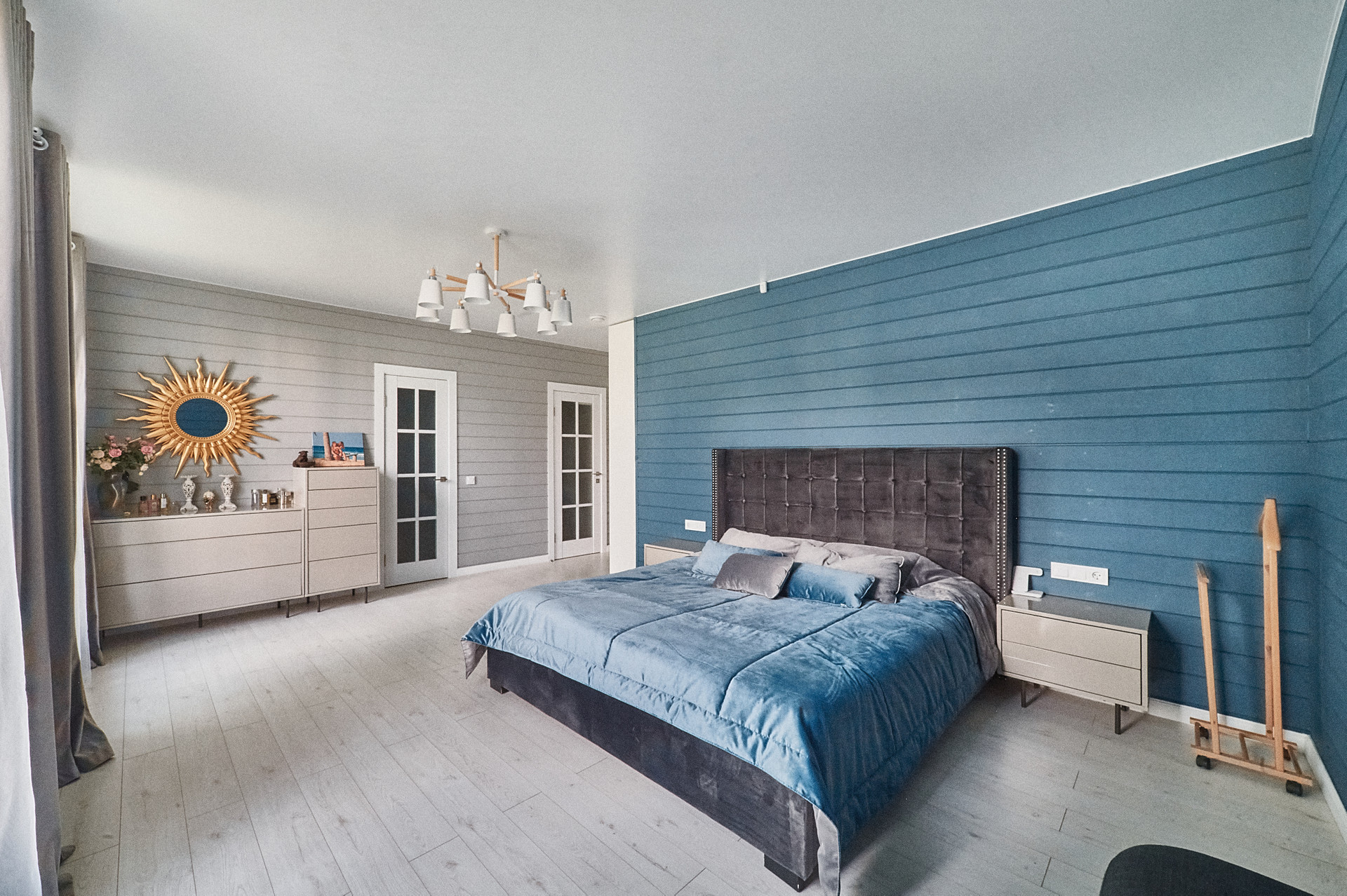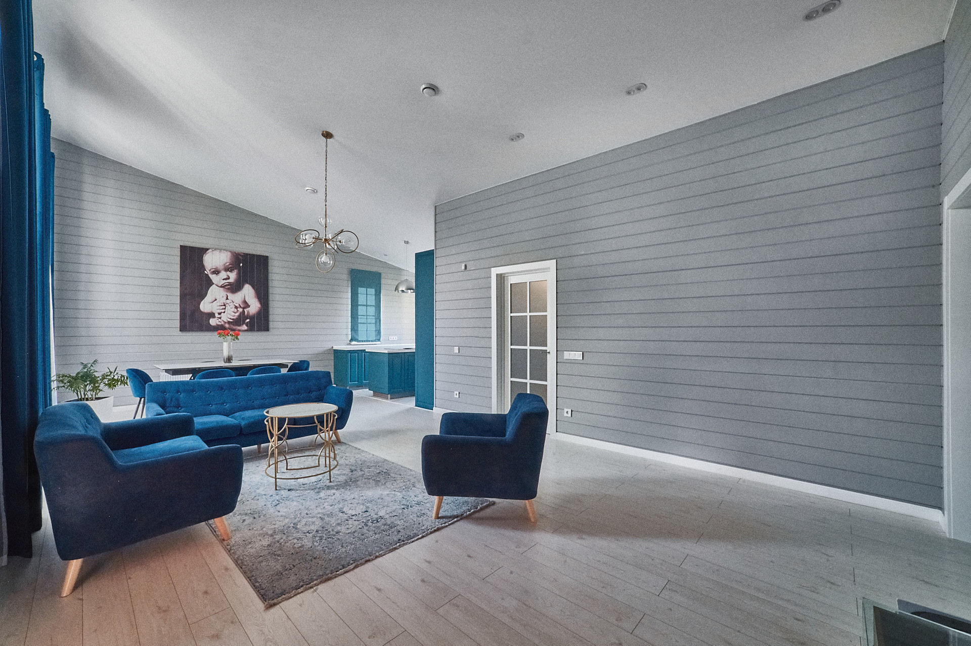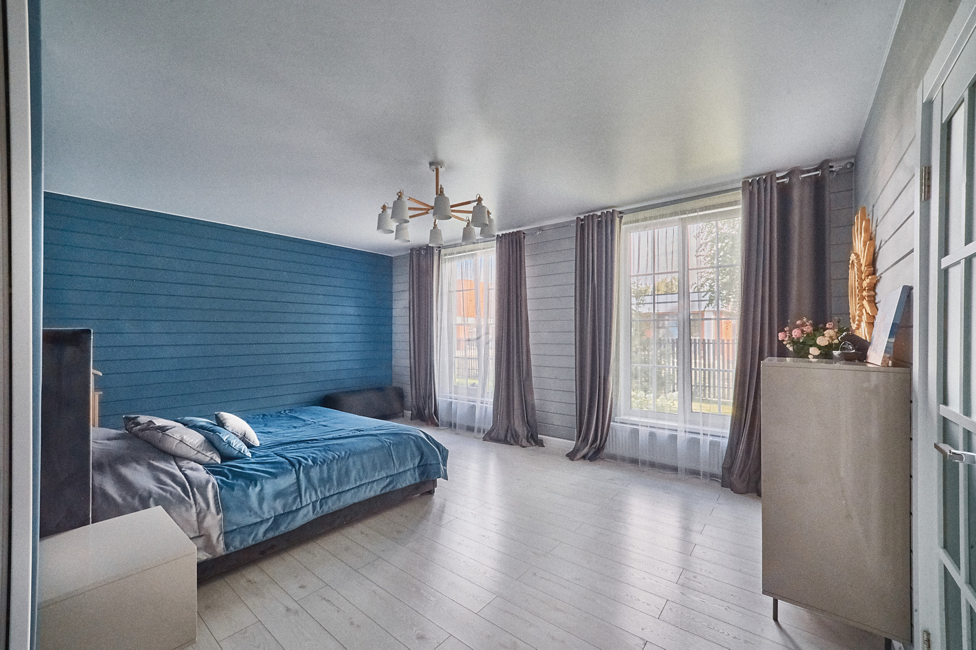 Планировка дома- кухня-гостиная 50 кв.м с панорамными окнами, высота потолка 4.5 м. Мастер спальня 17 кв.м со своим сан.узлом и гардеробной, детская 14 кв.м, оборудована вместительным шкафом, кабинет 15 кв.м. В доме два сан.узла, две гардеробные, бойлерная. На полу паркетная доска, стены- сайдинг + фальш брус.