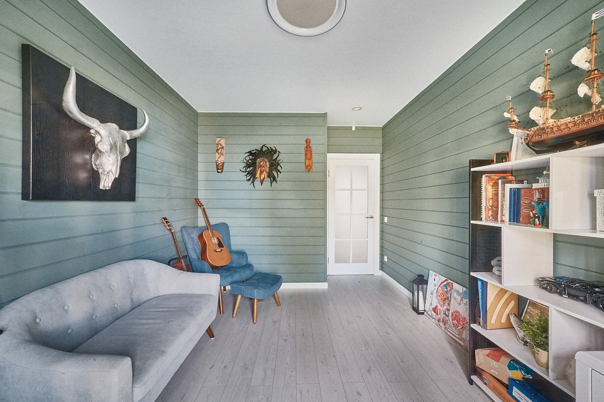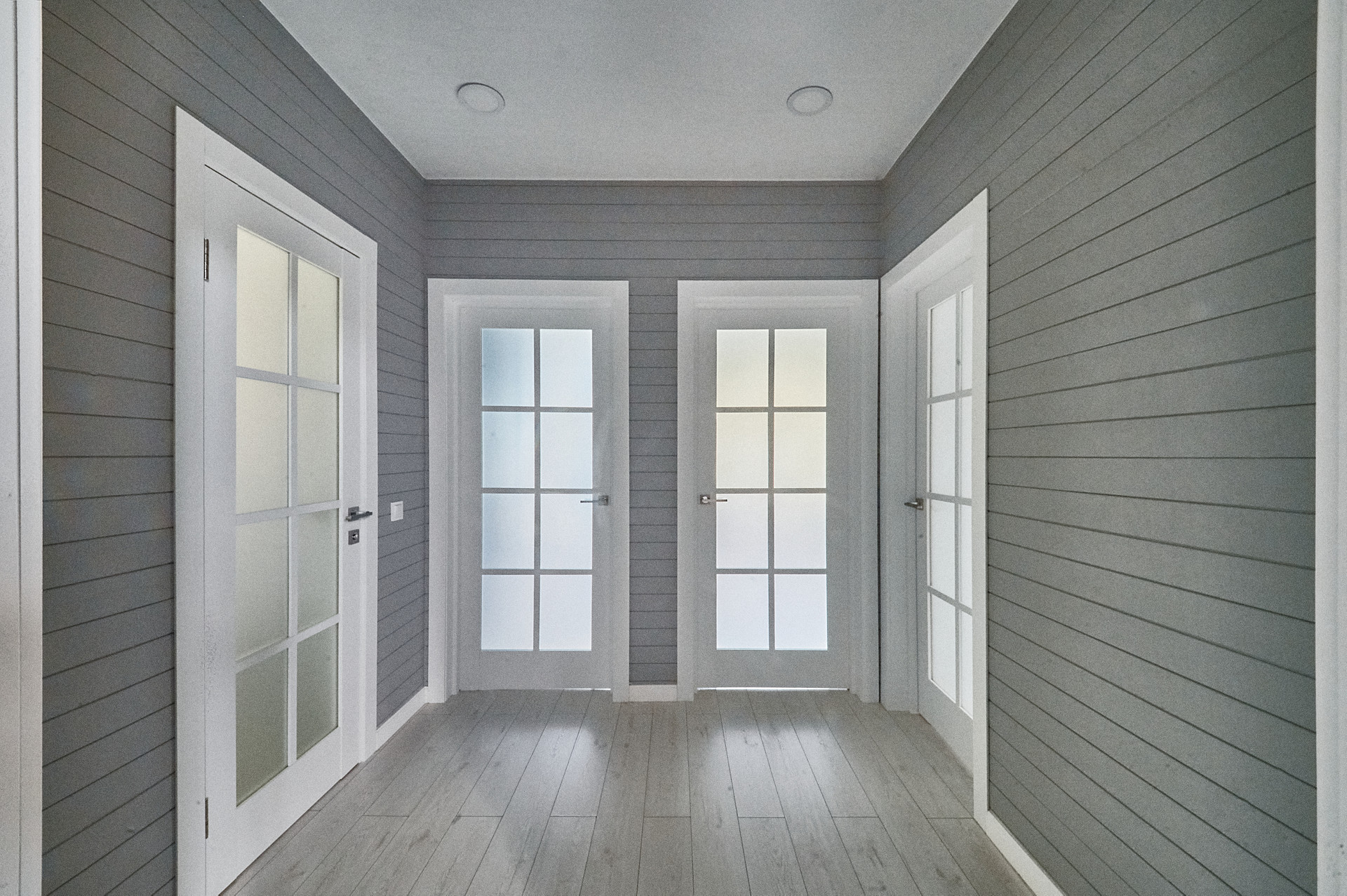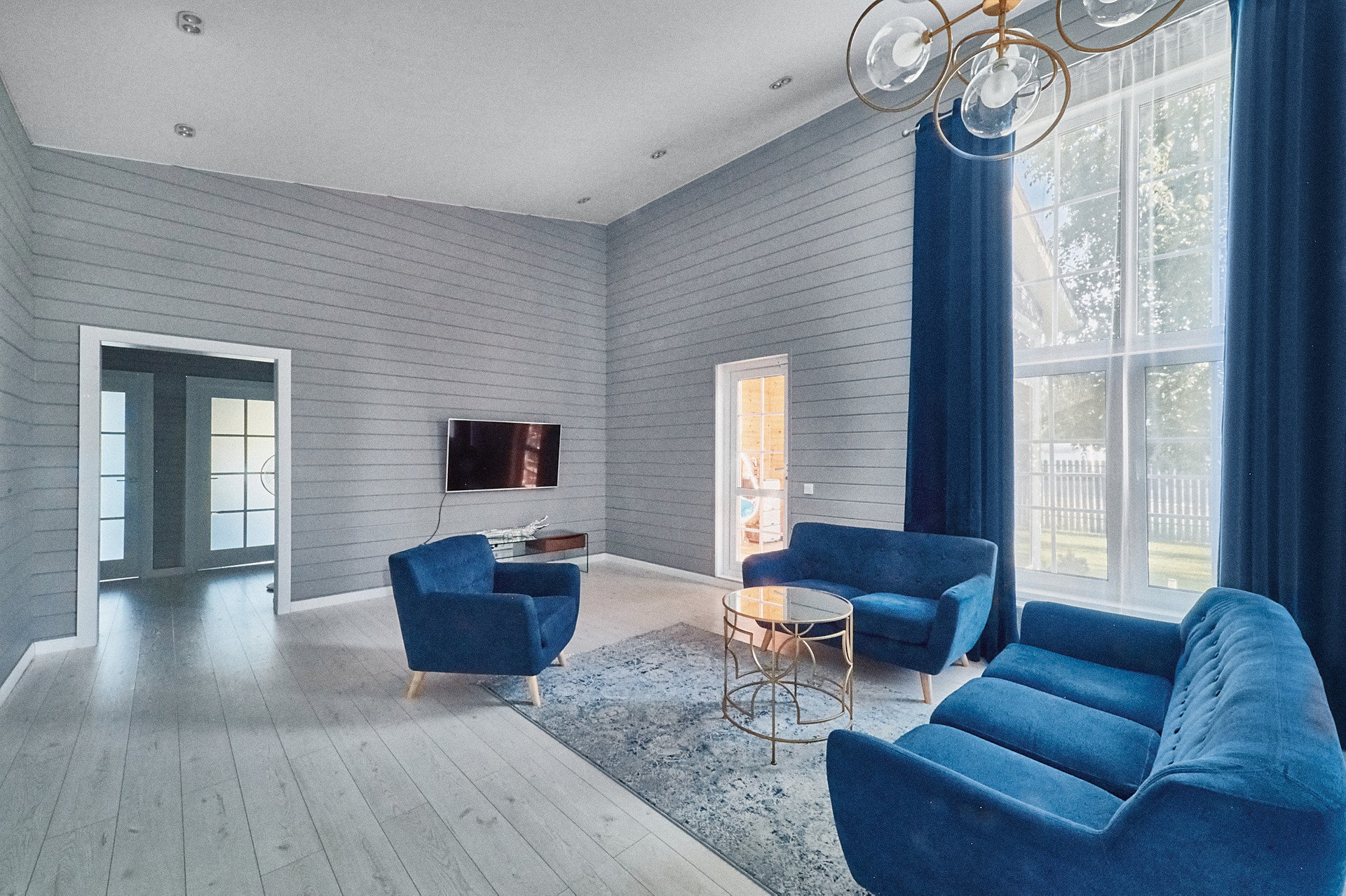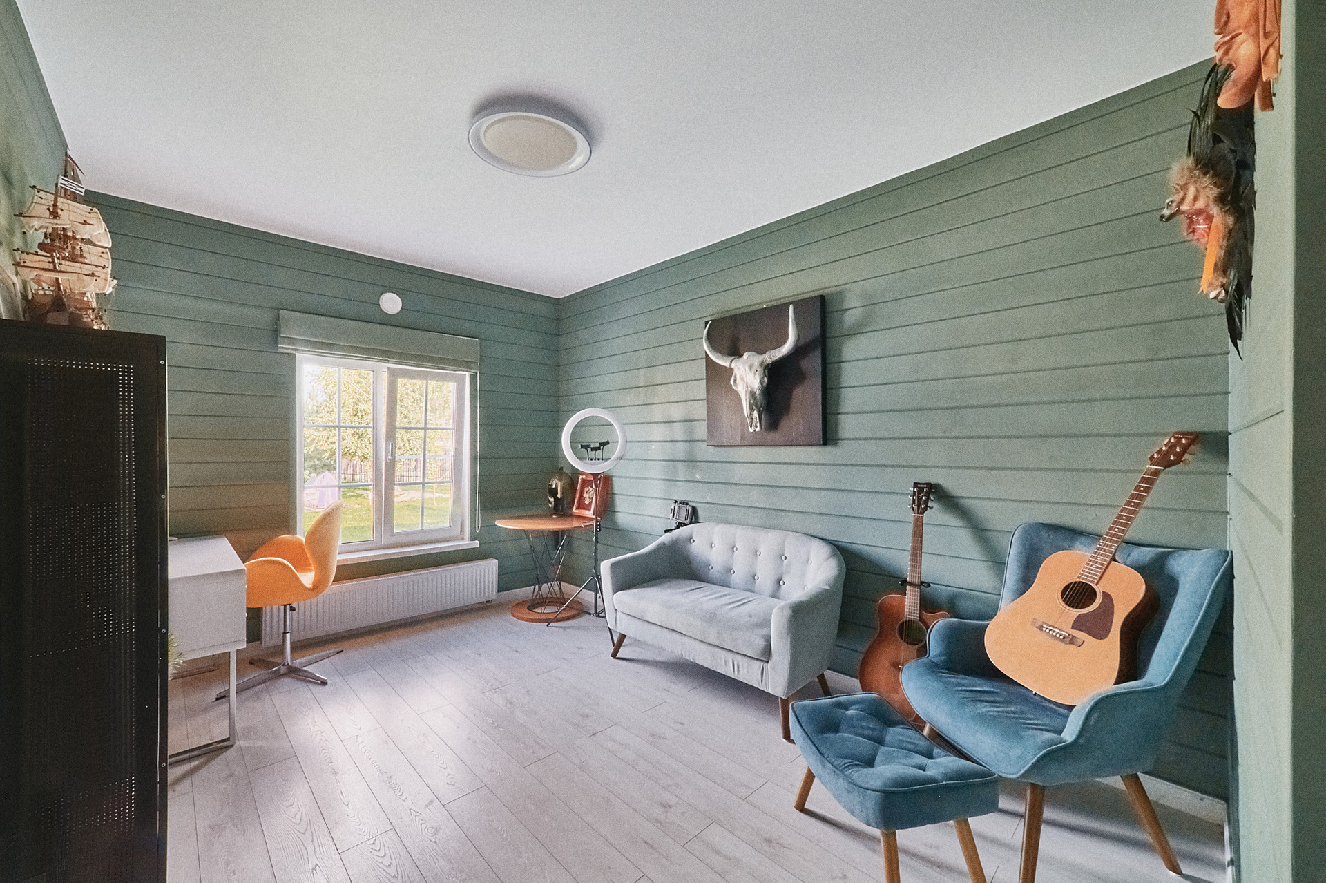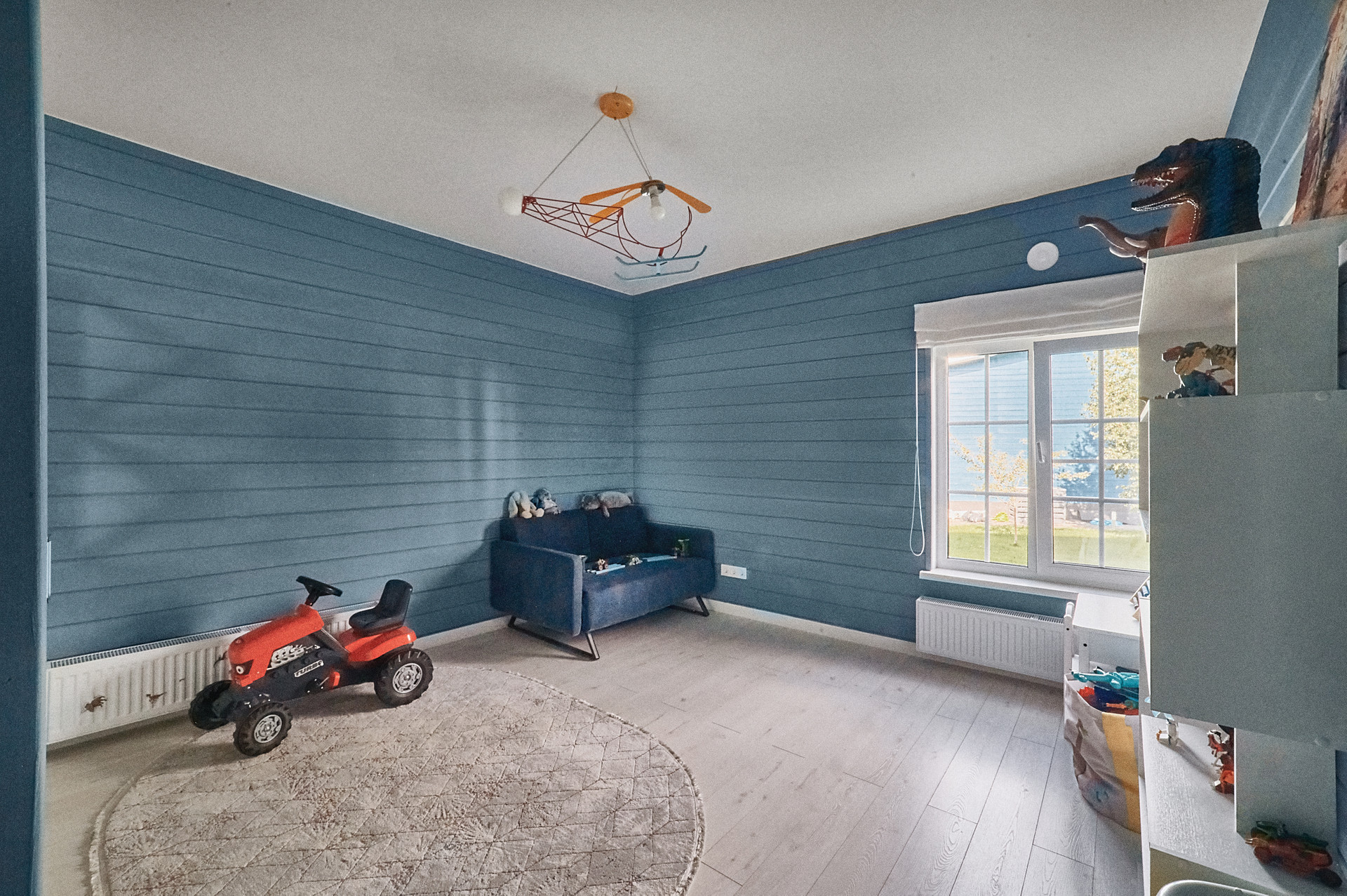 Планировка дома- кухня-гостиная 50 кв.м с панорамными окнами, высота потолка 4.5 м. Мастер спальня 17 кв.м со своим сан.узлом и гардеробной, детская 14 кв.м, оборудована вместительным шкафом, кабинет 15 кв.м. В доме два сан.узла, две гардеробные, бойлерная. На полу паркетная доска, стены- сайдинг + фальш брус.