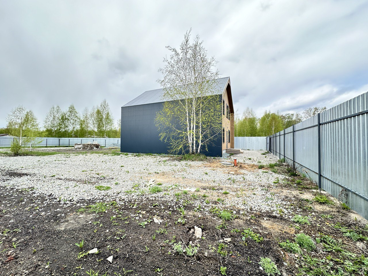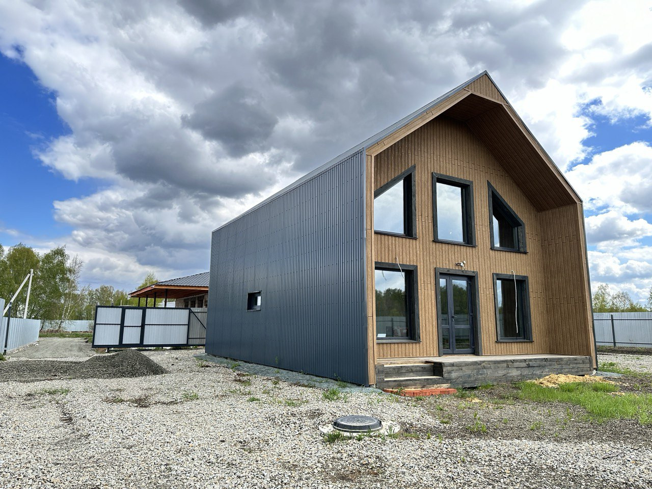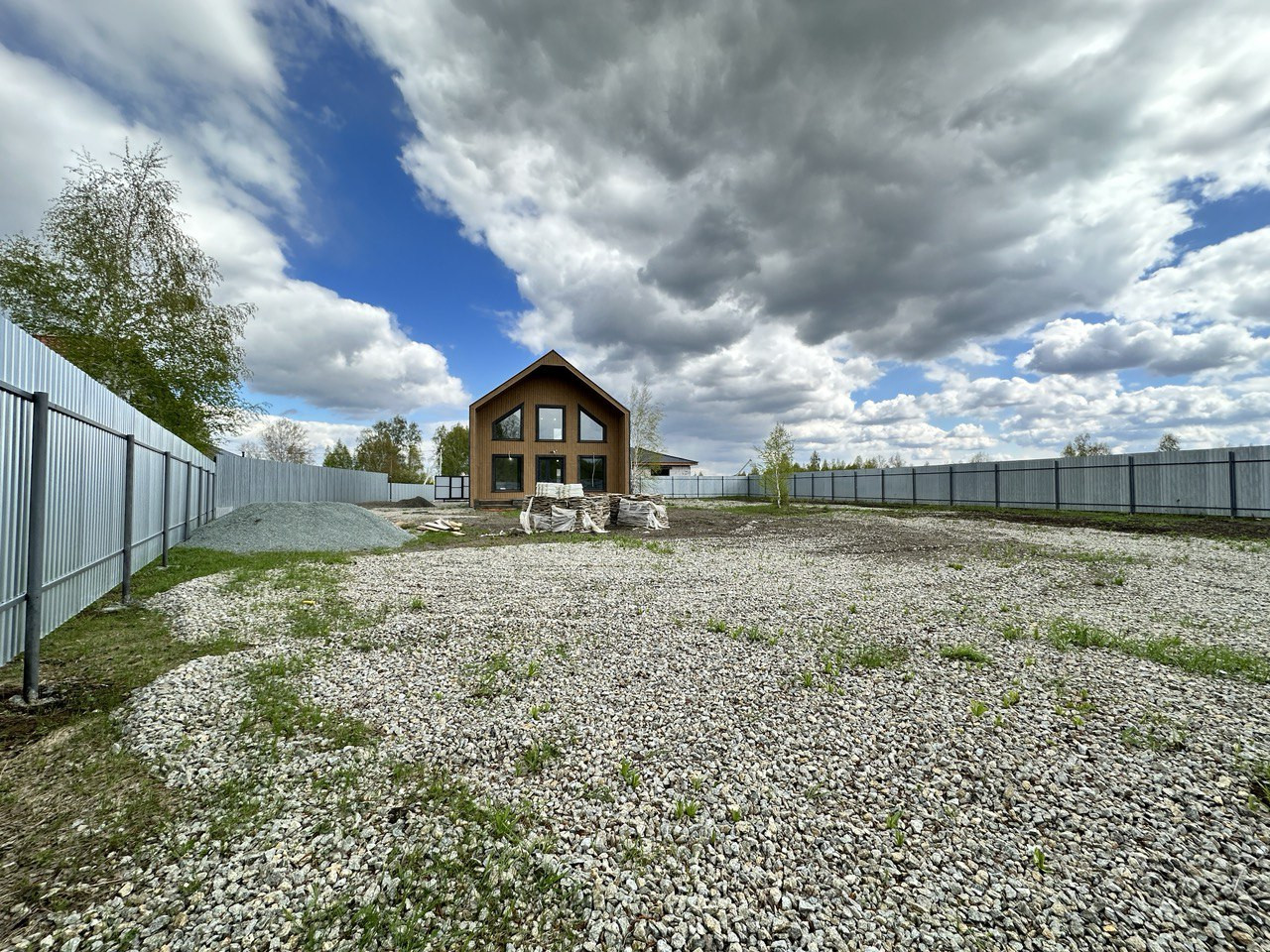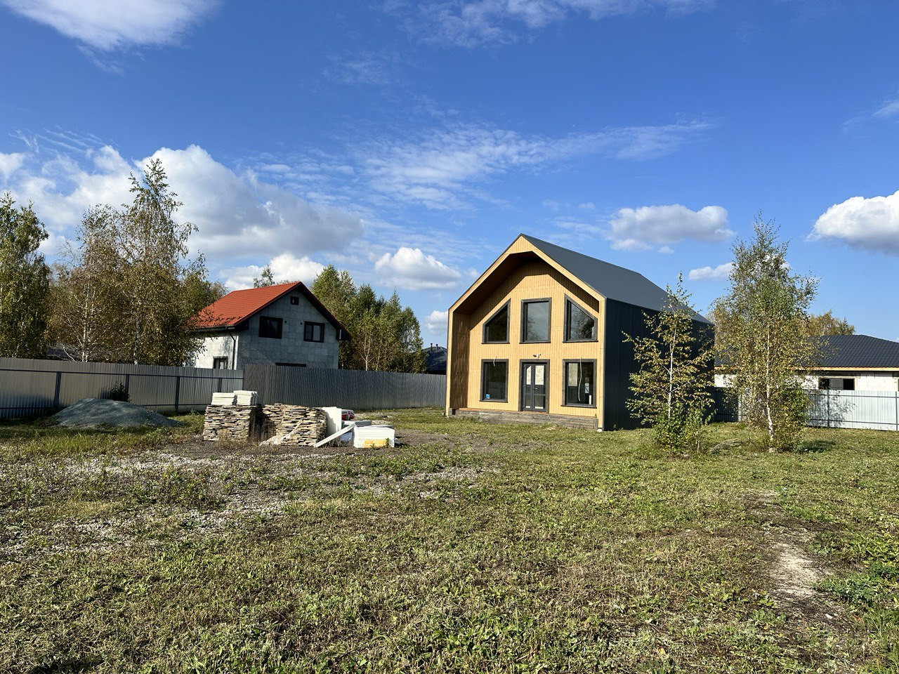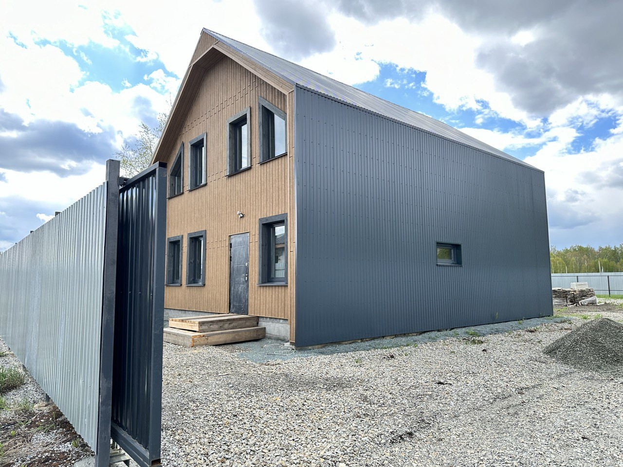 На данном этапе завершены работы по фасадной отделке дома, подготовлено крыльцо и терраса, участок полностью огорожен, откатные ворота на въезд. Уникальность земельного участка предполагает собственный заезд (можно использовать как гараж, стоянку для автомобилей).