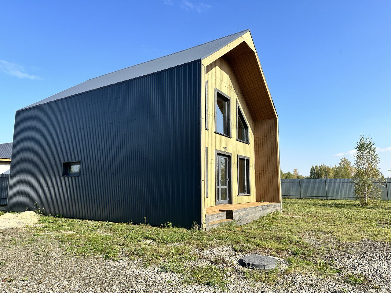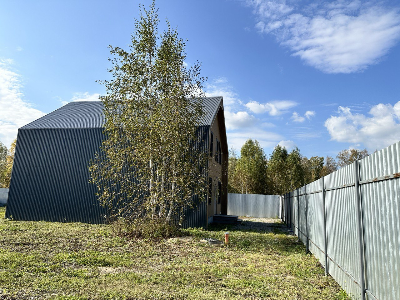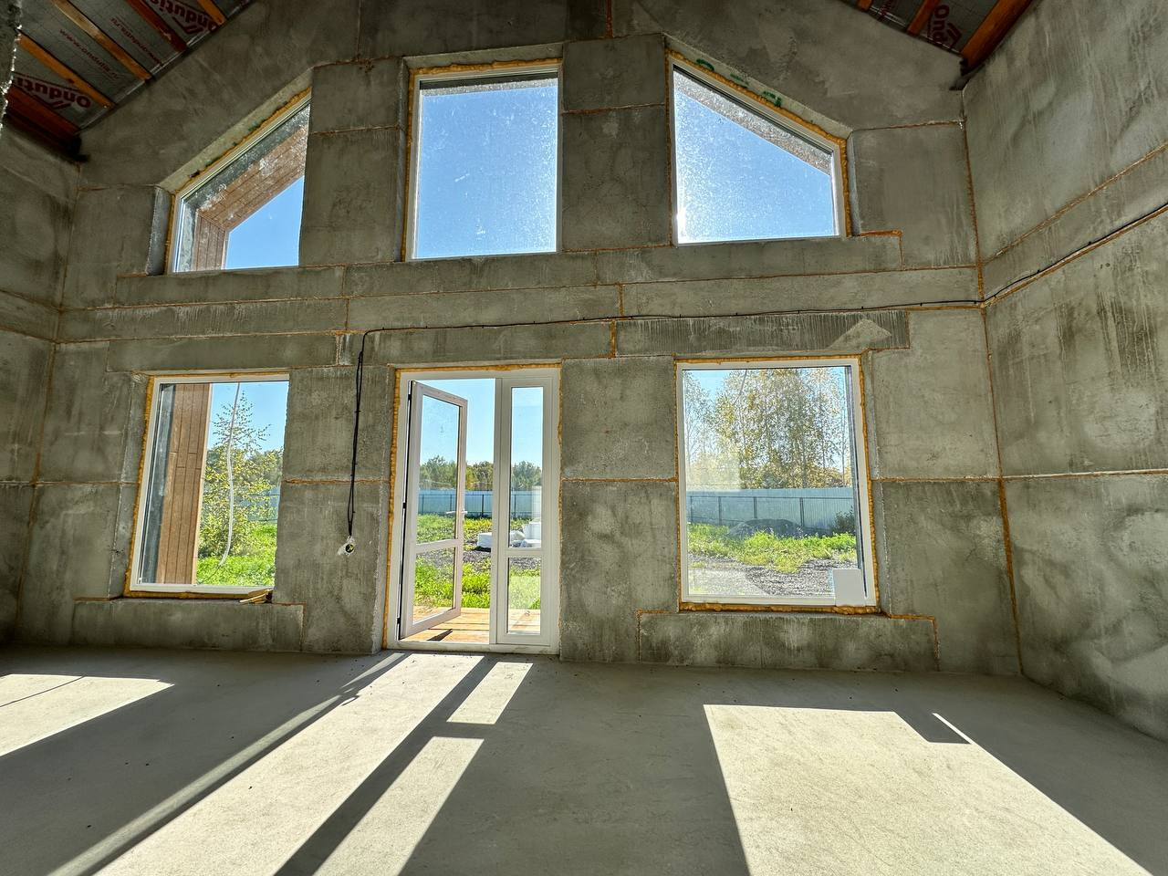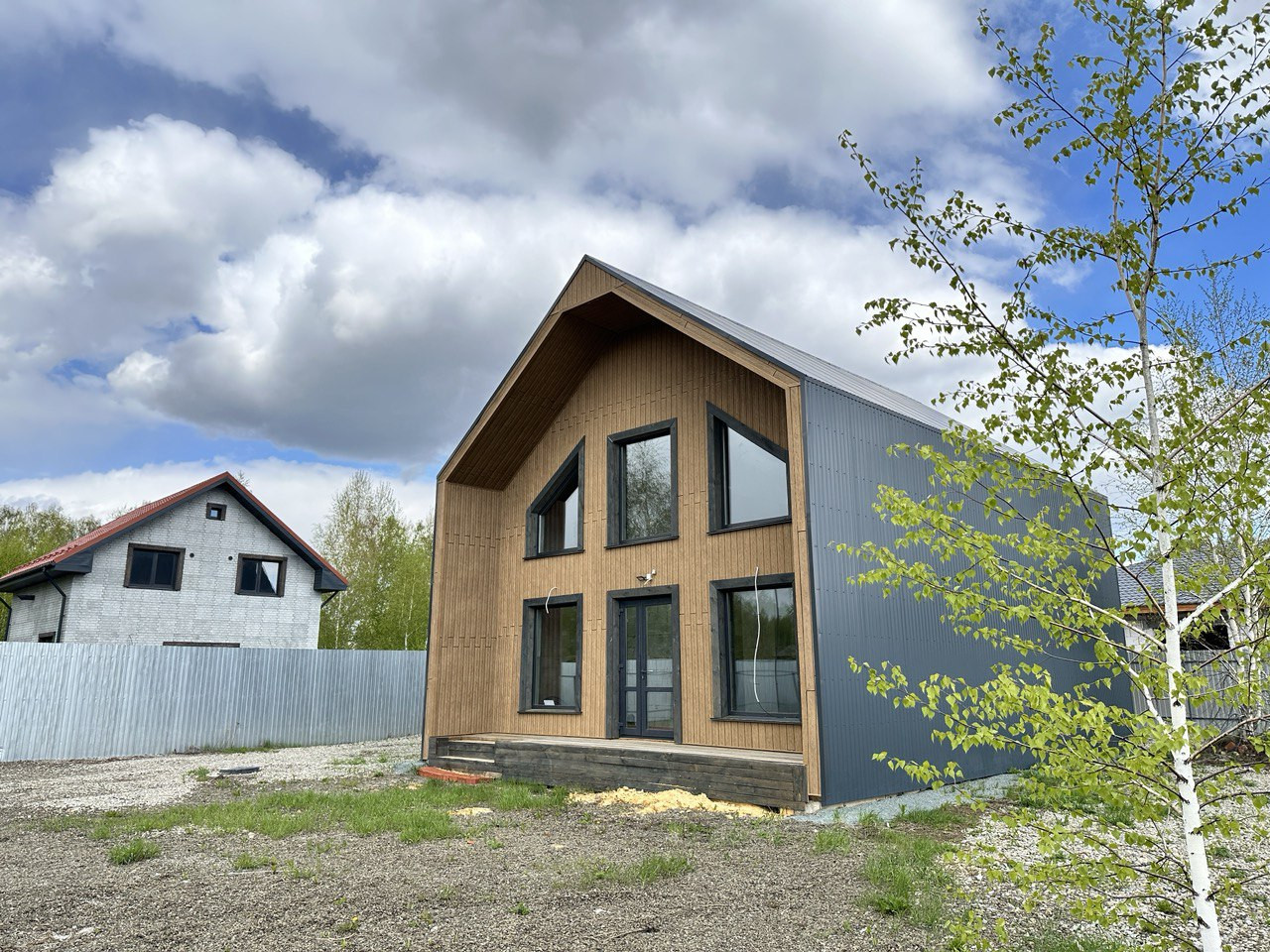 На данном этапе завершены работы по фасадной отделке дома, подготовлено крыльцо и терраса, участок полностью огорожен, откатные ворота на въезд. Уникальность земельного участка предполагает собственный заезд (можно использовать как гараж, стоянку для автомобилей).