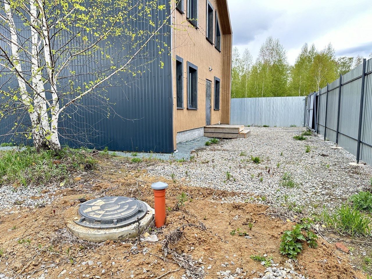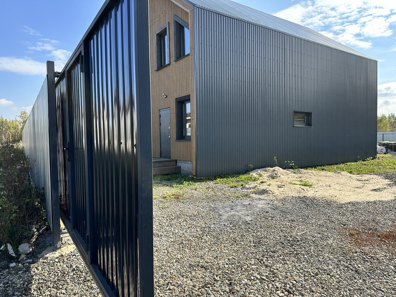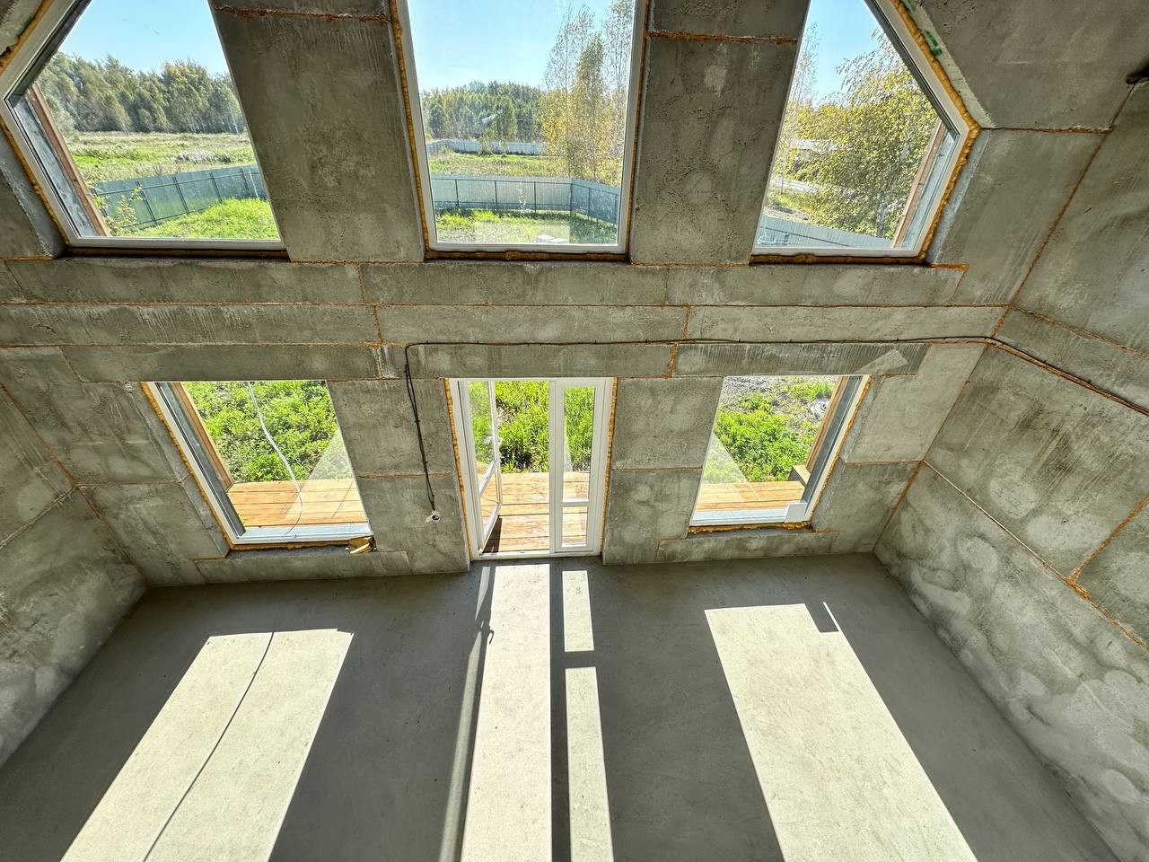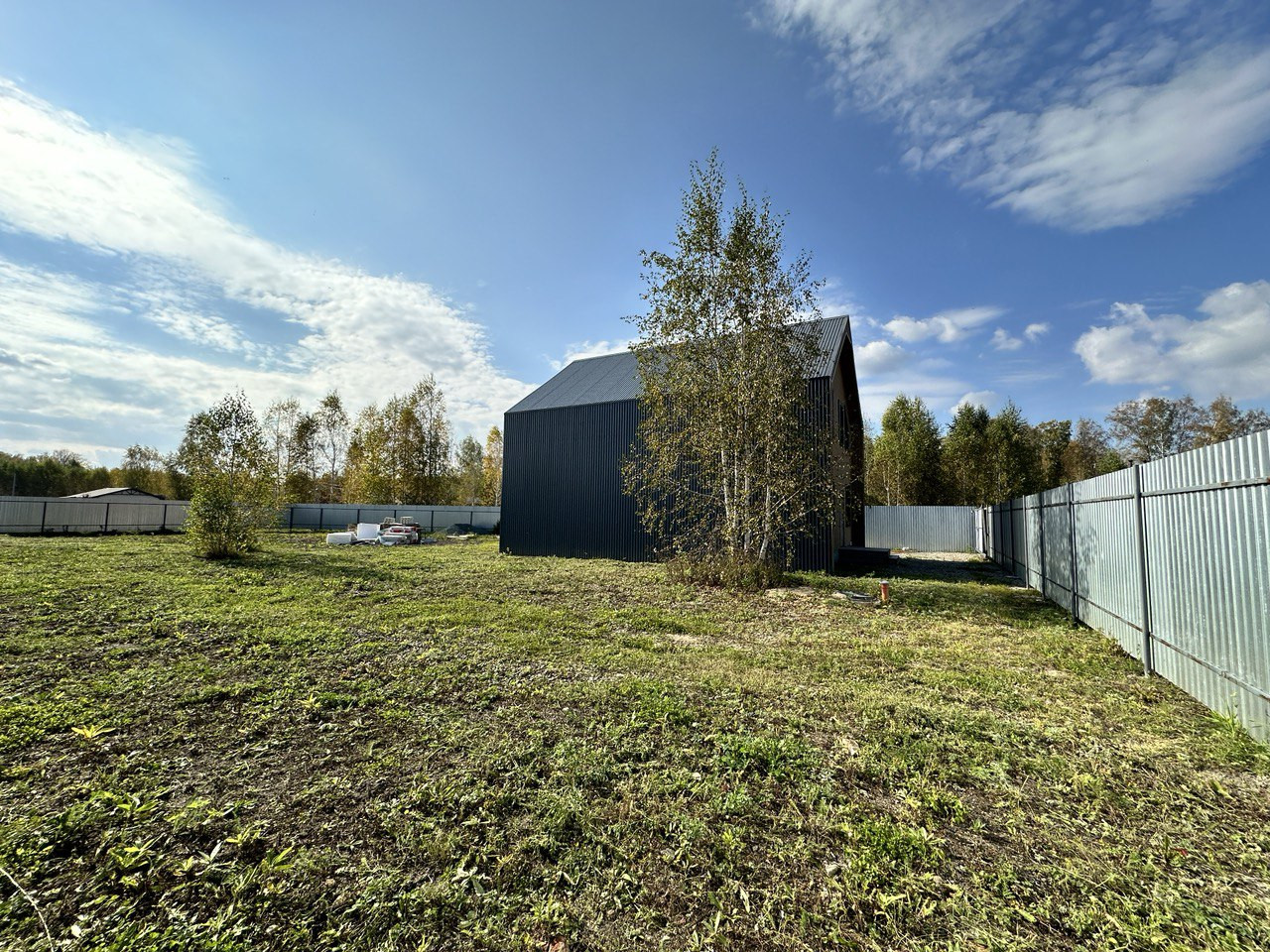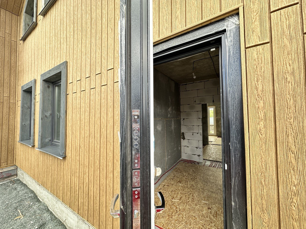 На данном этапе завершены работы по фасадной отделке дома, подготовлено крыльцо и терраса, участок полностью огорожен, откатные ворота на въезд. Уникальность земельного участка предполагает собственный заезд (можно использовать как гараж, стоянку для автомобилей).