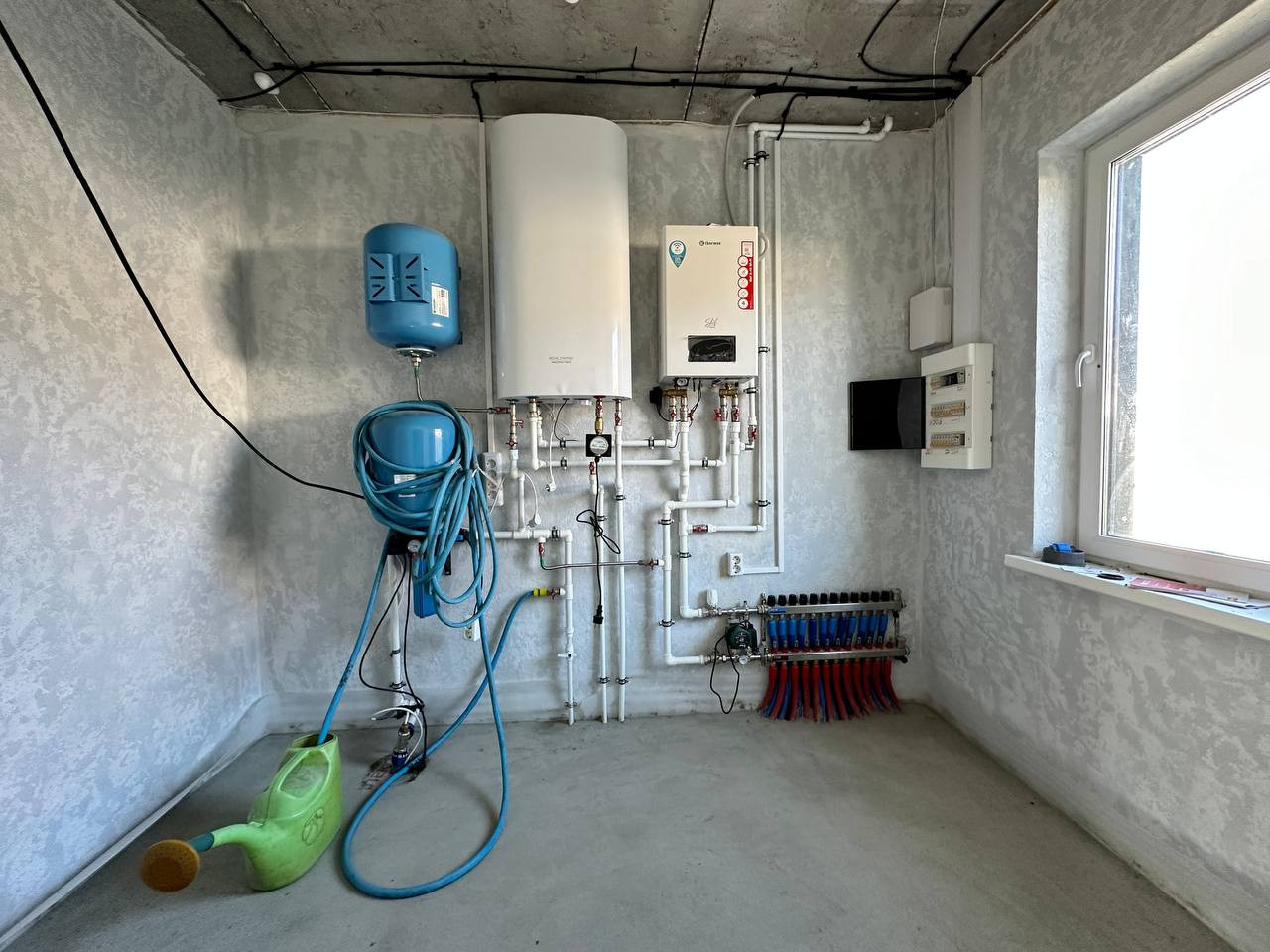 Подключен электрокотел TERMEX 12,6 кВт - замеры потребления за отопление не превышают 6-7 т.р./мес. Выполнена полная разводка отопления и водоснабжения по "мокрым точкам" в доме. Полы подготовлены под полусухую стяжку на первом этаже и готовы под чистовую на втором этаже.