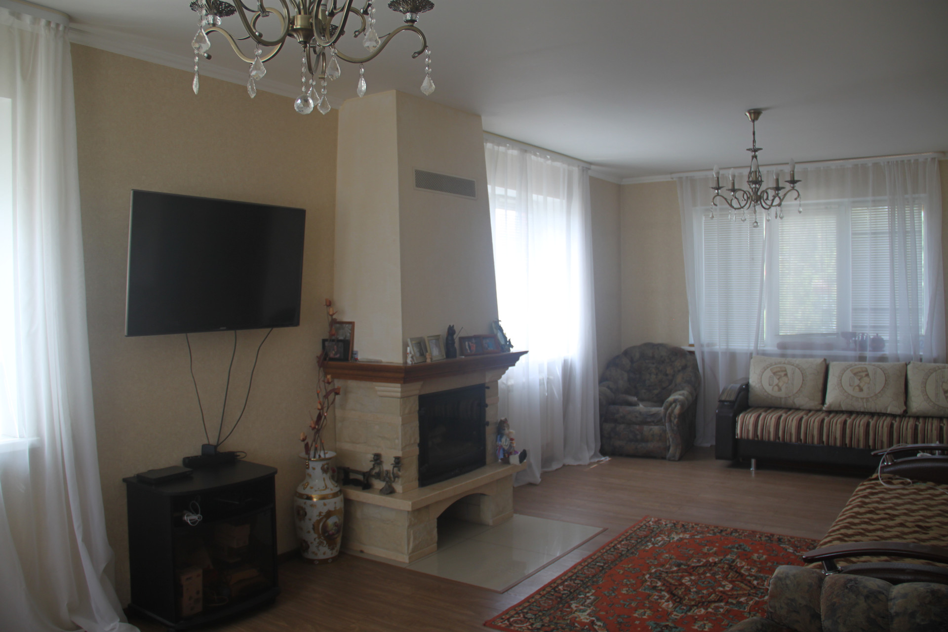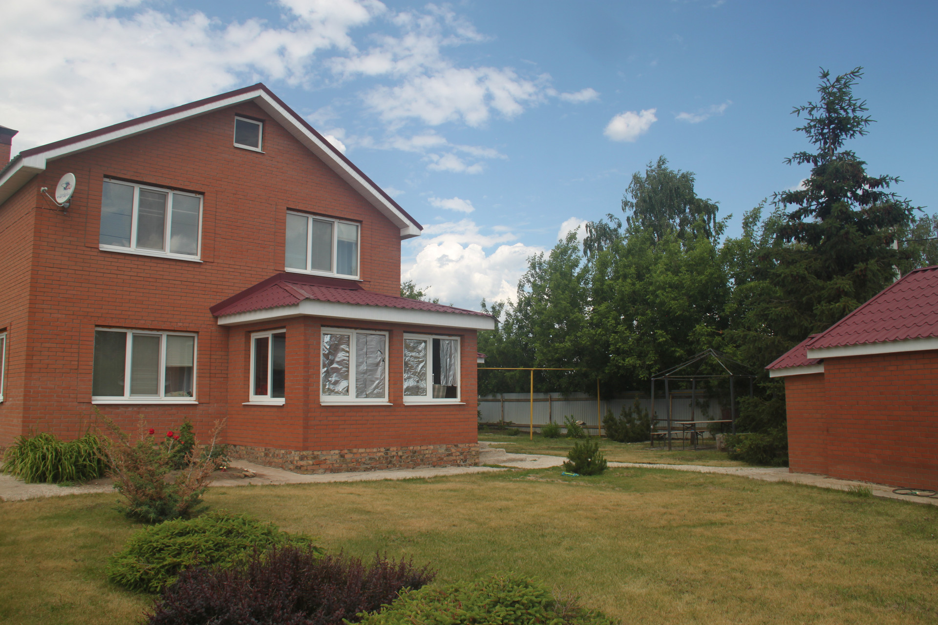 На участке 15 соток двухэтажный кирпичный дом с гаражом (есть электричество, водопровод, газ, горячая вода и отопление - газовый котел, камин). Отдельностоящая баня (кирпич). Подъездная асфальтированная дорога до дома. Река Кинель в шаговой доступности. Участок благоустроен.