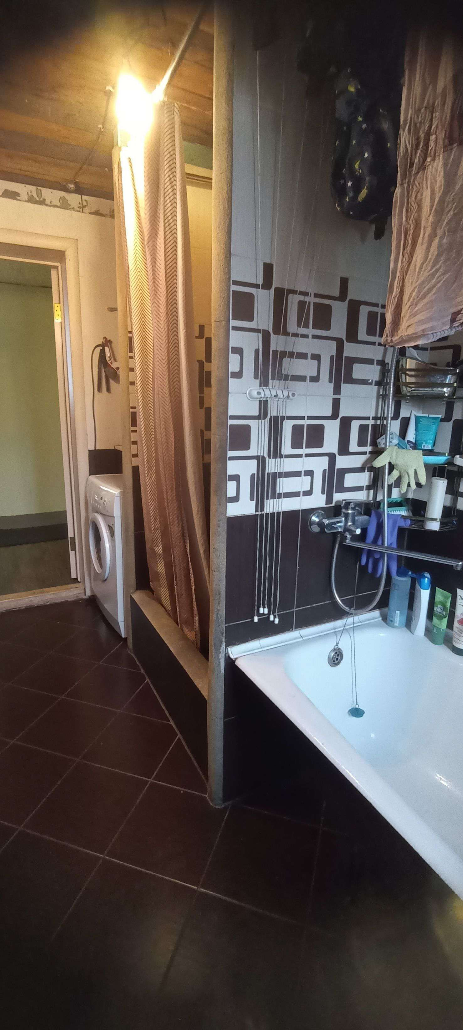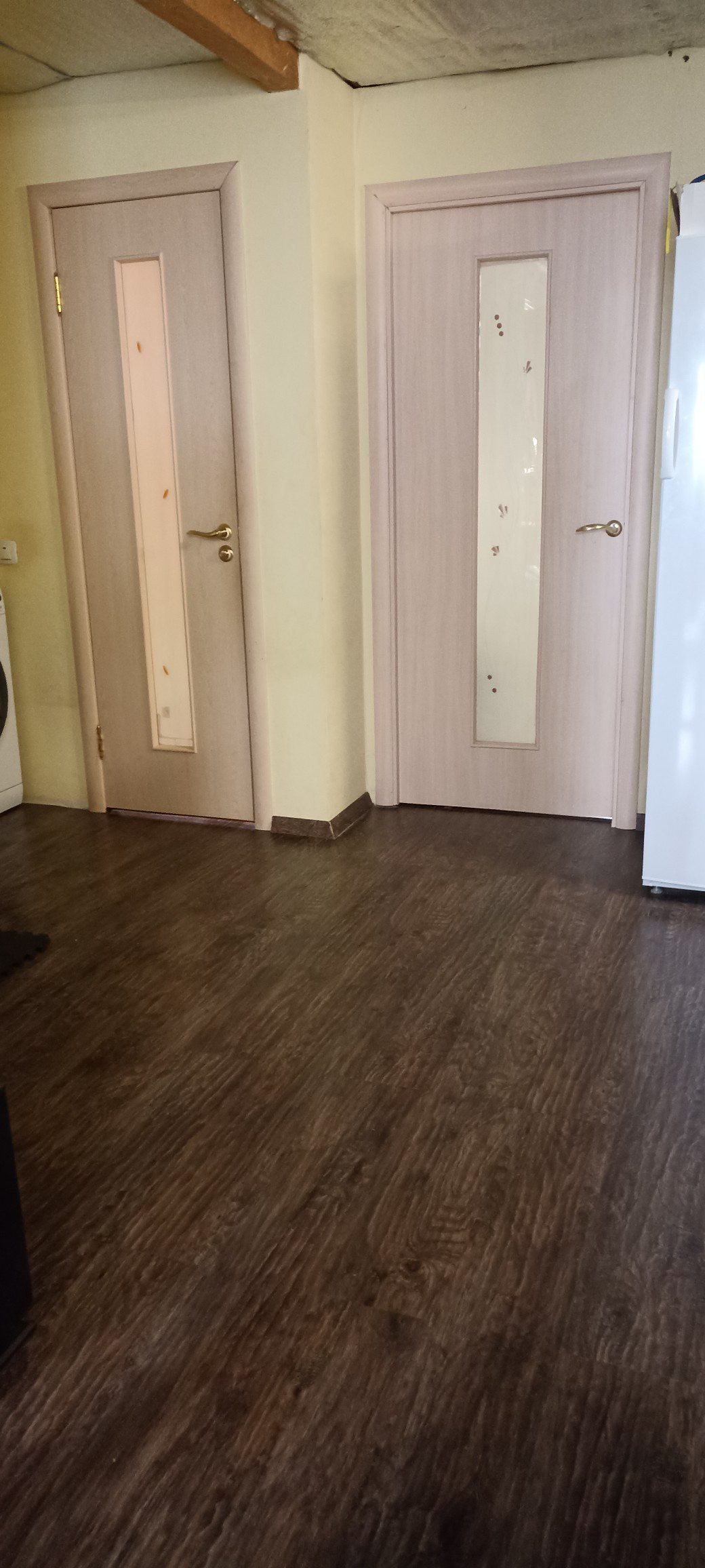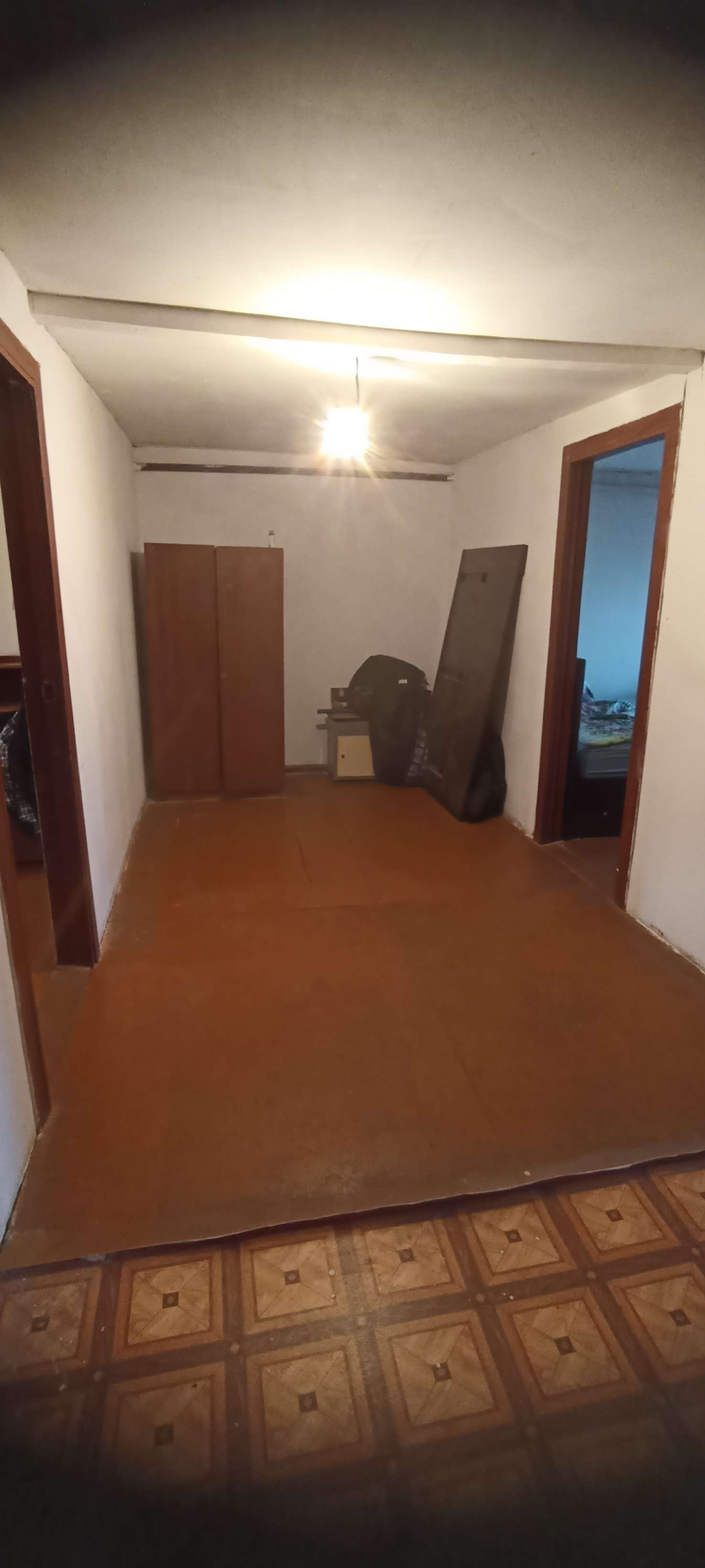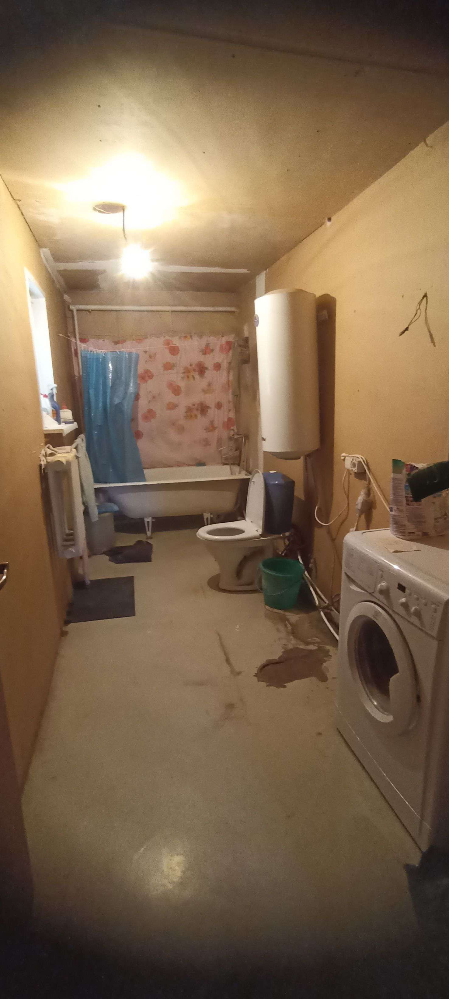 Первая квартира: гостиная-столовая 33м²,санузел совмещенный 8 м²(ванная, душевая, унитаз и место для стиральной машины, комната 15 м². На полу хорошего качества ламинат, на стенах обои под покраску, санузел весь выложен плиткой. Не сделаны потолки в связи с планируемой стройкой второго этажа. По плану часть потолка в гостиной убирается и открывается вид на второй этаж с перилами. В каждой половине дома есть подпол, со стеллажами для хранения овощей и консервации. В подарок останется часть мебели: встроенный шкаф, кровать двухспальная, барная стойка со стульями, диван, возможно кухонный гарнитур, письменный/компьютерный угловой стол и стул, шкаф - всё в одном стиле.