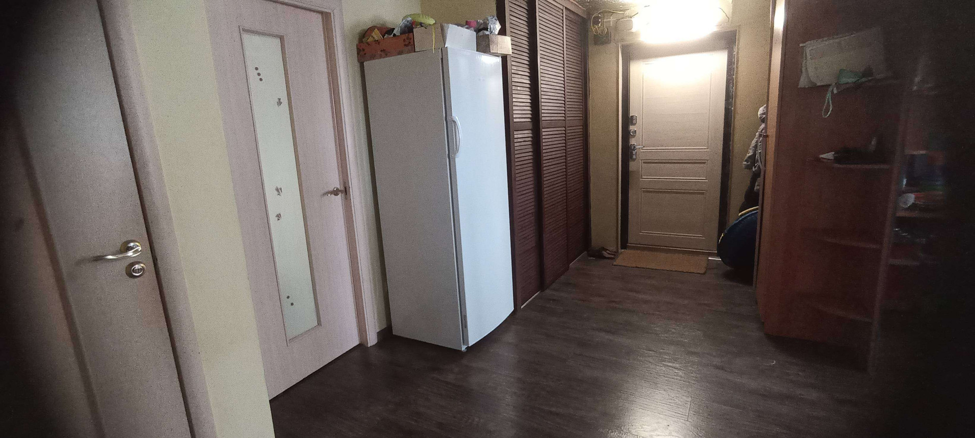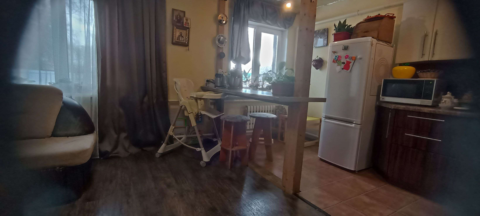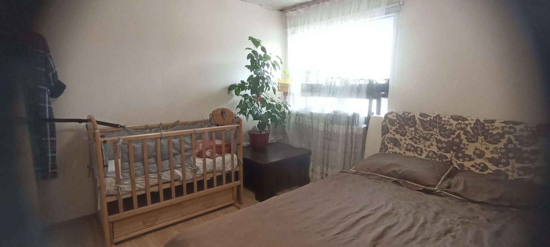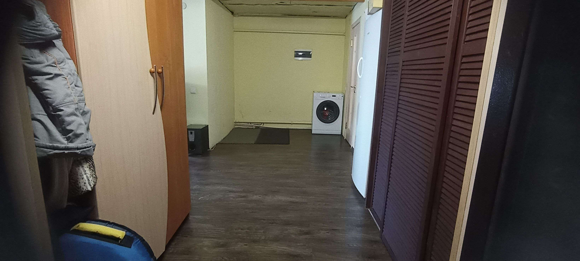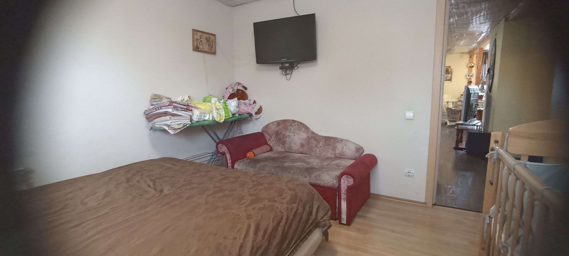 Первая квартира: гостиная-столовая 33м²,санузел совмещенный 8 м²(ванная, душевая, унитаз и место для стиральной машины, комната 15 м². На полу хорошего качества ламинат, на стенах обои под покраску, санузел весь выложен плиткой. Не сделаны потолки в связи с планируемой стройкой второго этажа. По плану часть потолка в гостиной убирается и открывается вид на второй этаж с перилами. В каждой половине дома есть подпол, со стеллажами для хранения овощей и консервации. В подарок останется часть мебели: встроенный шкаф, кровать двухспальная, барная стойка со стульями, диван, возможно кухонный гарнитур, письменный/компьютерный угловой стол и стул, шкаф - всё в одном стиле.