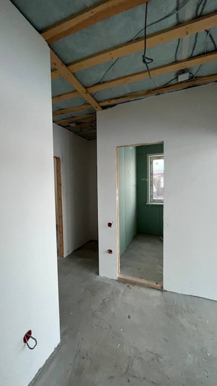 Современная планировка дома, общей площадью 85 кв.м., гостиная совмещенная с кухней-30 кв.м., ванная- 6 кв.м., жилые комнаты- 9,35 кв.м. и 11,65 кв.м., возможность выхода из гостиной на террасу.