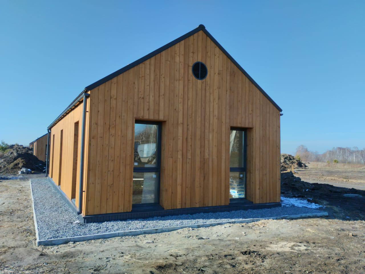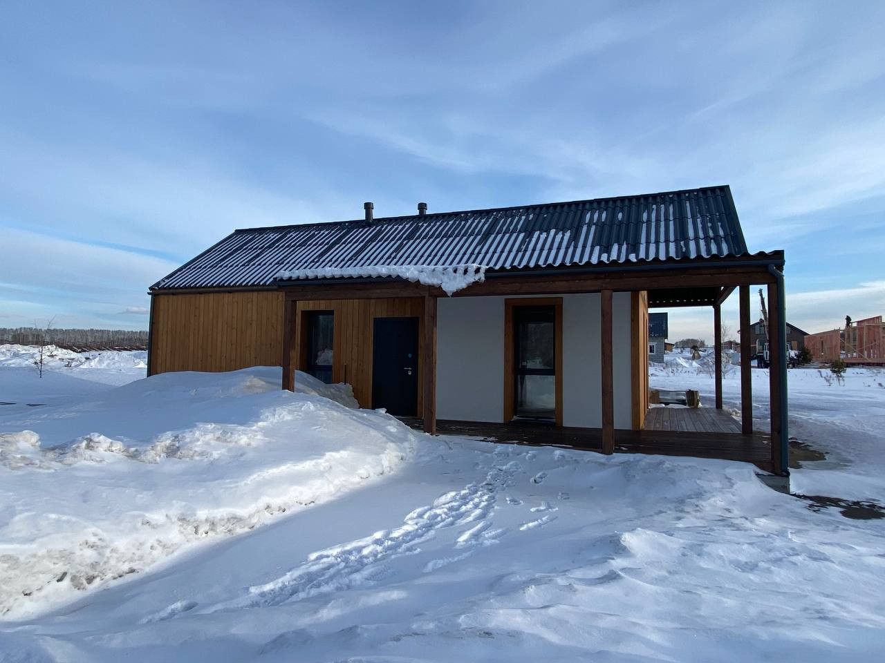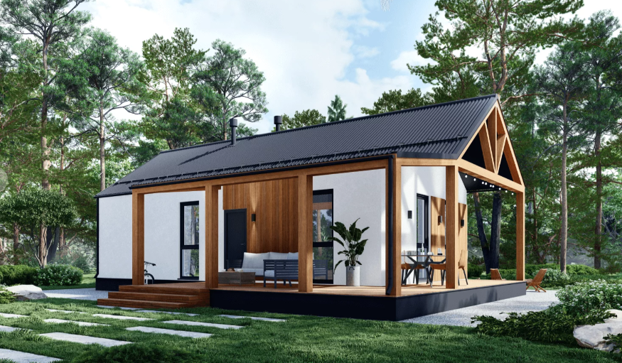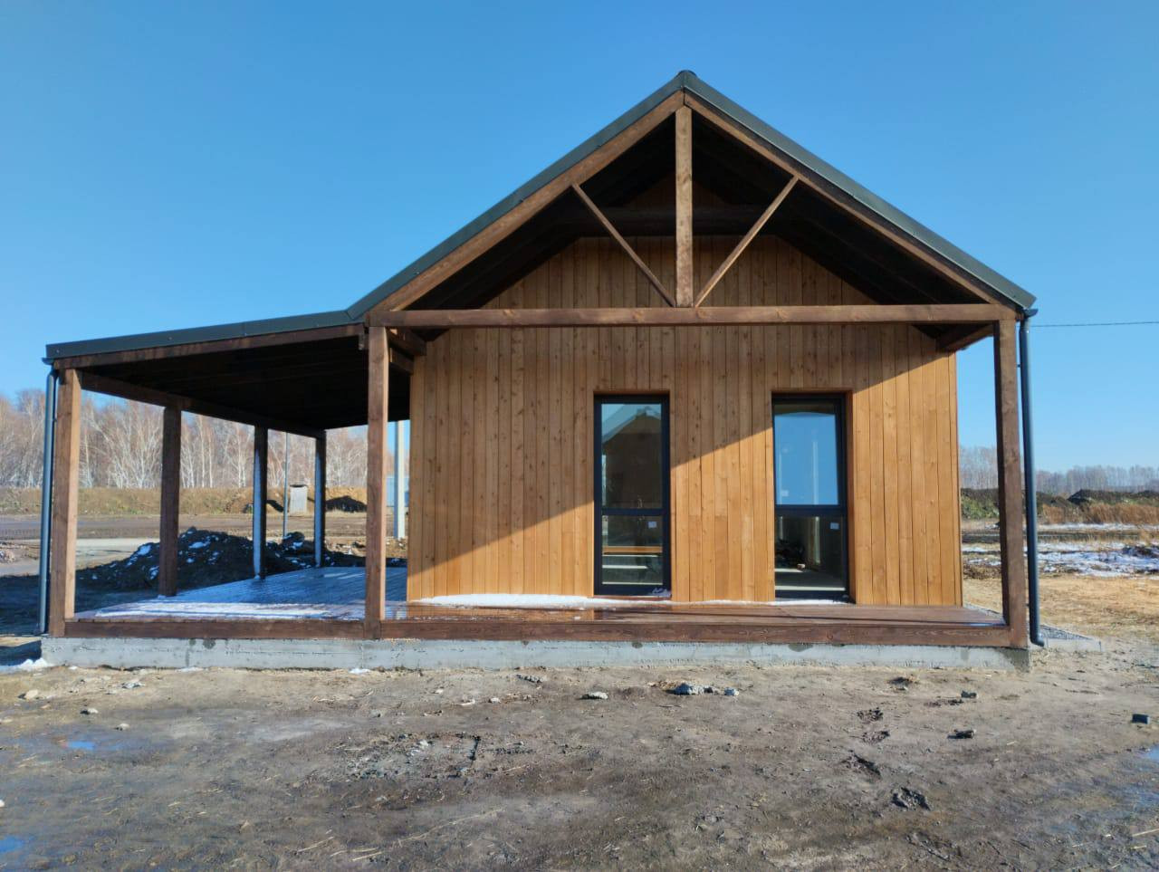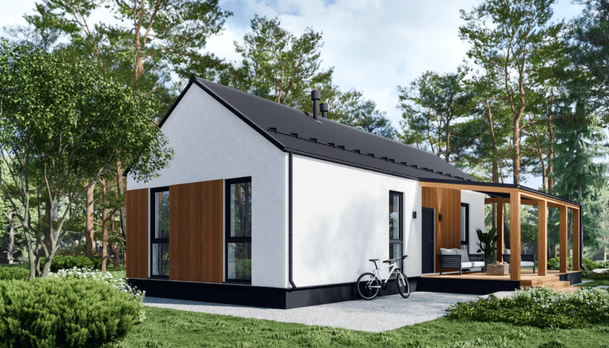 Современный 1 этажный дом с 2 спальнями, 90м2 (вкл. террасу из лиственницы 35м2), каркасный дом с утеплителем из SLM панелей. Толщина стен – 400мм (40см). Высота 3м.