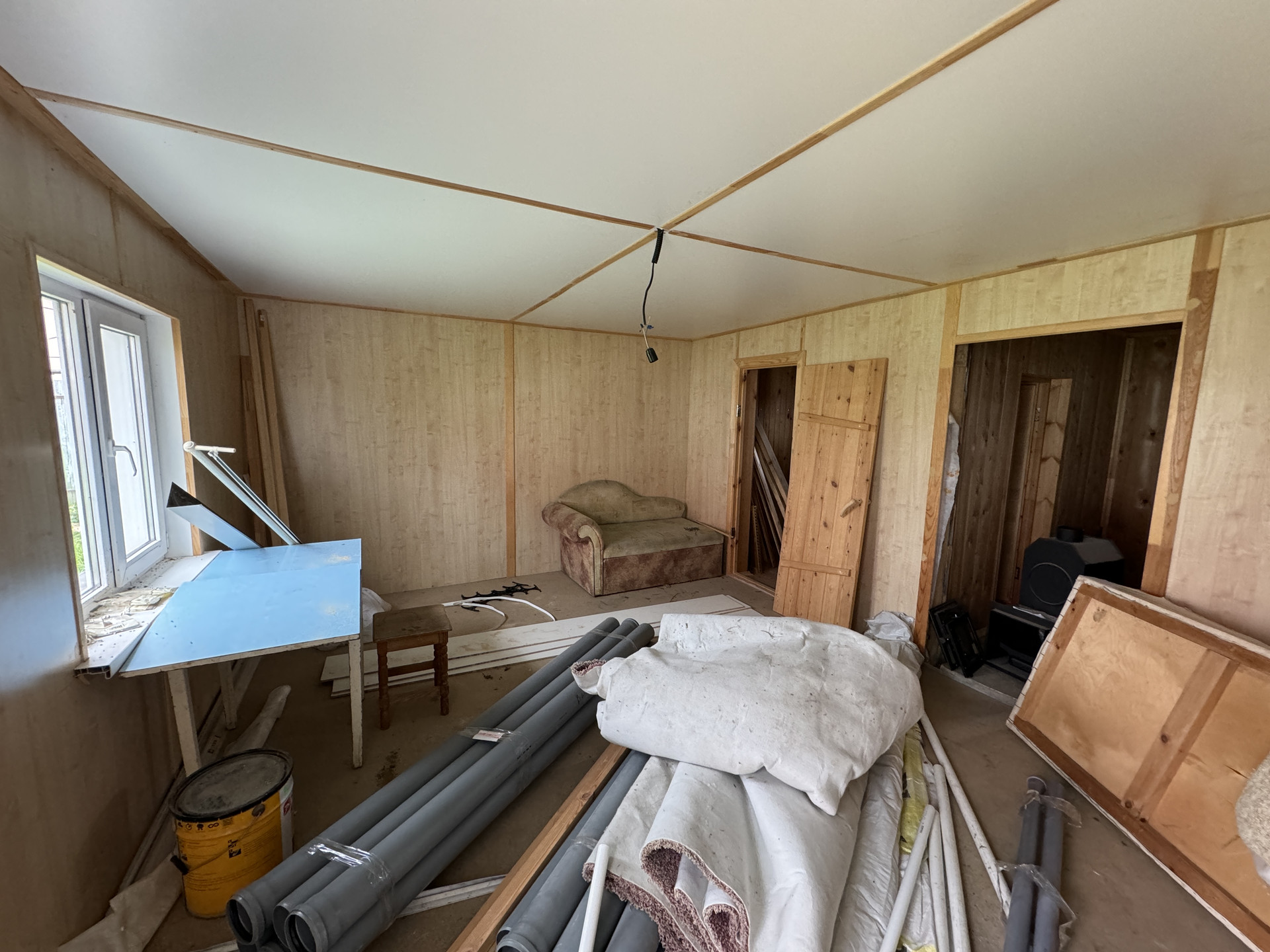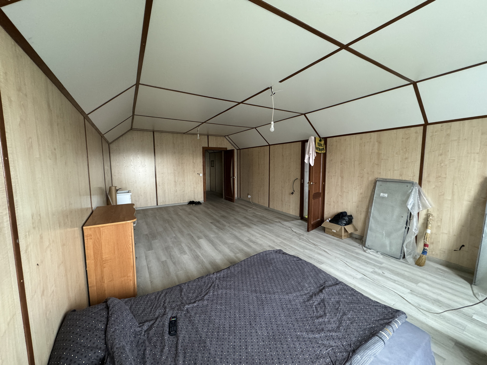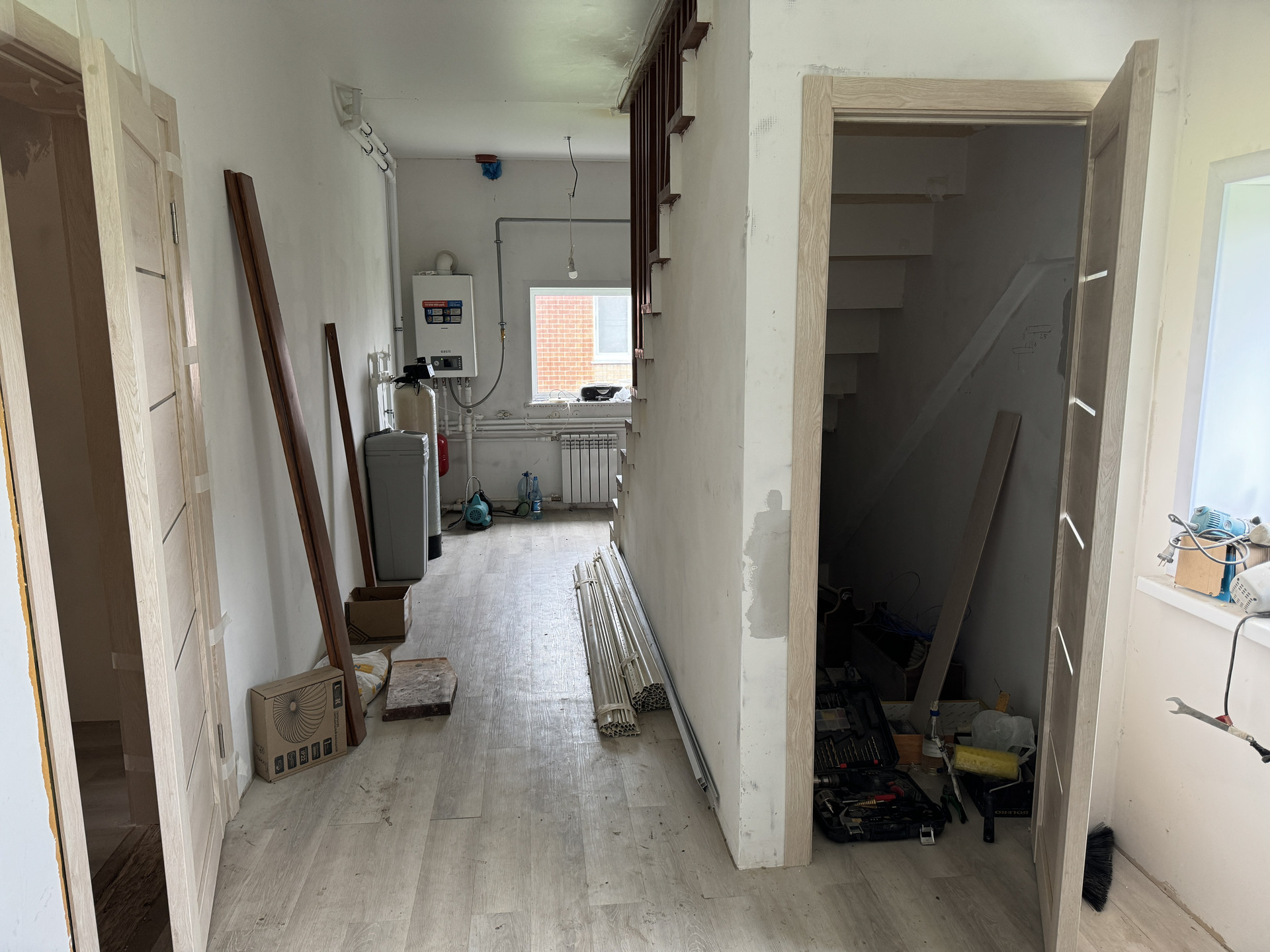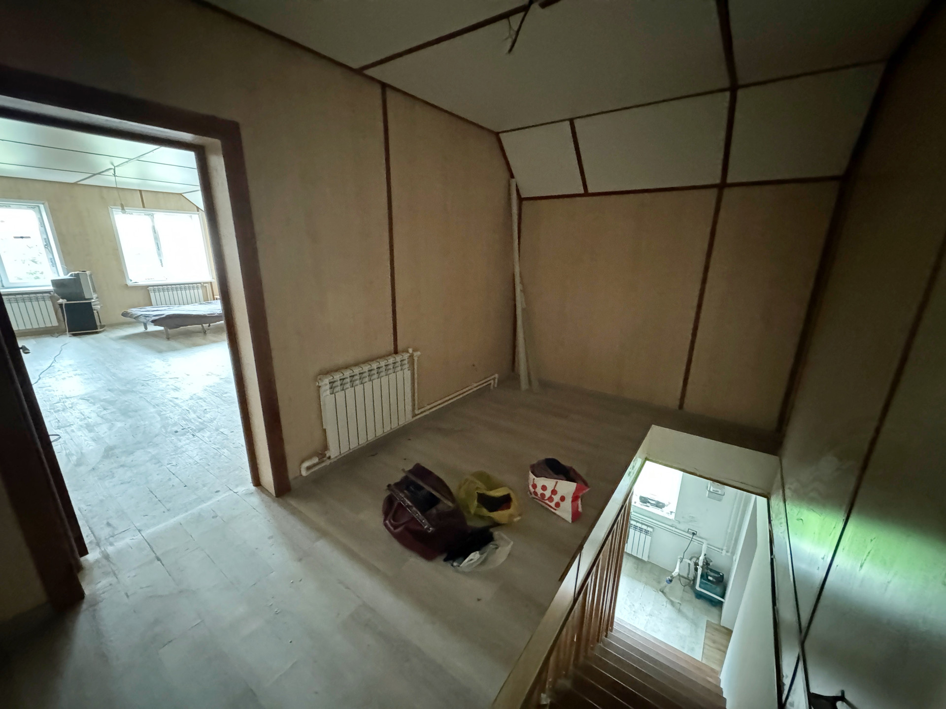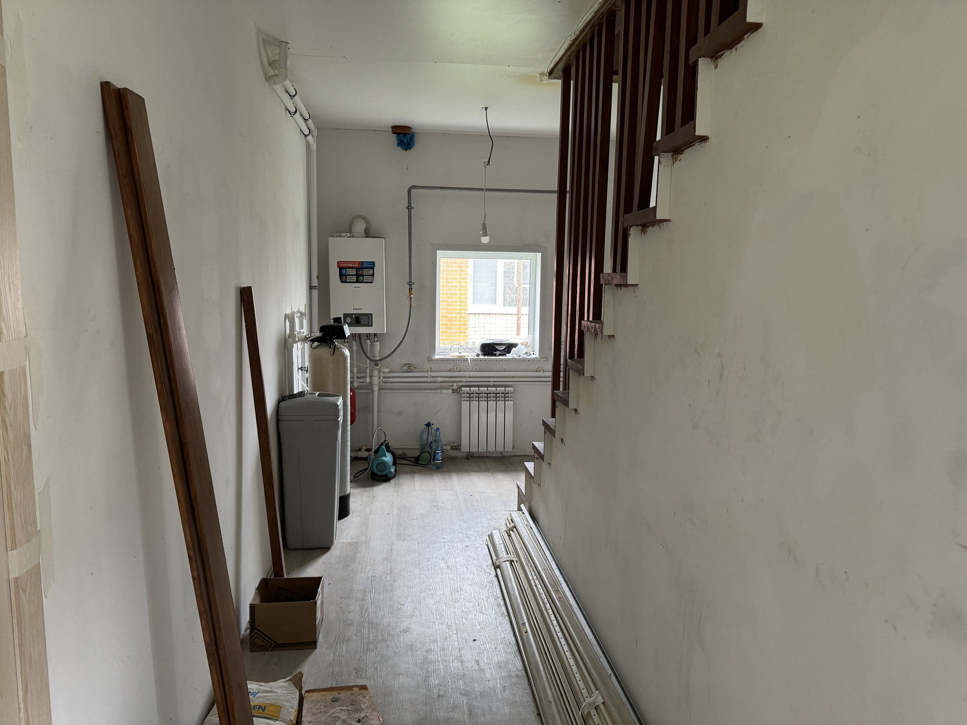 На 2 этаже комната свободной планировки, по желанию можно разделить на 2 комнаты, сан узел.  в коридоре установлен газовый котел и система очистки, которая легко прячется, если оборудовать шкаф.