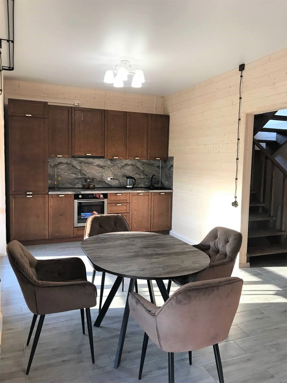 — Смонтирован натяжные потолки на первом этаже;