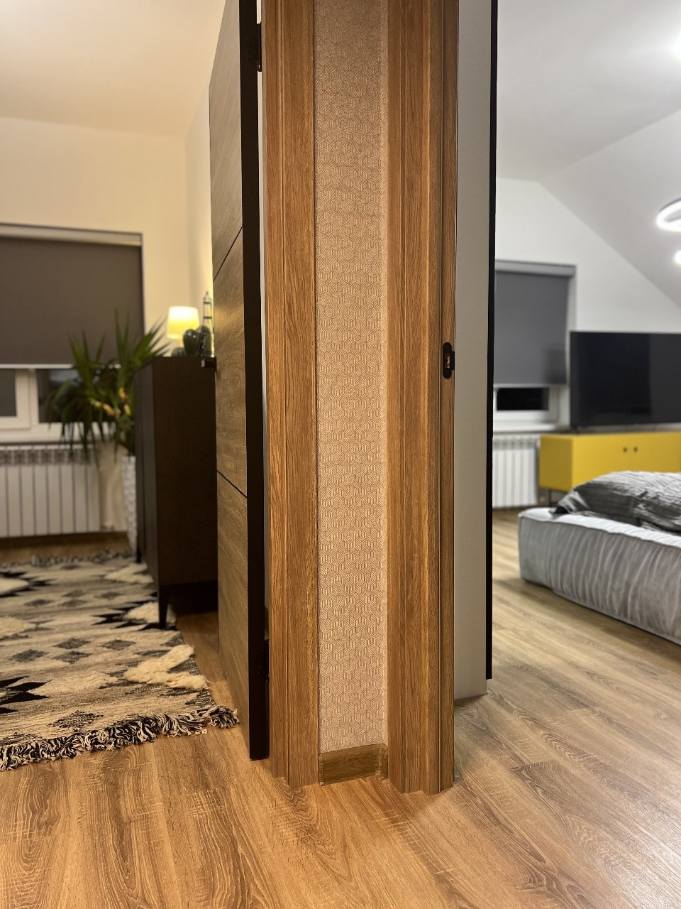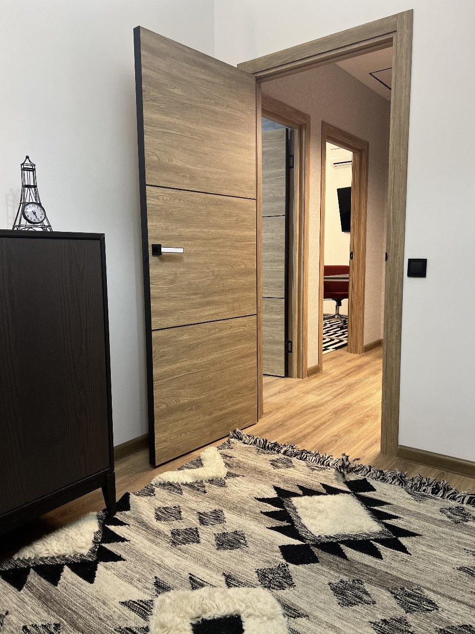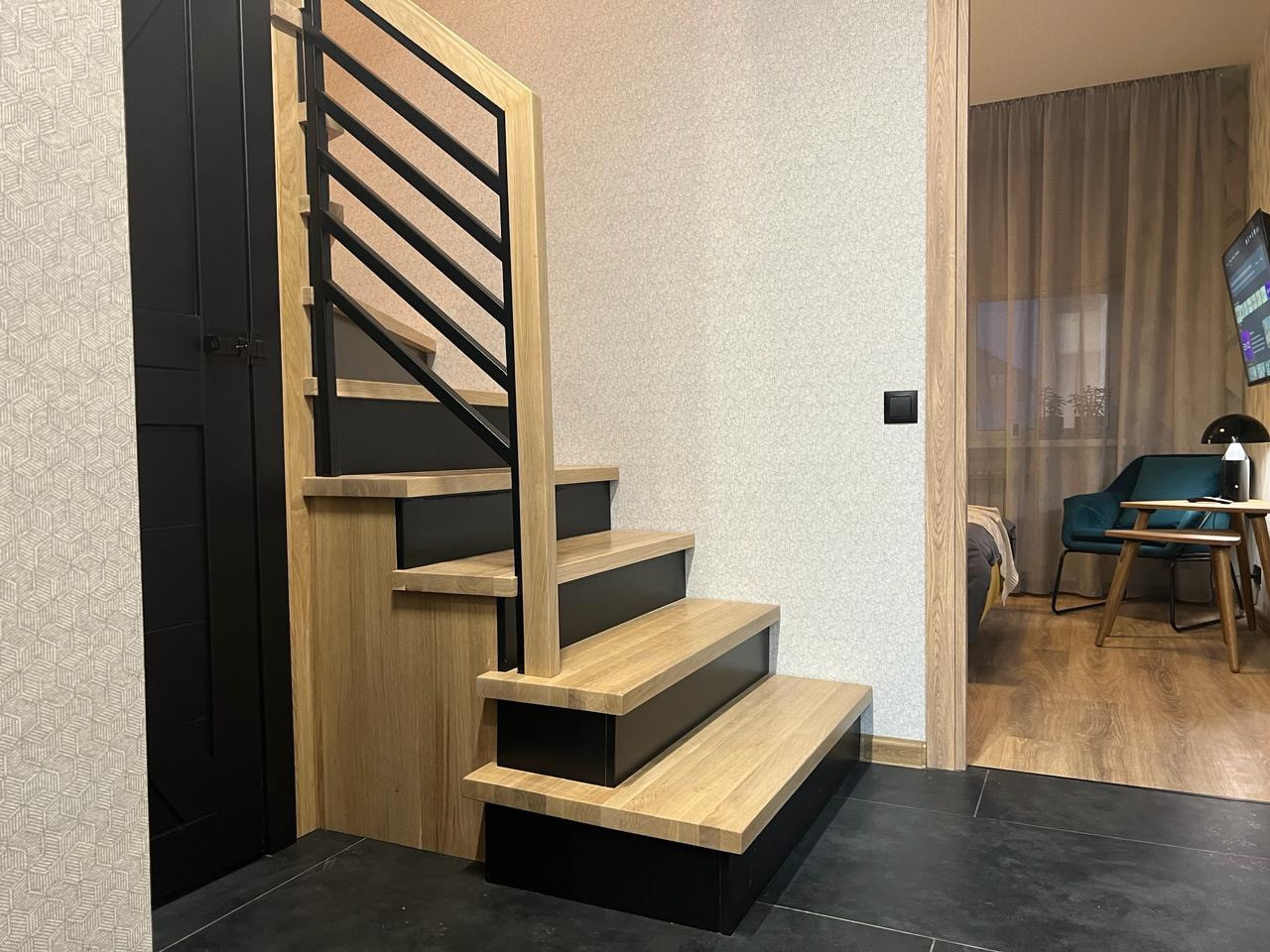 Установлена входная дверь с терморазрывом, инверторные кондиционеры, теплые полы на первом этаже, в том числе на террасе и в санузле второго этажа. Имеются две стиральные машины с функцией сушки: в бойлере на первом этаже и в санузле на втором этаже. На кухне установлена посудомоечная машина. Лестница из металлокаркаса с цельноламельным дубом. Вся техника марки Haier.