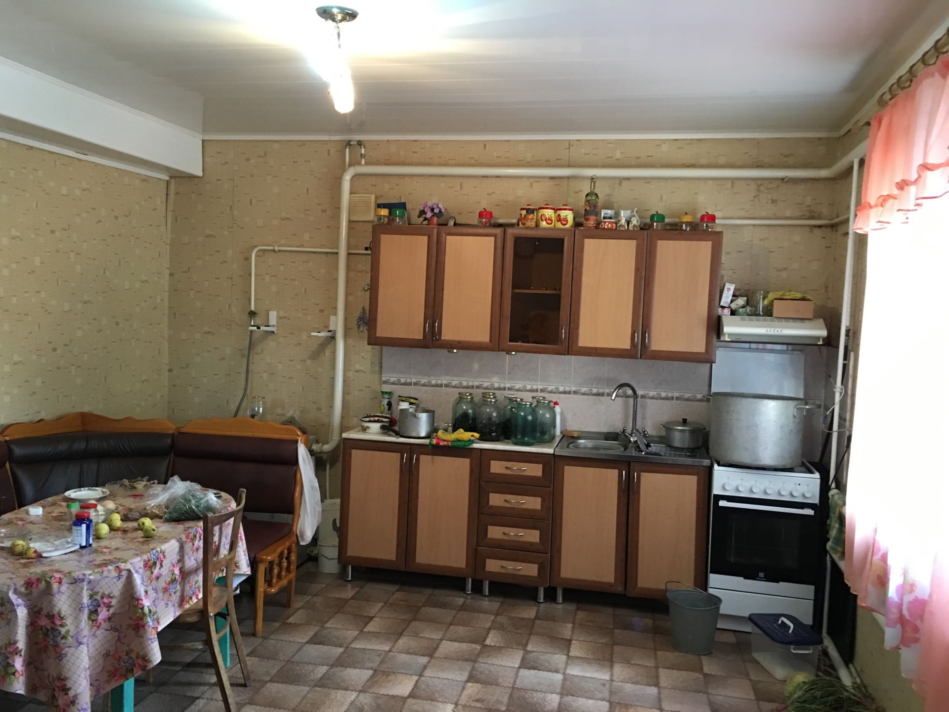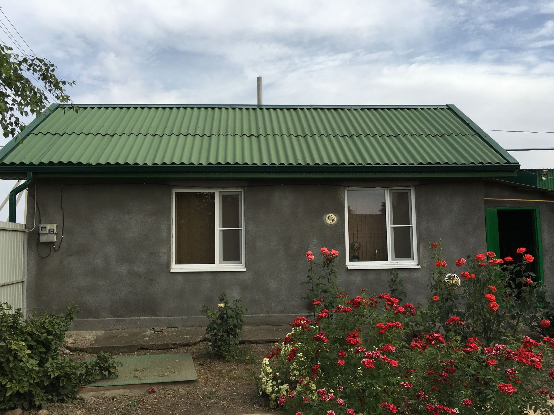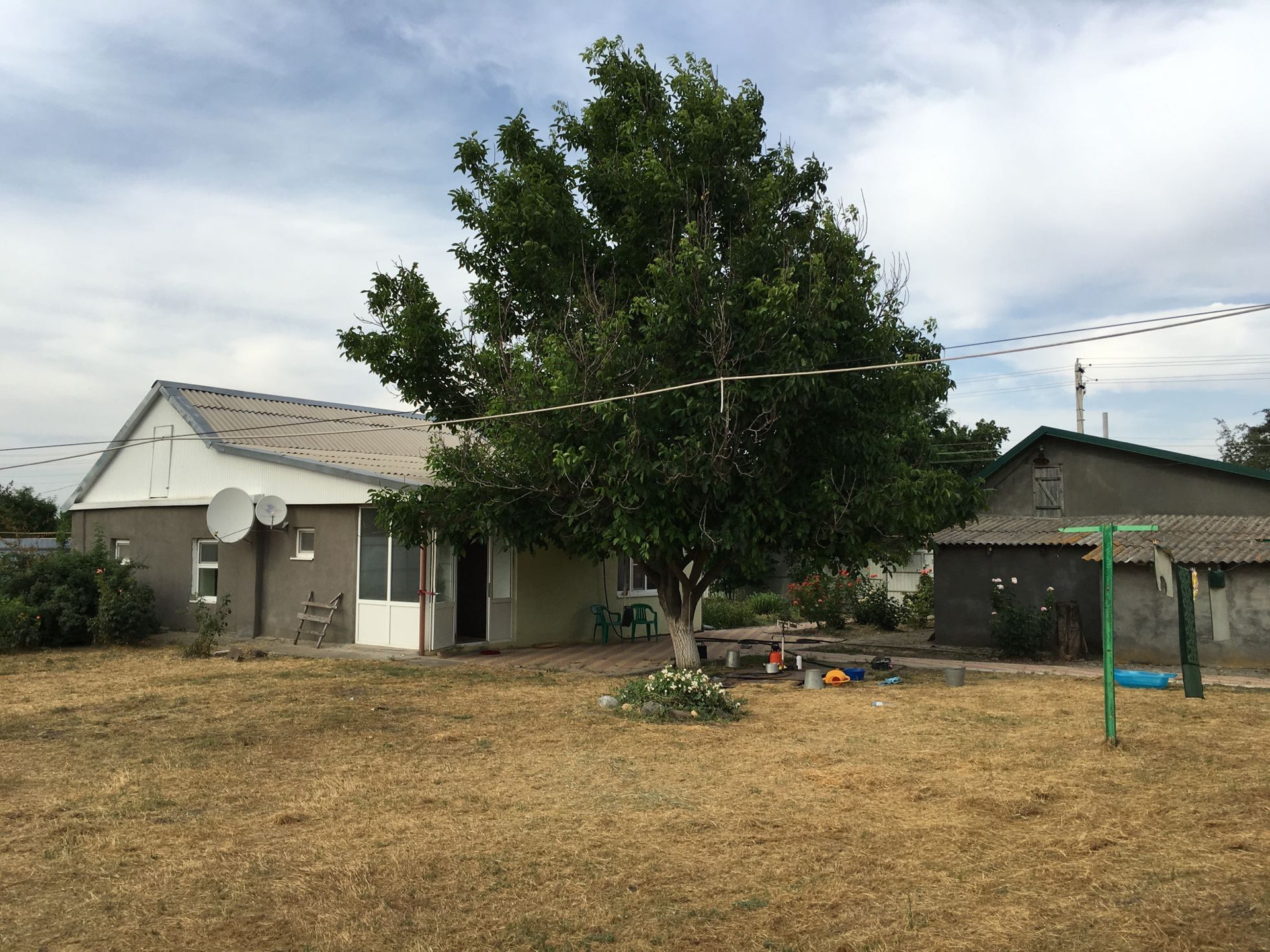 Дом саман теплый обложен кирпичом и внешняя отделка штукатурка с покраской. Кухня 18 кв м и ванна с туалетом 9 кв м кв пристроенные из кирпича. Все окна металопластиковые,  при входе в дом веранда стеклянная из металопластика. Полы деревянные. Все удобства.