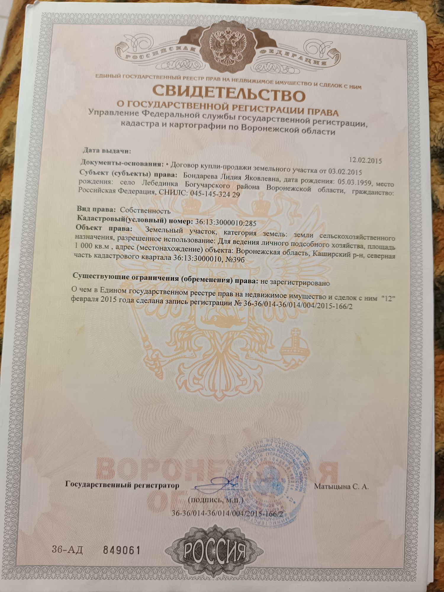 Имеются все коммуникации по улице, газ, вода электроэнергия. Категория земель: Земли населённых пунктов. Виды разрешённого использования: Для ведения личного подсобного хозяйства.
