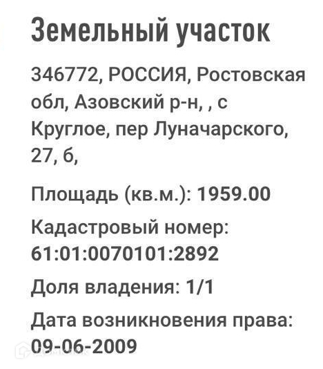 Кадастровый номер участка 61:01:0070101:2892