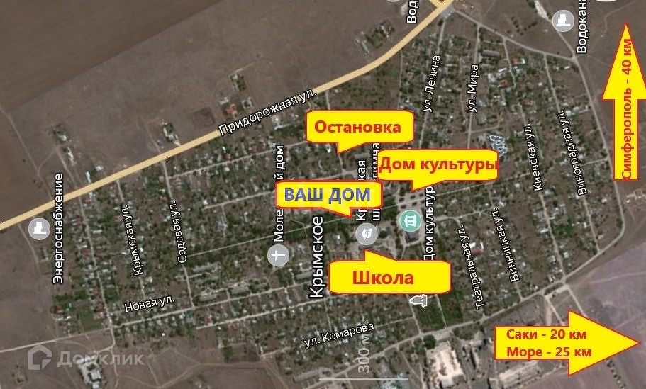 Дом находится в центре поселка Крымское: школа - 50 метров, детский сад, магазины, аптека, дворец культуры, церковь в радиусе 300 метров.