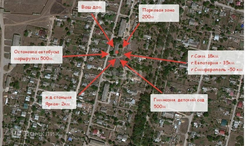 Село Крымское - находится в 17 км от г. Саки, хорошая транспортная развязка, в 2х км. от станции жд. Яркая