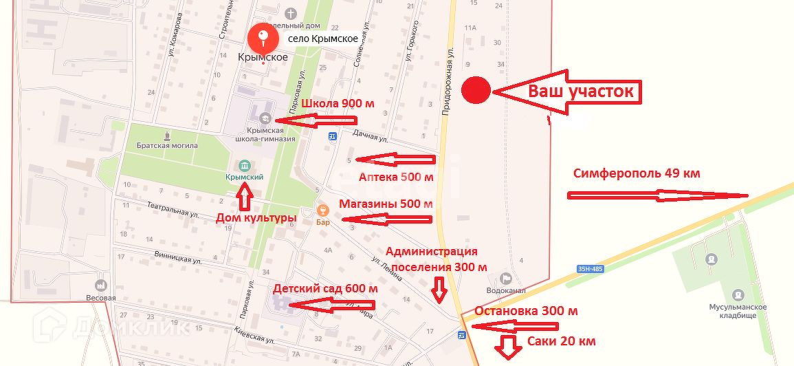 До города Саки 20 км, ходит общественный транспорт с удобным графиком движения. До г. Симферополя 49 км.
