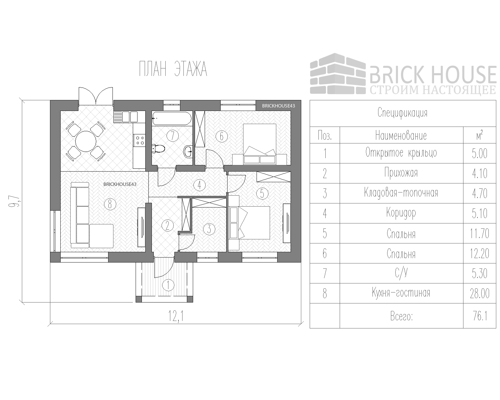 Габаритные размеры дома: 9,7 х 12,1 метров, что делает его прекрасным вариантом для строительства даже на небольшом участке.