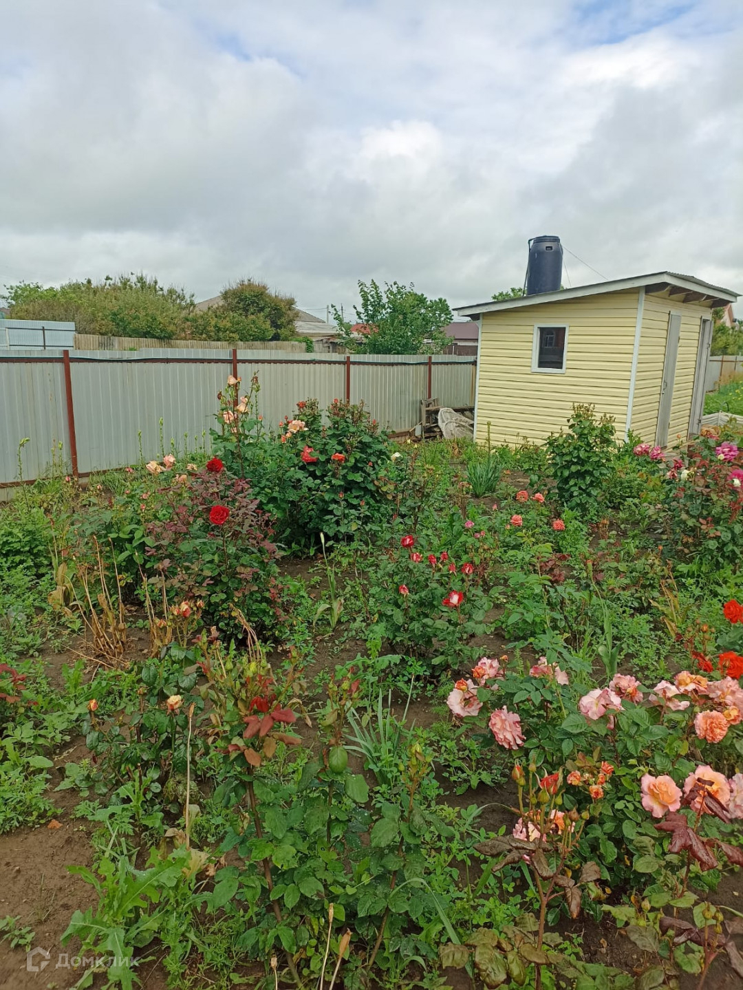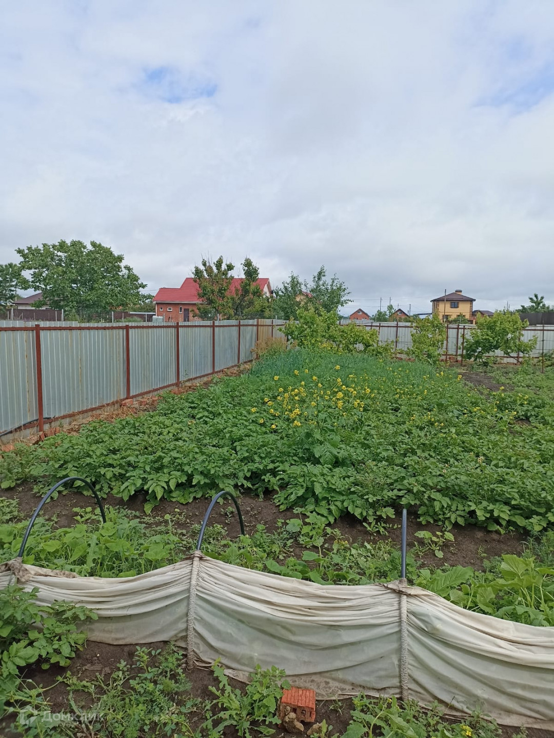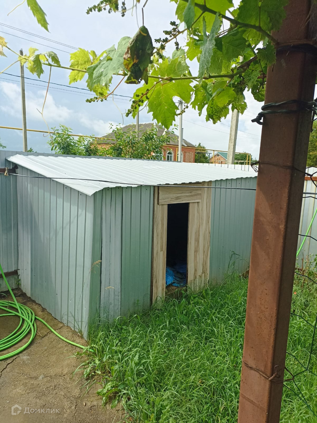Во дворе есть навес, беседка, летний душ. Участок огорожен забором из металлопрофиля.