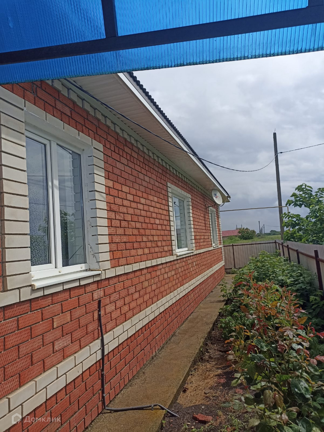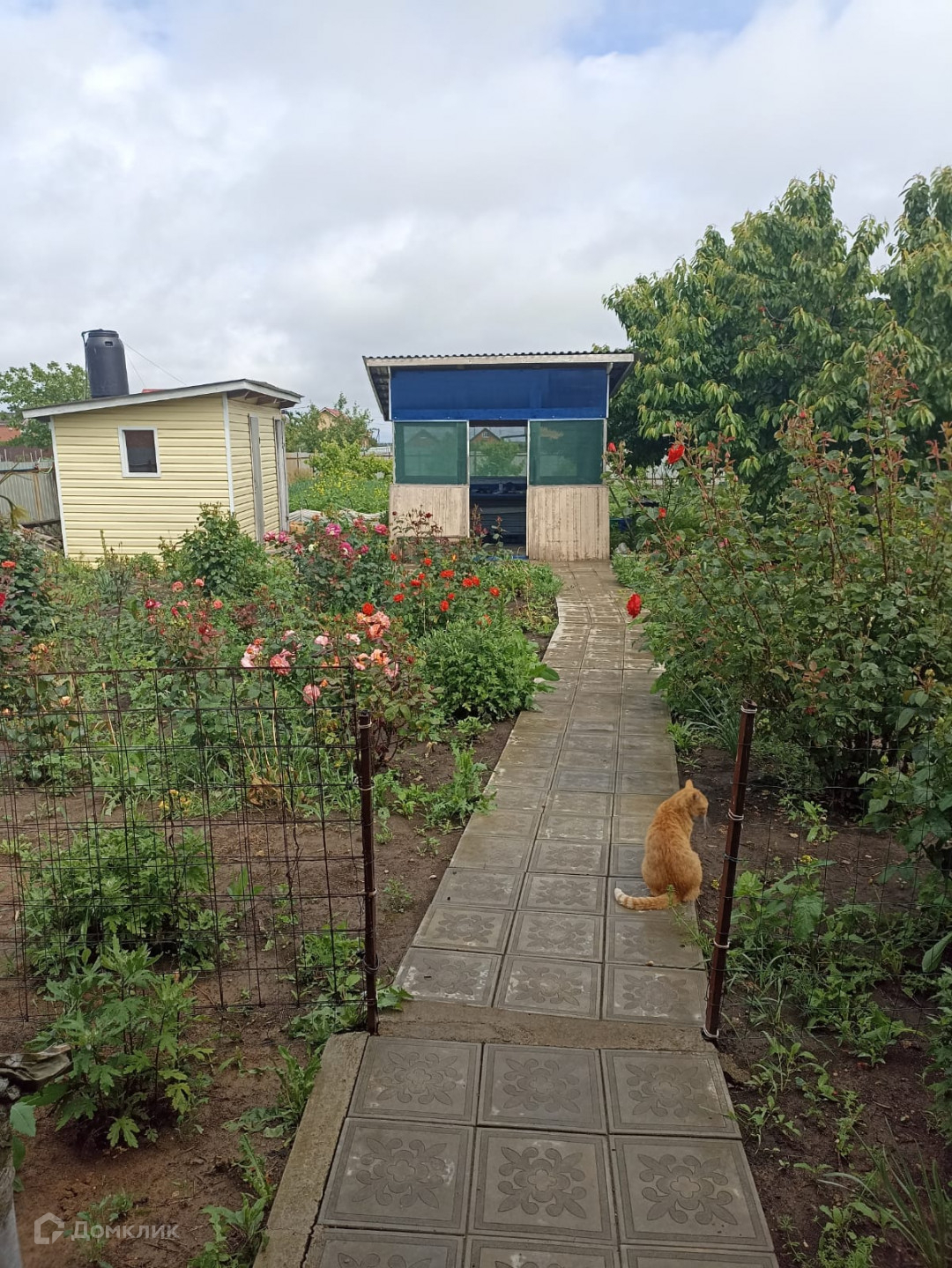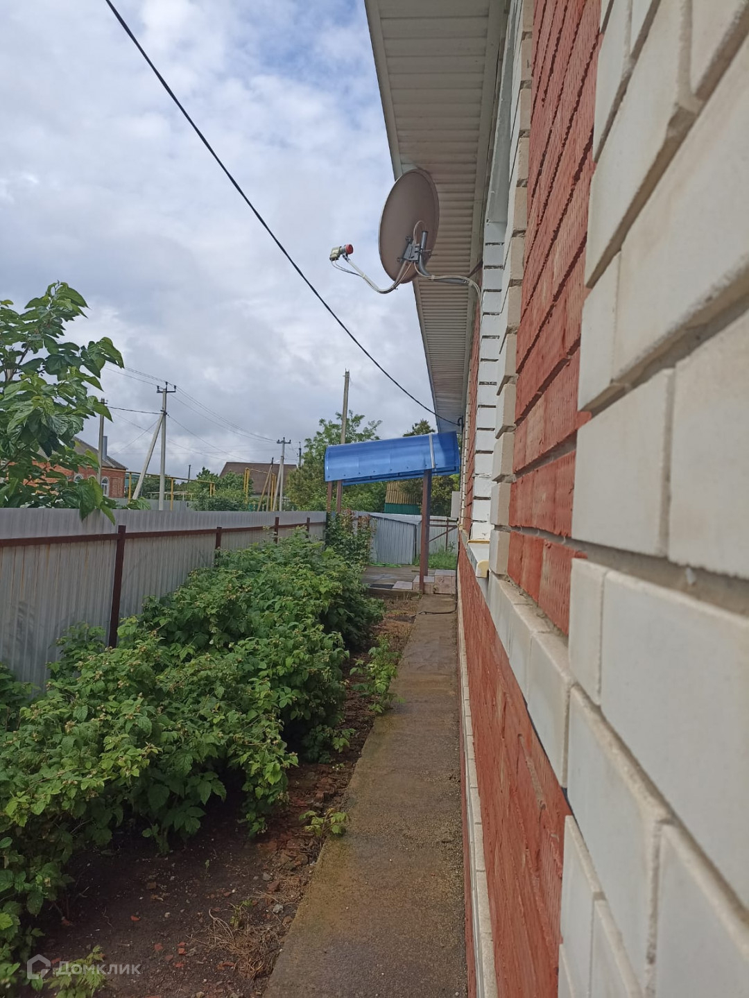 Во дворе есть навес, беседка, летний душ. Участок огорожен забором из металлопрофиля.