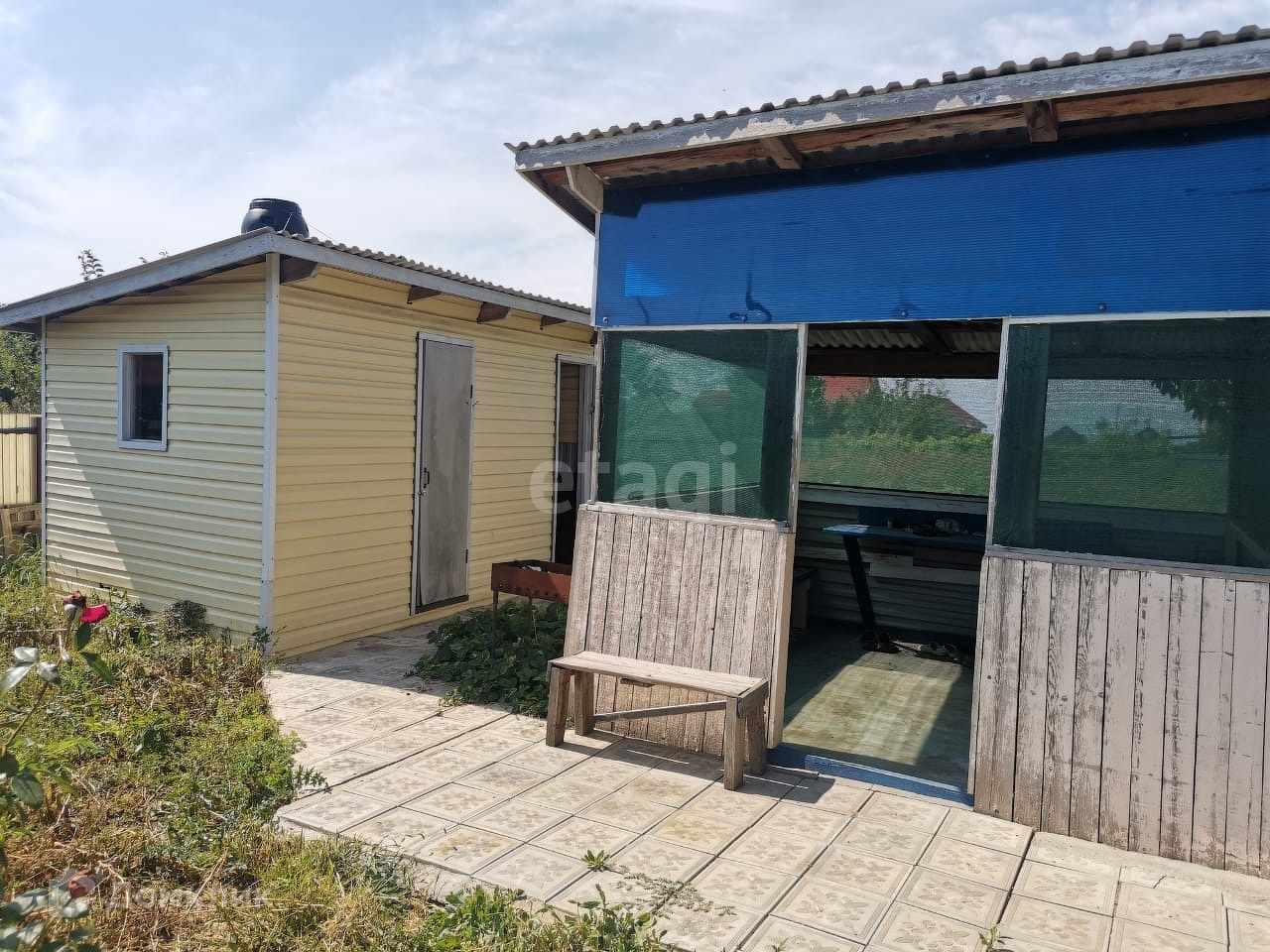 Участок занимает 14 соток. Имеются насаждения. На территории стоят хозпостройки, беседка. Перед домом есть навес для машин.
