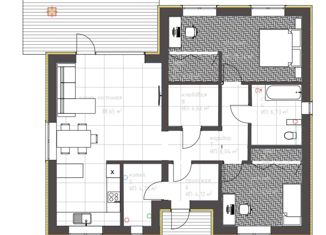 Этот проект классического одноэтажного дома однозначно универсален: он может быть возведён как загородный дом выходного дня так и в качестве дома для постоянного проживания. Планировка дома – простая, но в то же время очень удобная. На жилой площади в 66,24 м2 разместились кухня-гостиная, 2 весьма не маленьких спальни, сан. узел и даже отдельная кладова... |