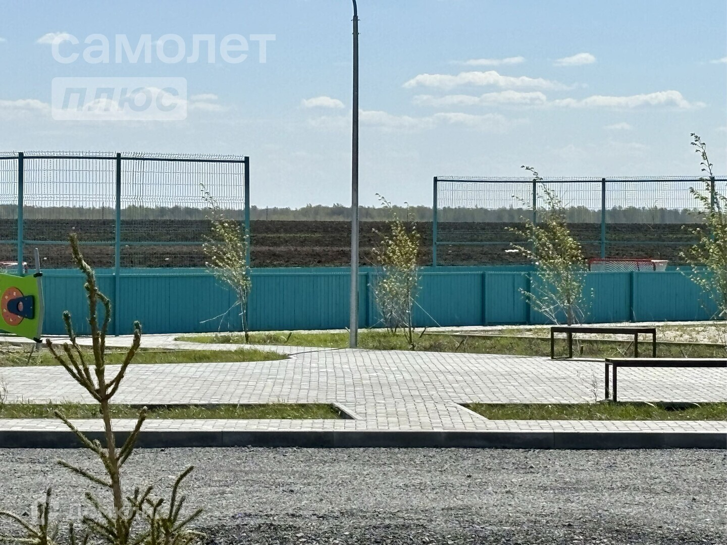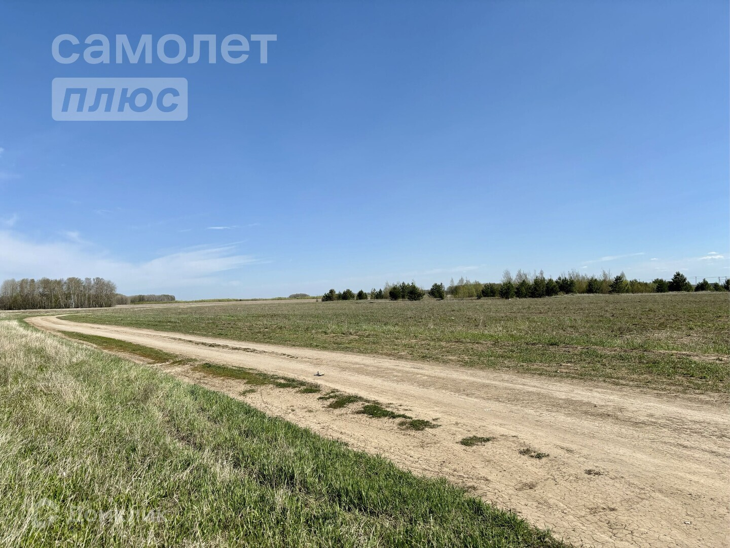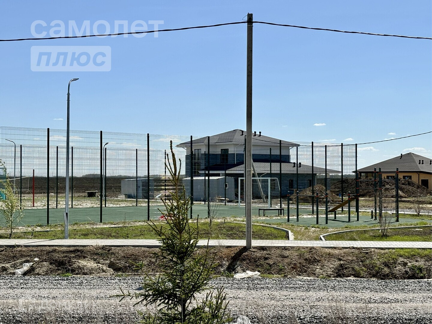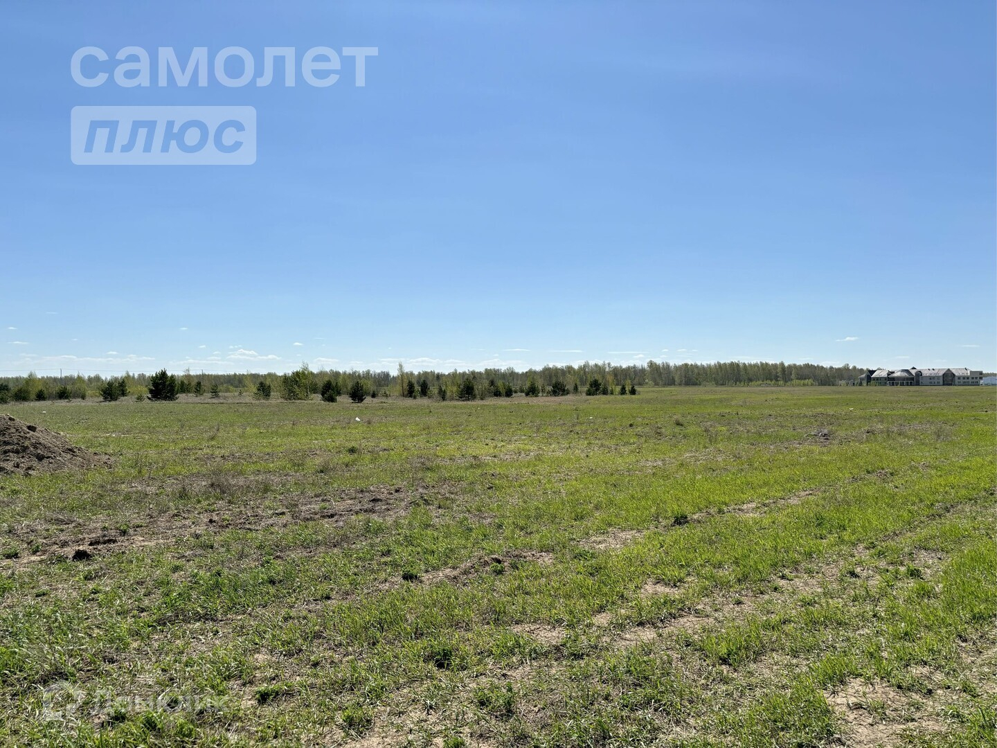Участок размером 8 соток огорожен забором. На участке растут сосны. Территория ровная и ухоженная.
